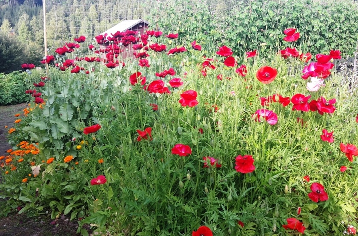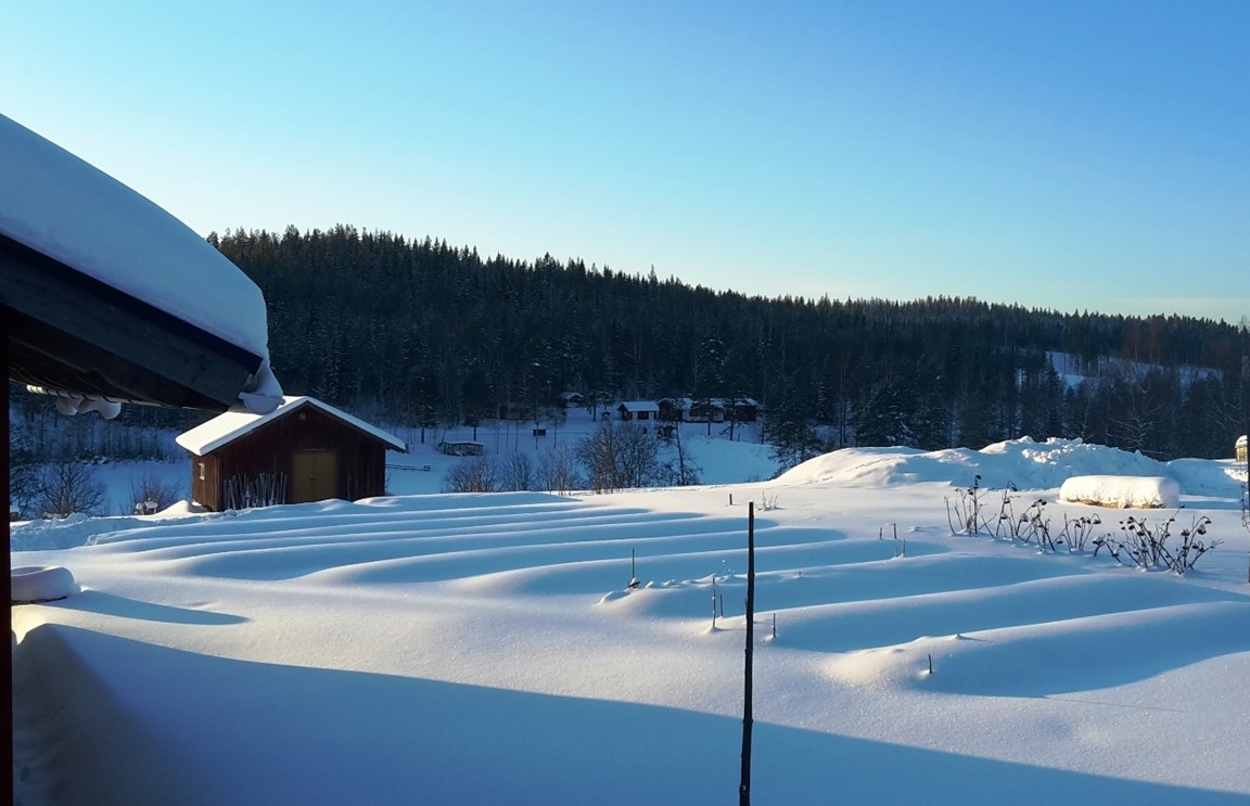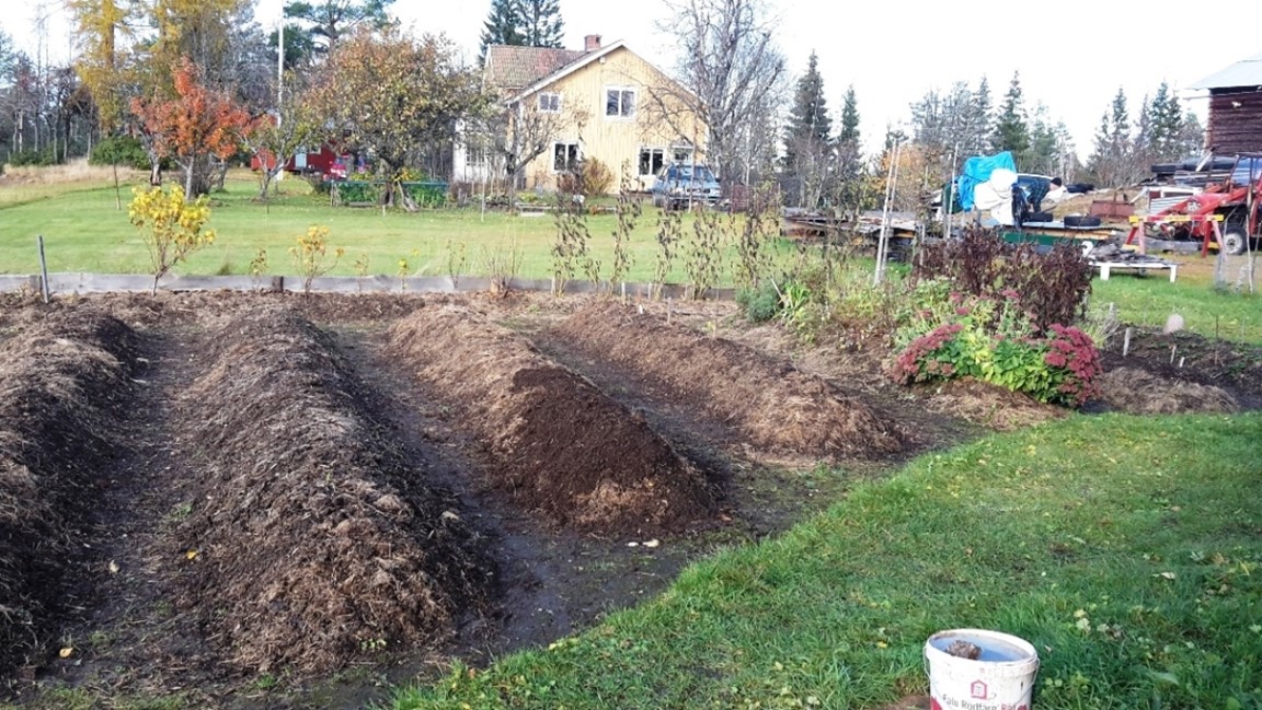 2016, ett halvår efter att jag slagit mig ner i byn efter en mycket lång utlandsvistelse, började jag anlägga trädgården. Det första jag gjorde var att gräva upp ett litet område för potatis- och grönsaksodling. Idag, sex år senare, har trädgården vuxit till ca 250 kvadratmeter, och allt är anlagt med enkla handverktyg. Ungefär halva trädgården består av upphöjda bäddar, och den andra av plan mark. Som gammal "gröna vågare" ägnar jag mig huvudsakligen åt självhushållning i trädgården, där de ätliga växterna dominerar även om jag också odlar en del blommor. Jag har planterat bärbuskar och perenner som örter, jordgubbar och sparris. I ett närliggande område har jag planterat fruktträd och hassel.