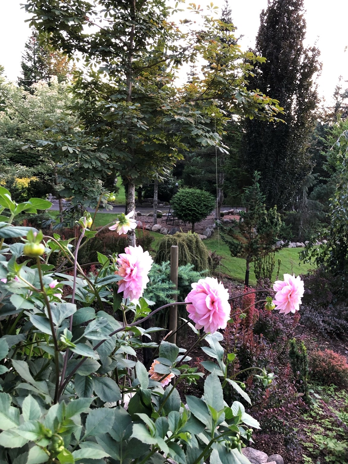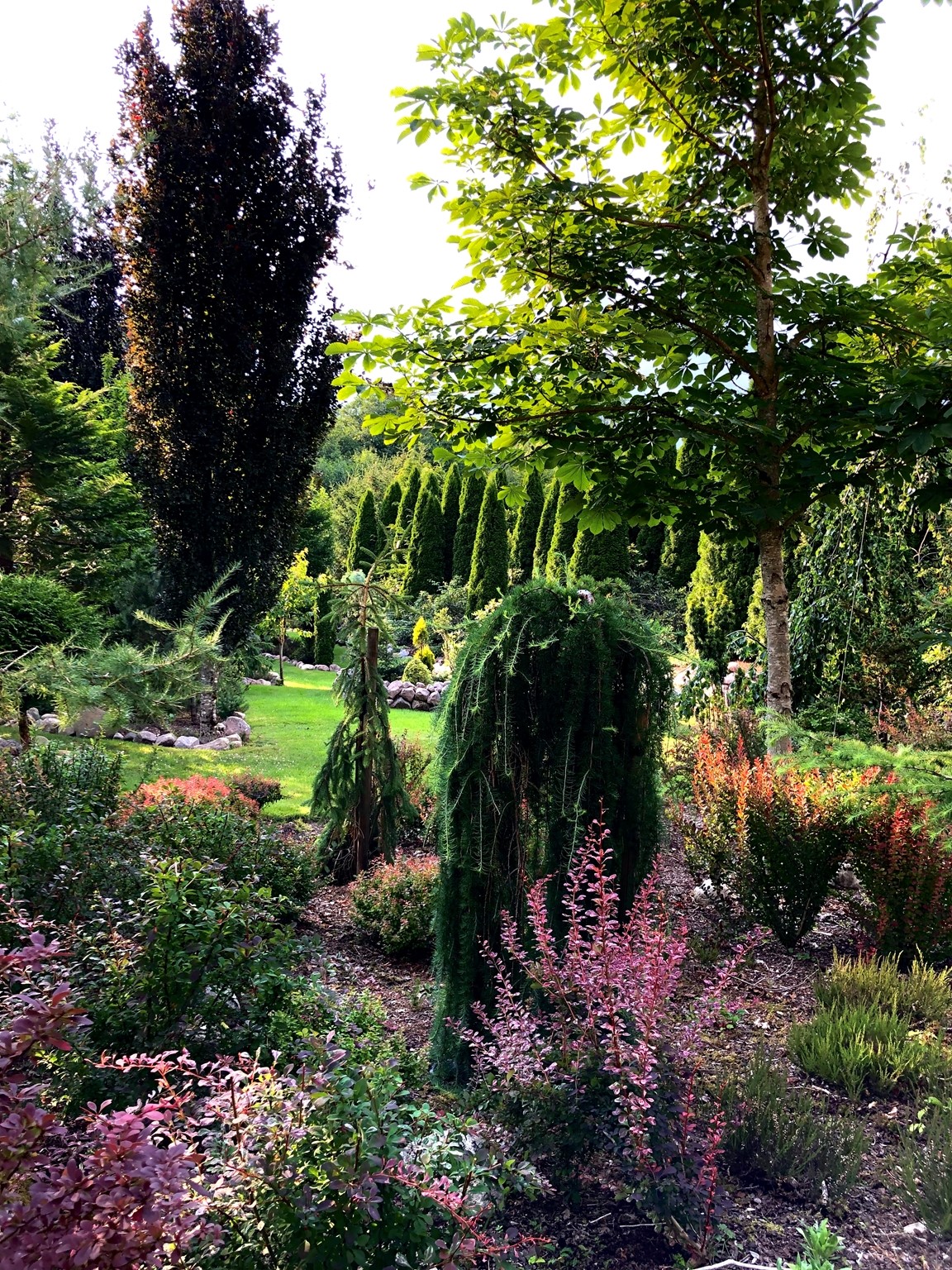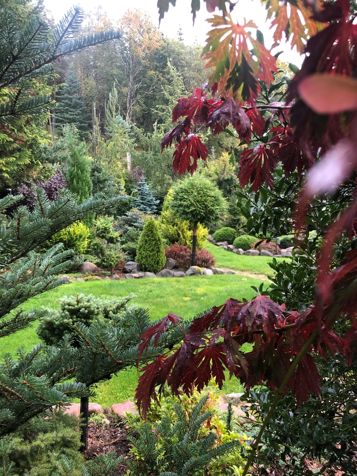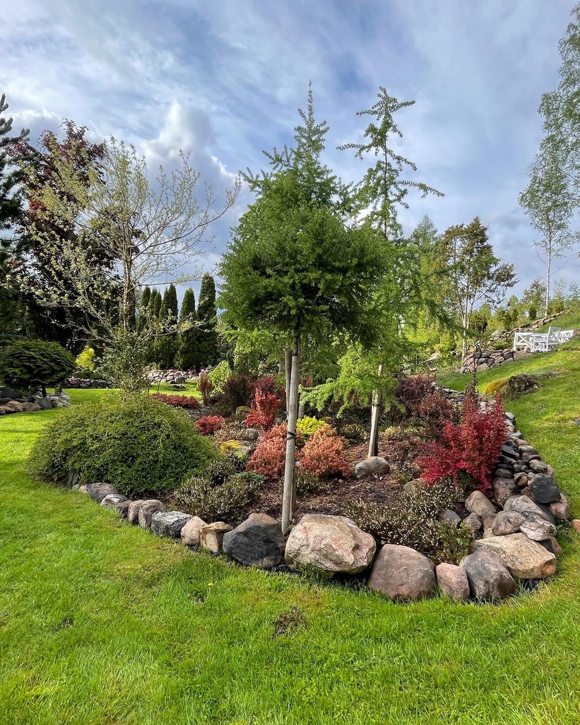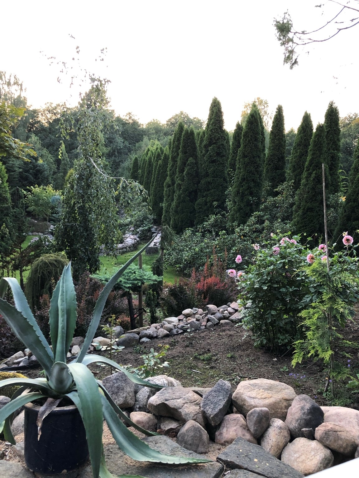 En trädgård med många barrväxter och mycket sten.