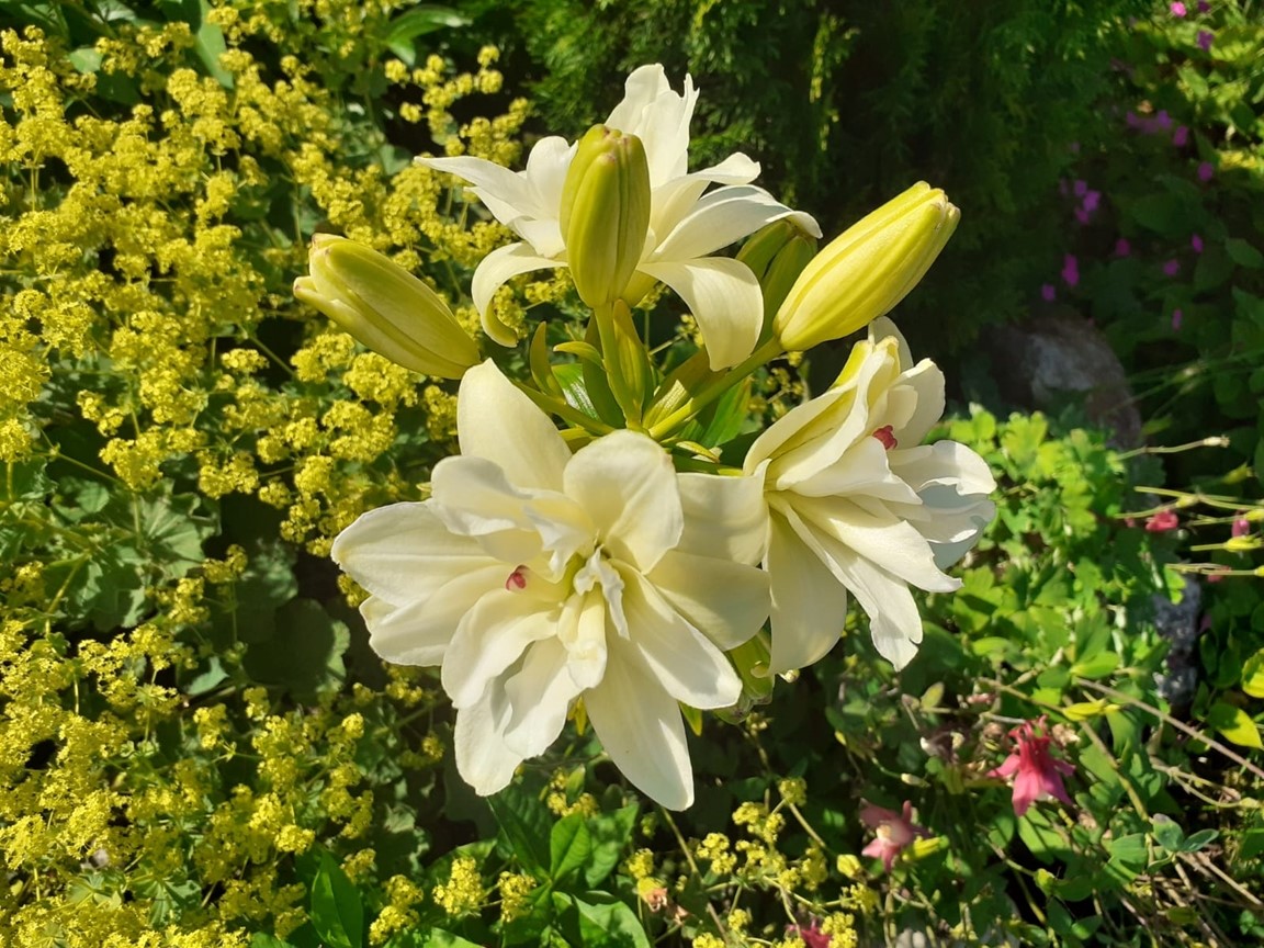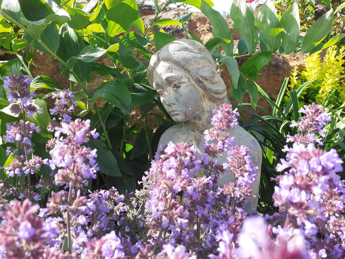 Trädgårdengåri en romantisk, lantlig stil med klassiska "mormors-blommor", rosor och pioner, men med vissa inslag av modernare växter och färgkombinationer. Sten i alla dess former och storlekar går som en röd tråd genom trädgården. I rabatterna samsas också kirskål, kvickrot och barnens leksakstraktorer, men vad gör det - trädgården är ju till för alla.