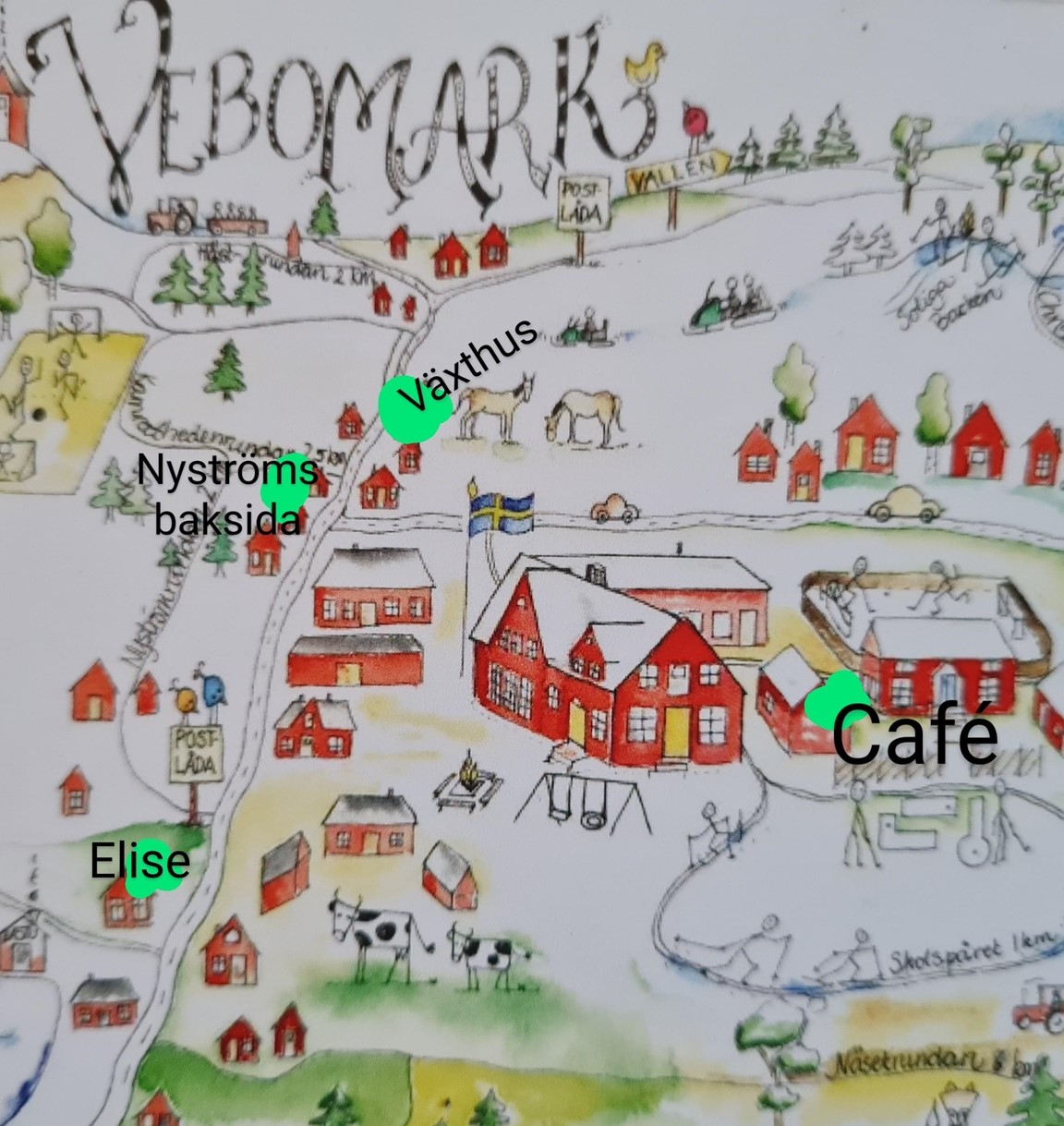 Vid kaffesug rekommenderas ett besök på "Olgas café" på Lundbergska gården, intill byns friskola. Öppet 11-16. Kontanter och Swish.
