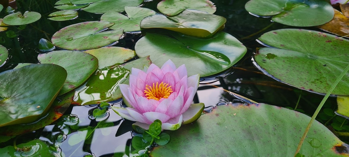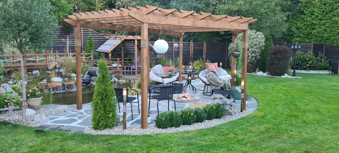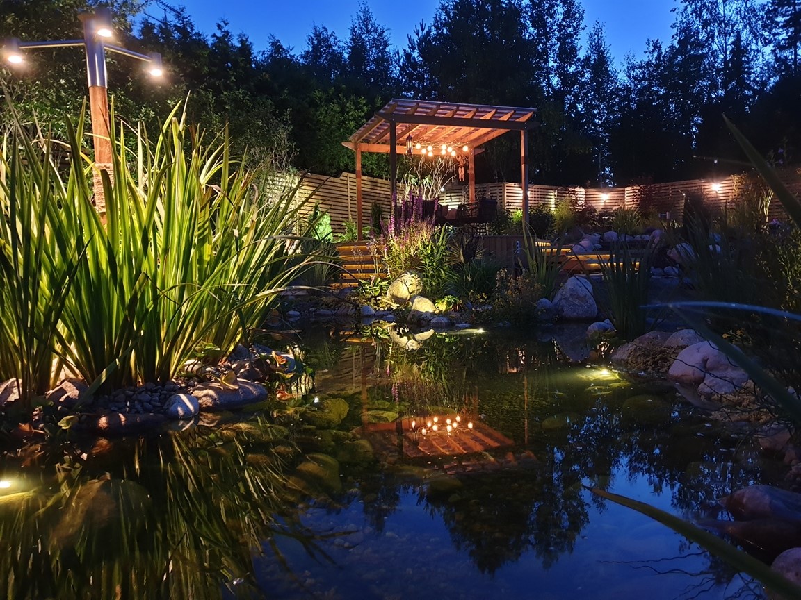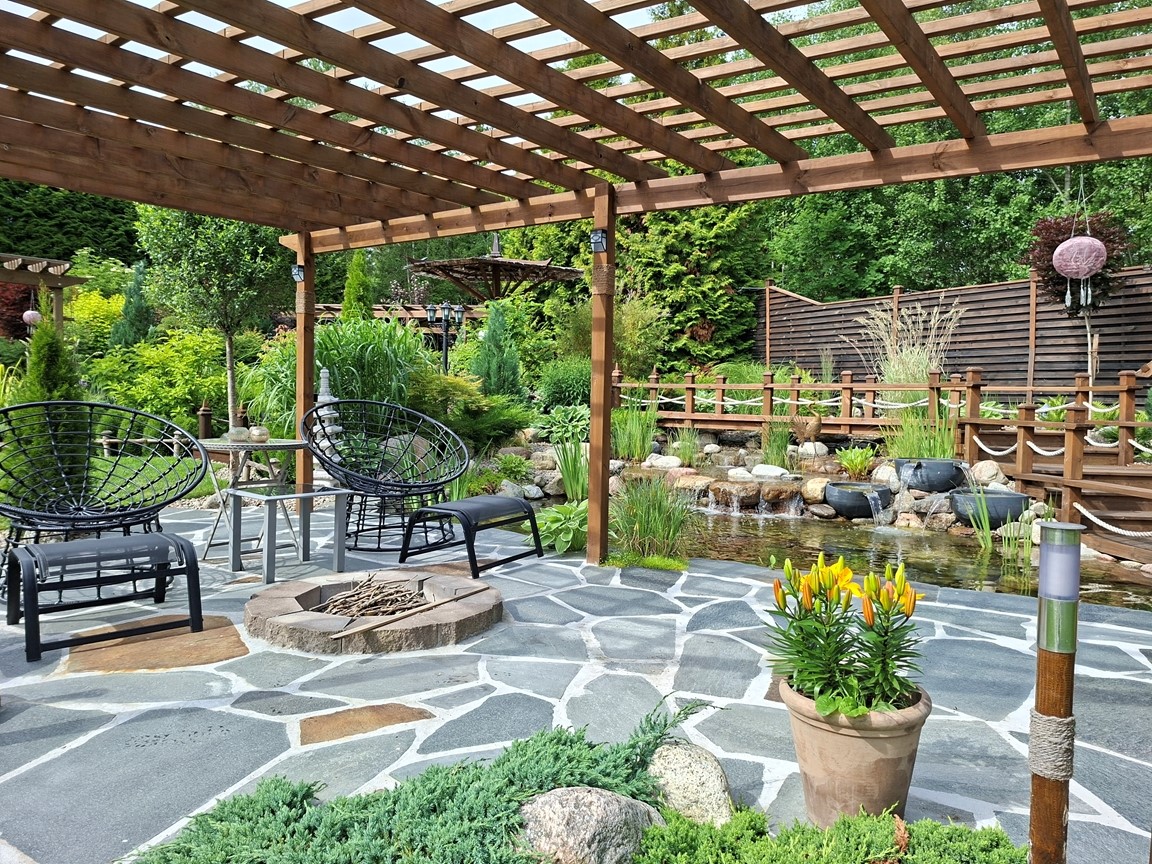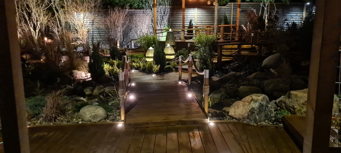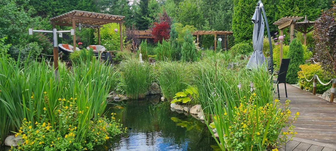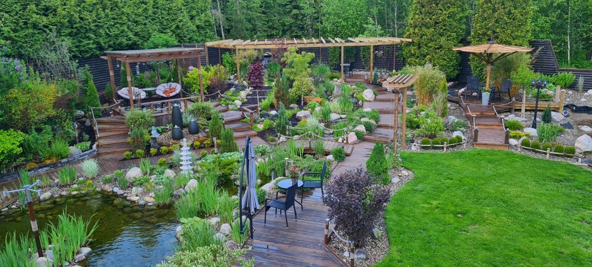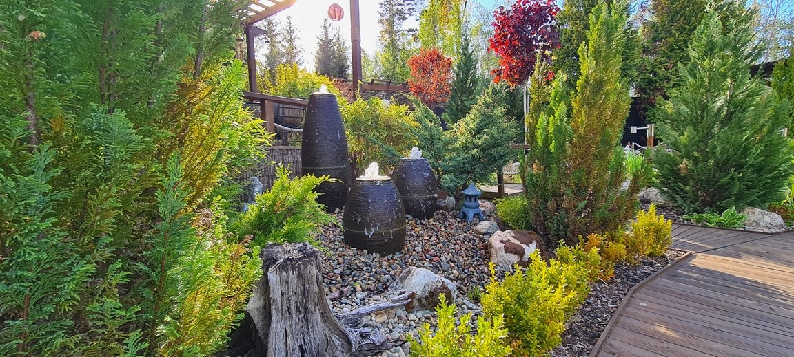 En vattenträdgård med inspiration från en rad olika trädgårdsarkitekturer men med en tydlig Japansk touch. Med vattnet i centrum kan man här spatsera runt bland dammar, vattenfall, porlande bäck, spångar, trappor och broar samt pergolas samt olika träkonstruktioner. Stanna gärna upp en stund och ta en paus vid någon rastplats som finns i alla väderstreck och beskåda fiskar som koikarp, guldid, och guldfiskar, vattenfontäner, växter, buskar och träd samt bladverk som harmoniserar och skapar ett djup med en bred färgpalett i gröna kulörer, allt i ett härligt ljud av porlande vatten.