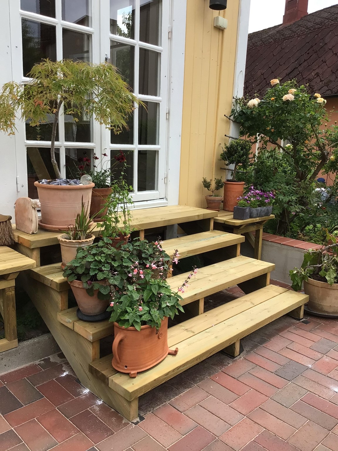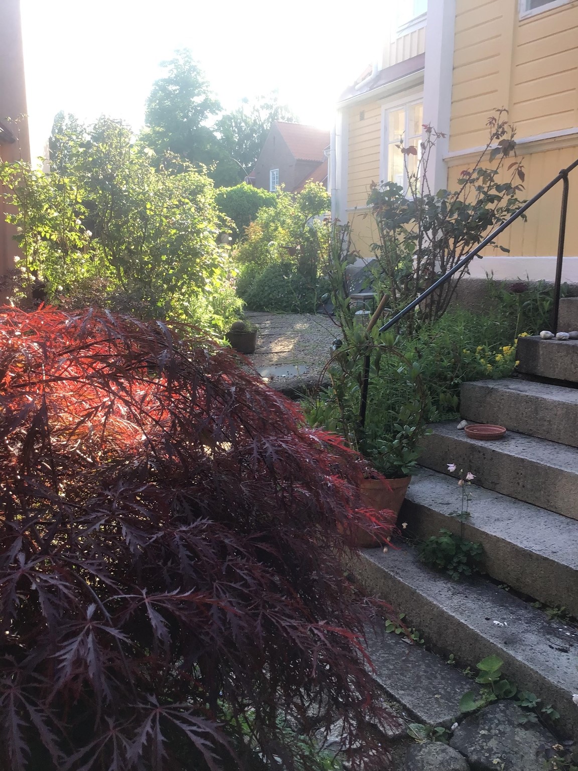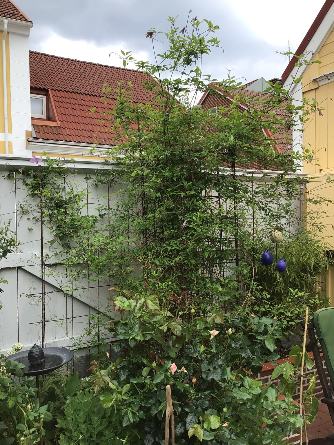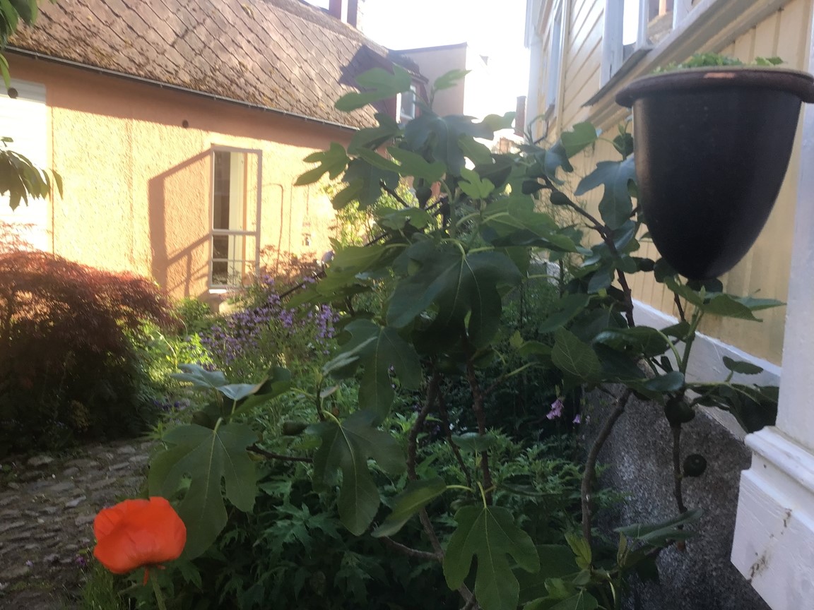 Bakom planket intill det gamla huset finns en liten trädgård. Här finns plats för vila och inspiration. Inga räta rader och det är definitivt inte ogräsfritt här. Jag älskar blommor. Det finns ingen röd tråd när det gäller val av växter. men jag har oftast en "relation" med växterna annars fungerar det inte.  Jag går mest på  känsla. Det ska  dofta och vara vackert. Fikon, blåregn akebia, blyblommor, en bouganvillea som är över 30 år trivs bra här.