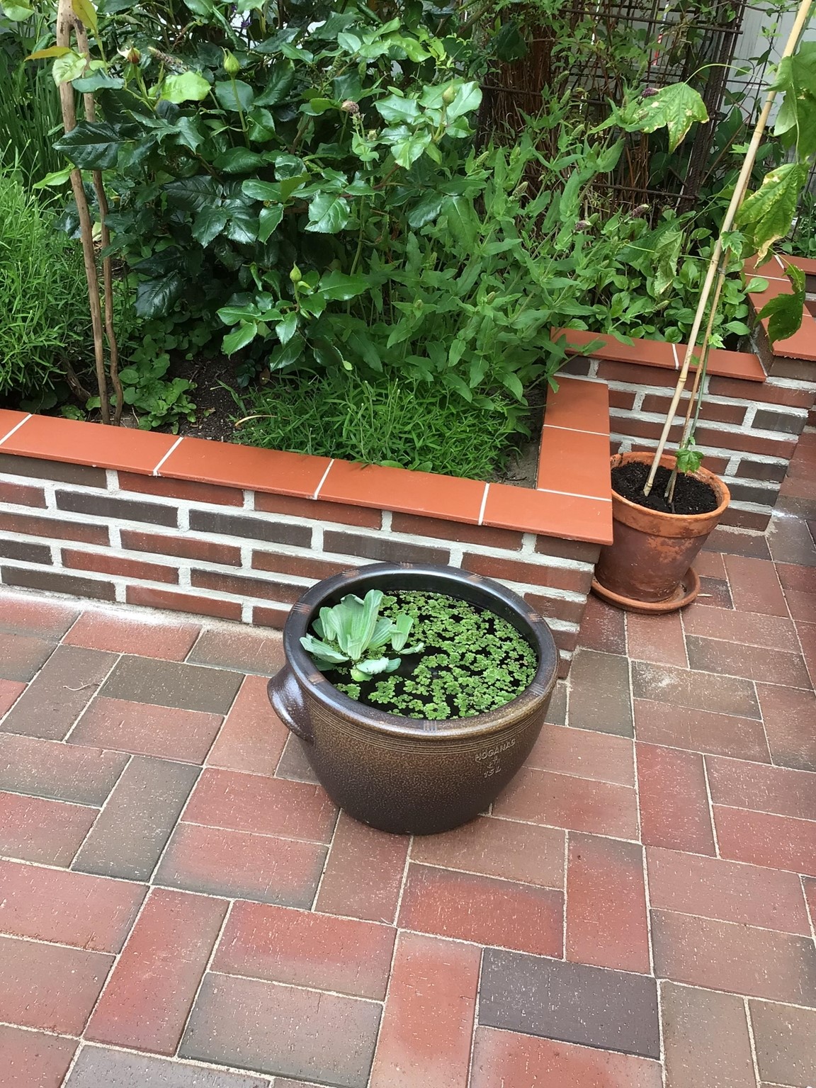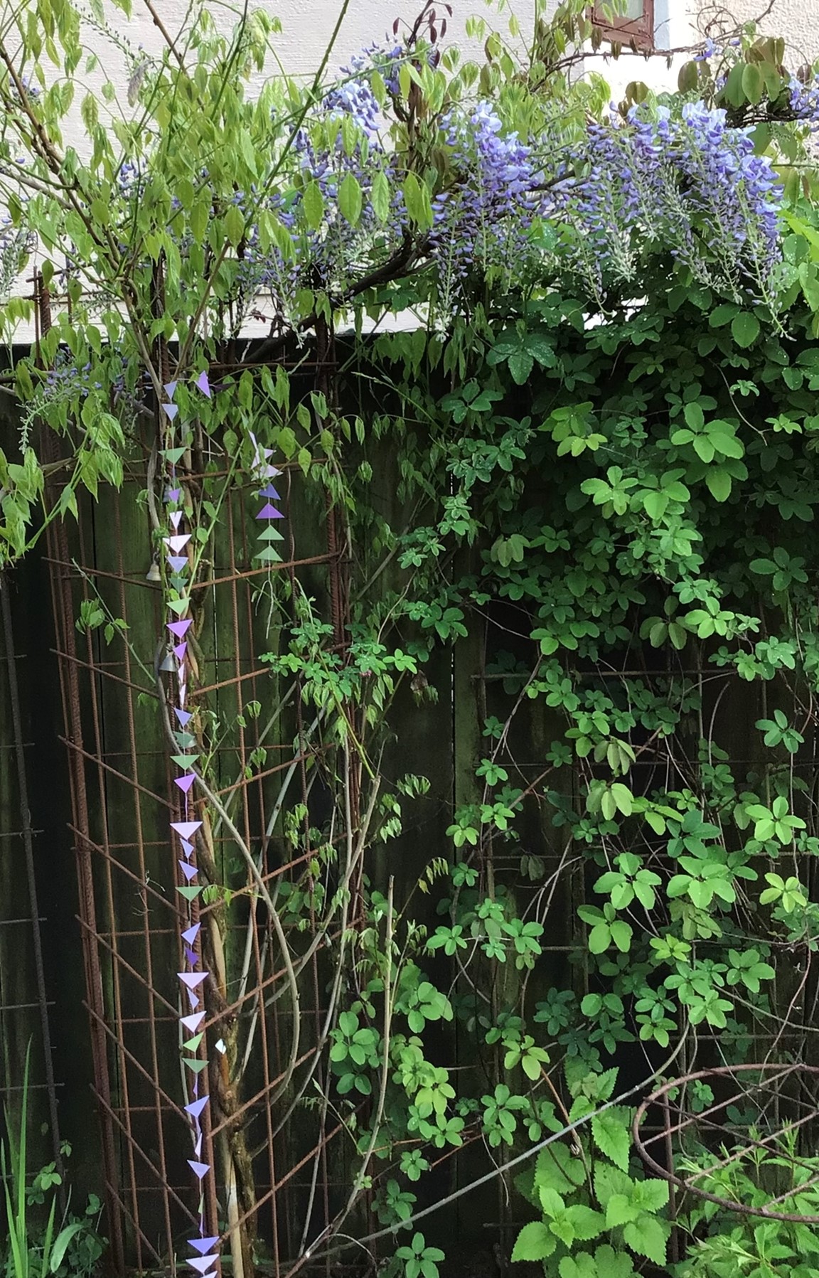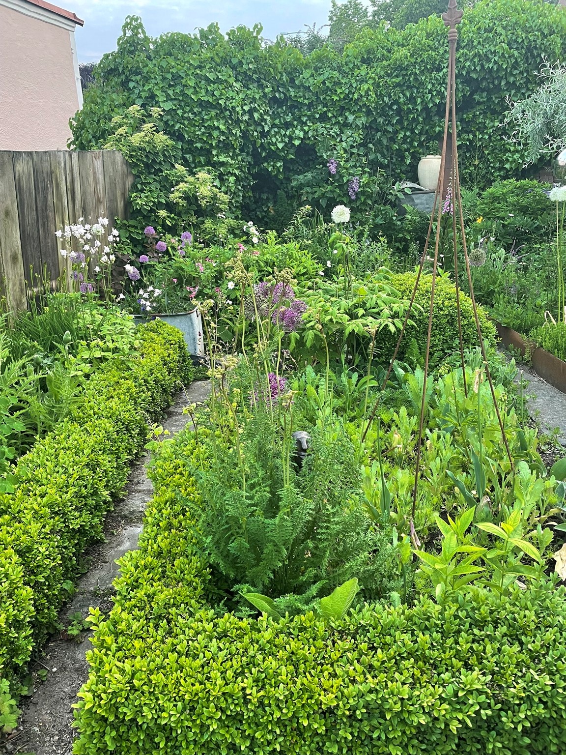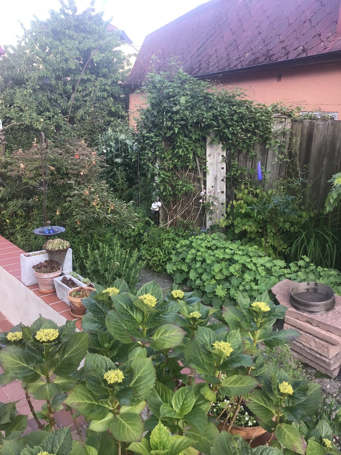 Bakom planket intill det gamla huset finns en liten trädgård. Här finns plats för vila och inspiration. Inga räta rader och det är definitivt inte ogräsfritt här. Jag älskar blommor. Det finns ingen röd tråd när det gäller val av växter. men jag har oftast en "relation" med växterna annars fungerar det inte.  Jag går mest på  känsla. Det ska  dofta och vara vackert. Fikon, blåregn akebia, blyblommor, en bouganvillea som är över 30 år trivs bra här.