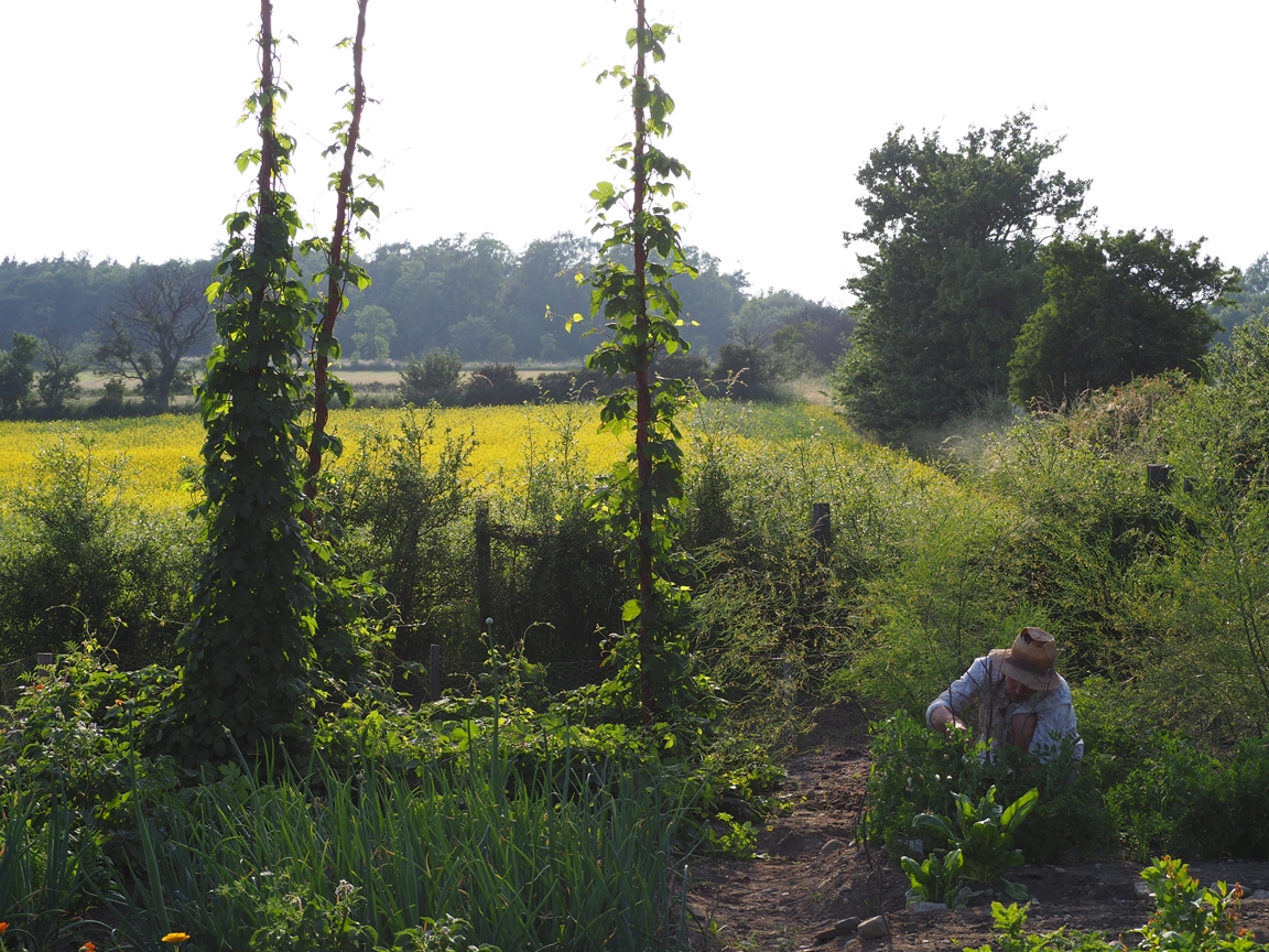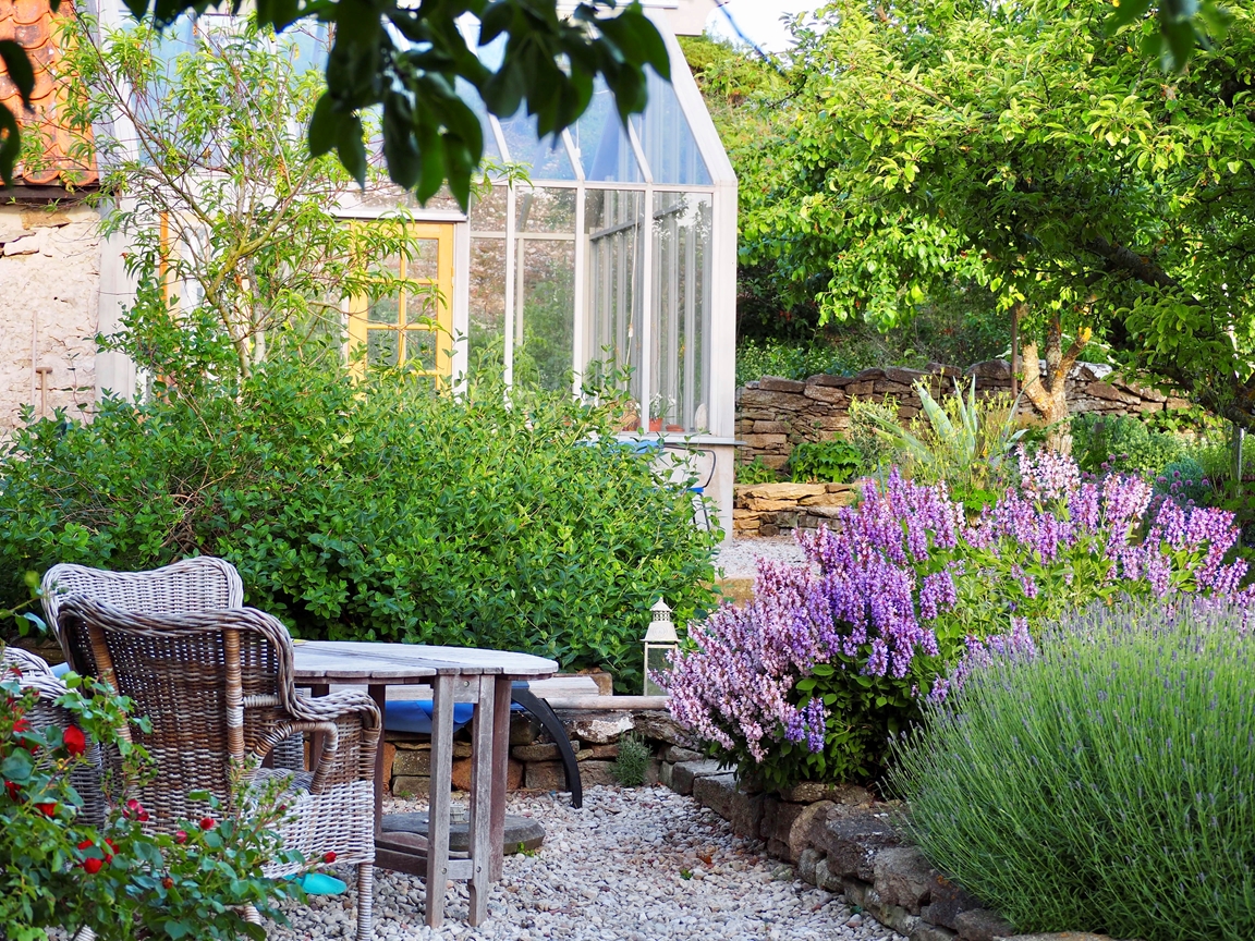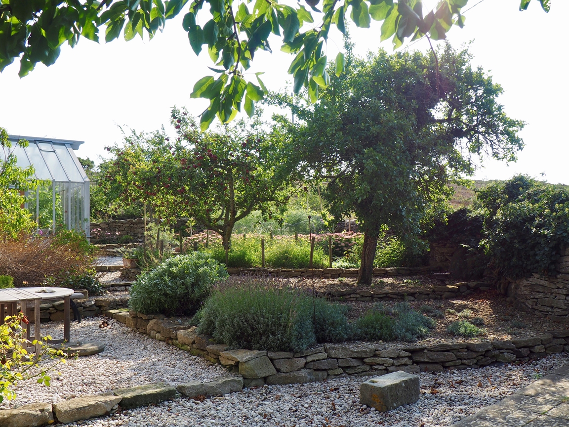 Placeringen i det skyddade läget, stenmuren och den kalkrika jorden, ger förutsättning för en sinnlig, terasserad trädgård med växthus och en större köksträdgård.