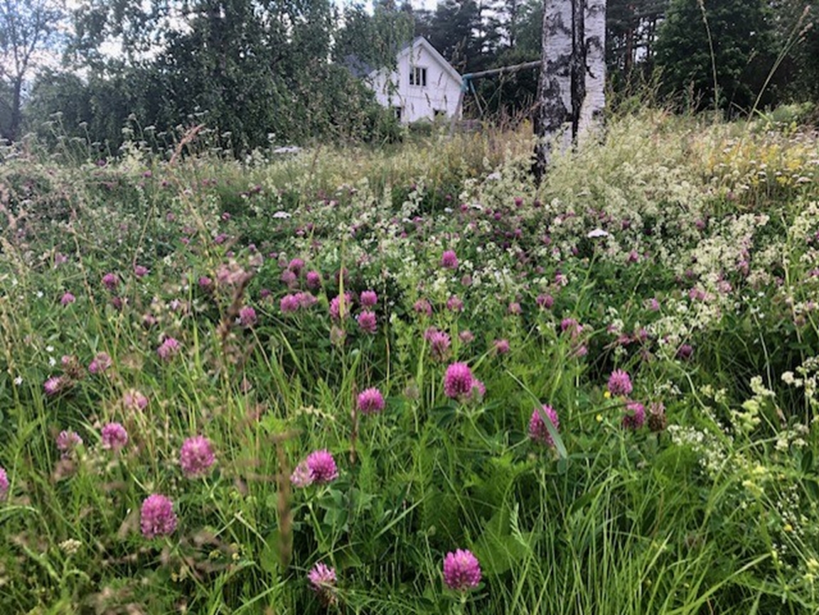 Stor ekologisk trädgård med odlingar av mat och blommor.