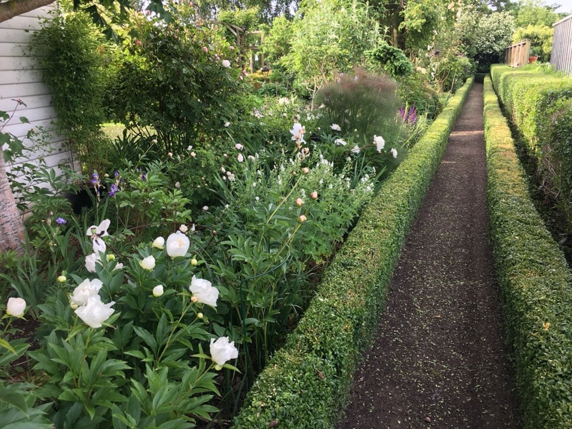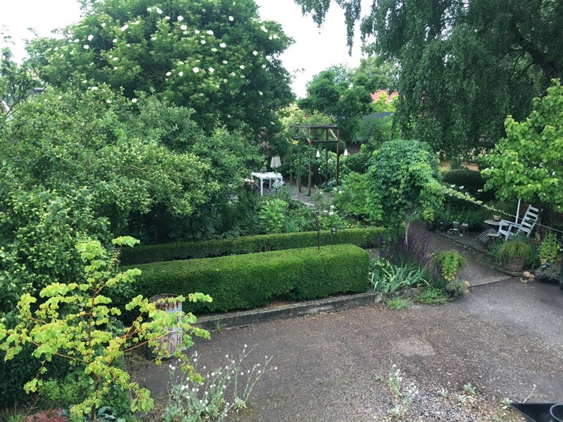 En äldre, men uppdaterad, trädgård med buxbomskantade gångar. Efterhand har det tillkommit uteplatser och ganska mycket växter. Det finns en hel del lite ovanligare träd och buskar.