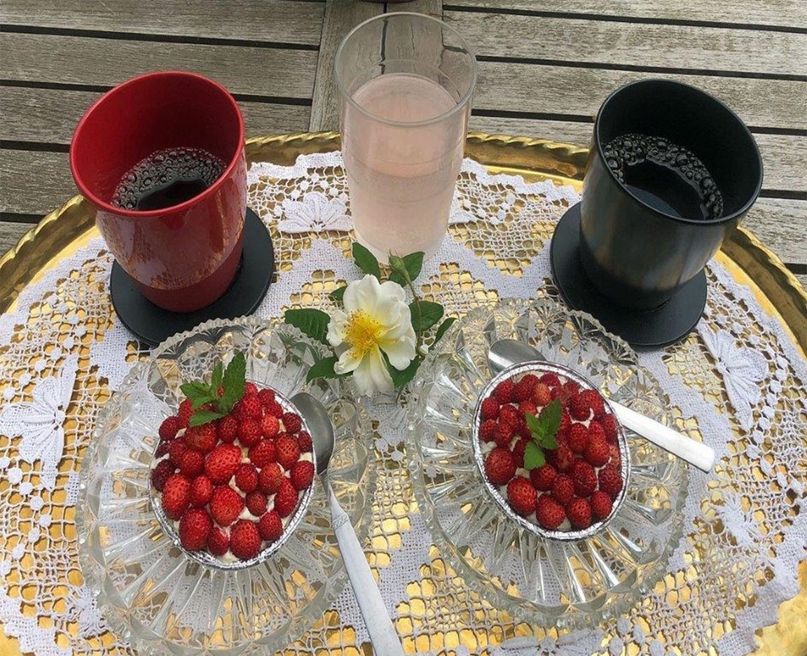 Kaffe, te, fläderdricka, smultronbakelse (glutenfri på mandelbotten)