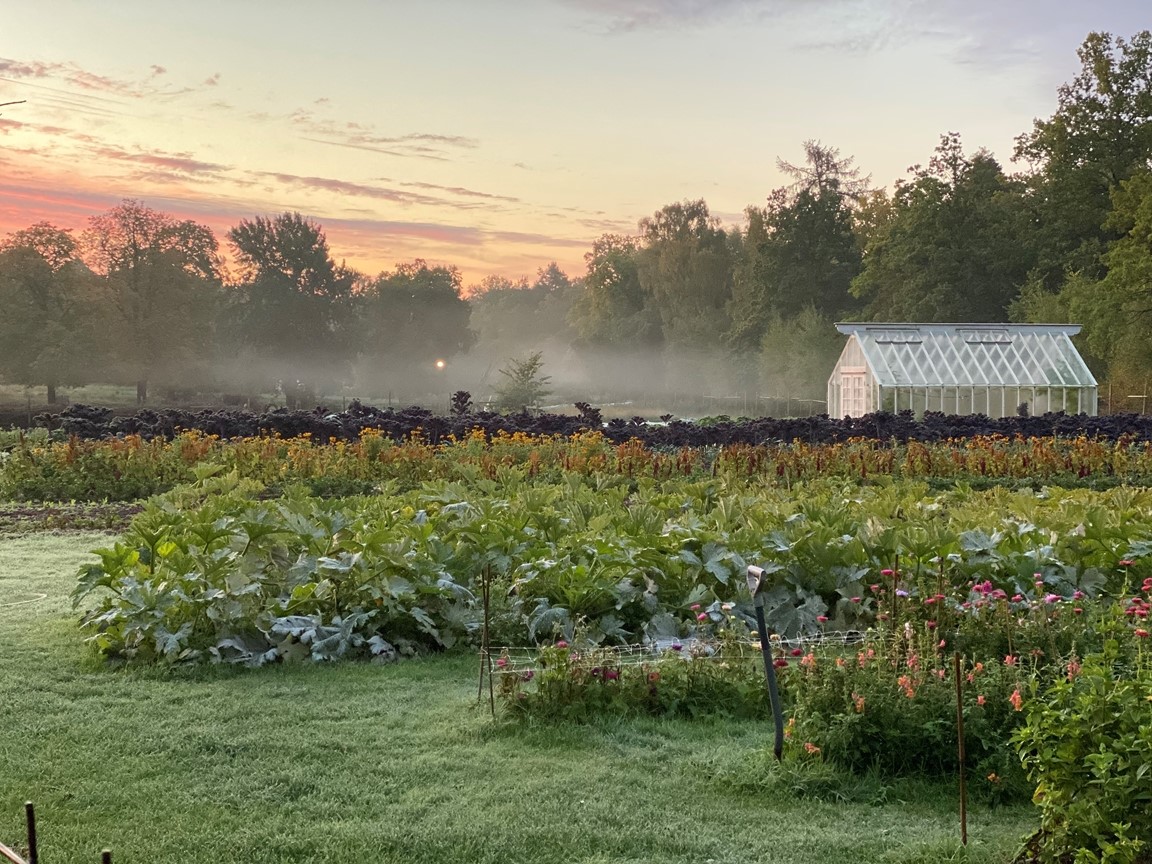 Mat som lagats från grunden utifrån säsongens ekologiska råvaror. I skördetid levererar trädgårdsmästarna egna biodynamiskt odlade grönsaker, kryddor och frukt till bageri och kök.