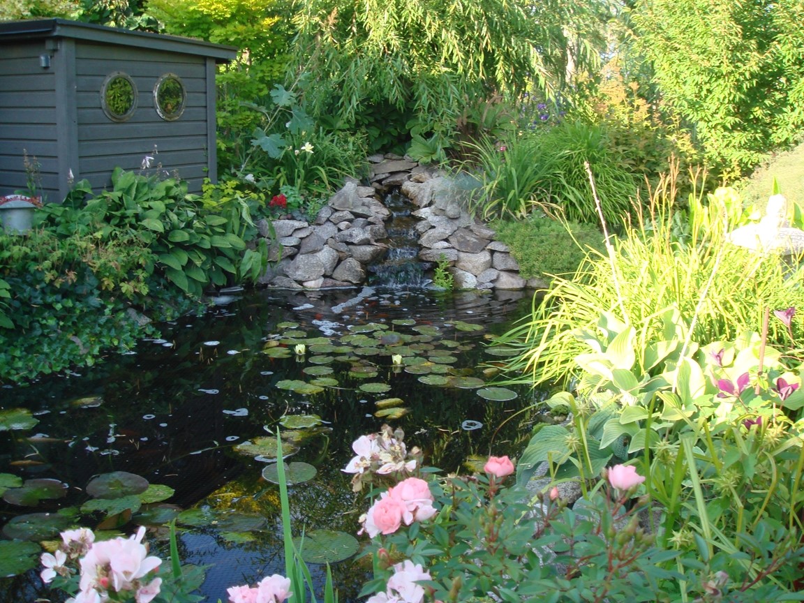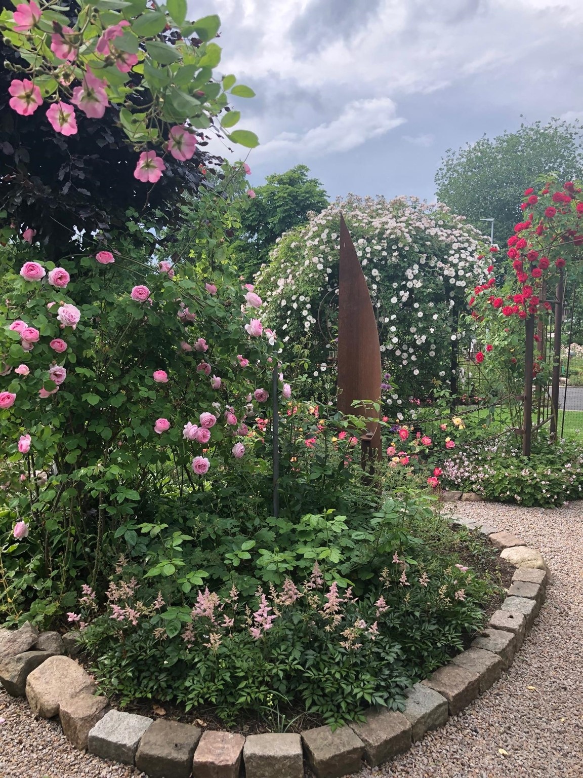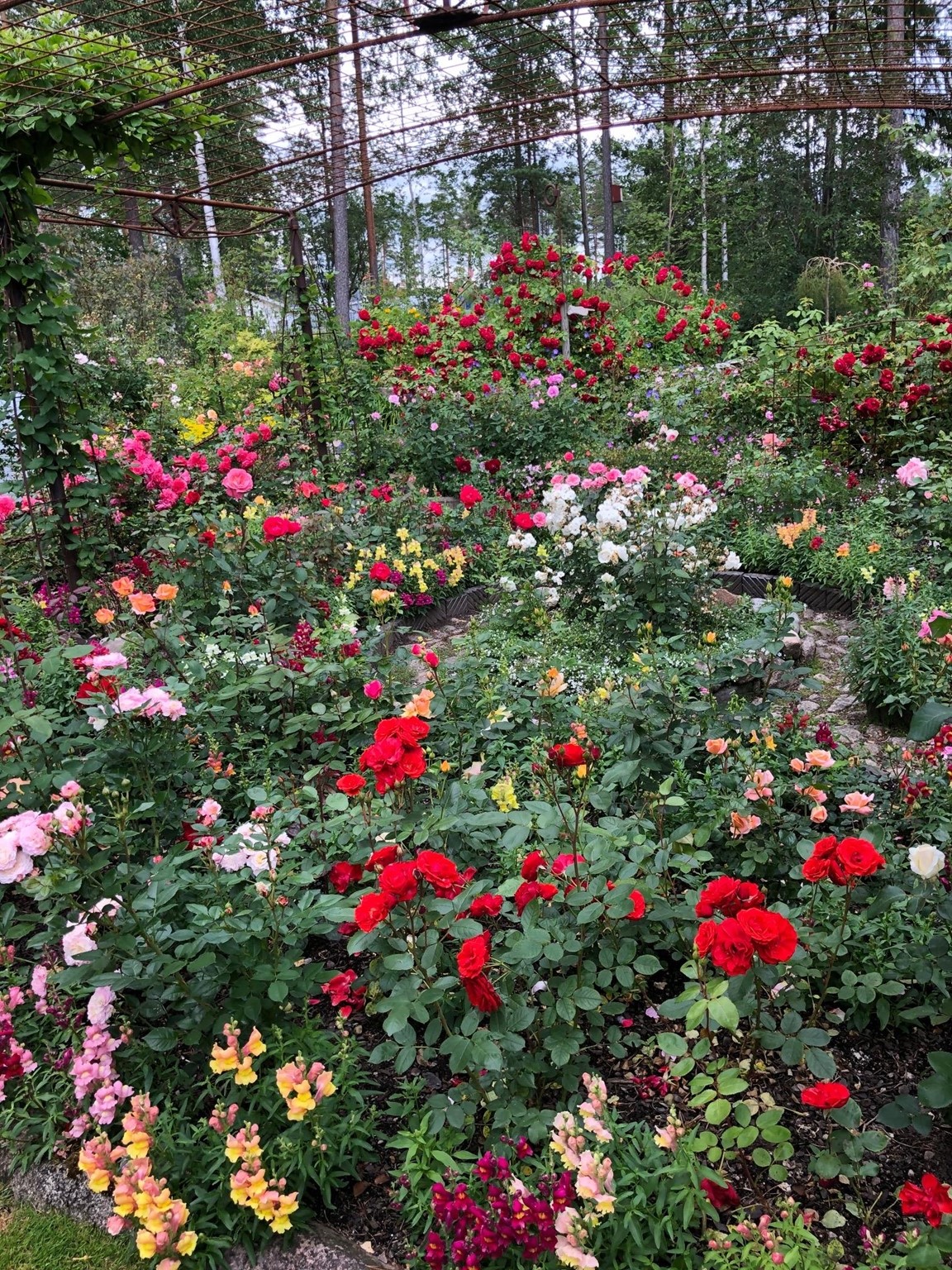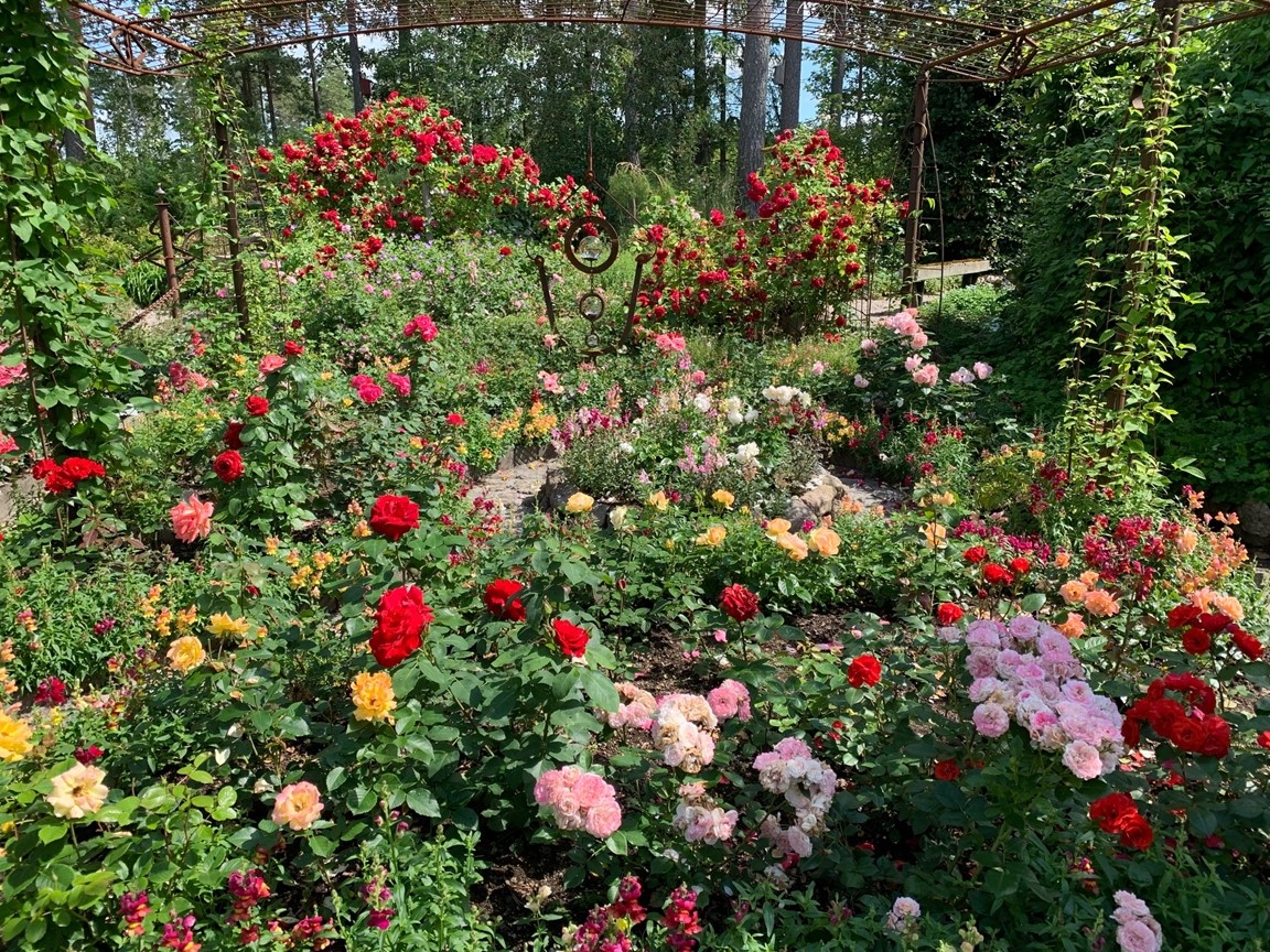 Blomsterprakt med massor av blommor därav över 400 rosor, arrangerade med egentillverkade järnkonstruktioner. Flera vattenkonstruktioner finns. Mycket sten och gångar virvlar sig genom heia trädgården.