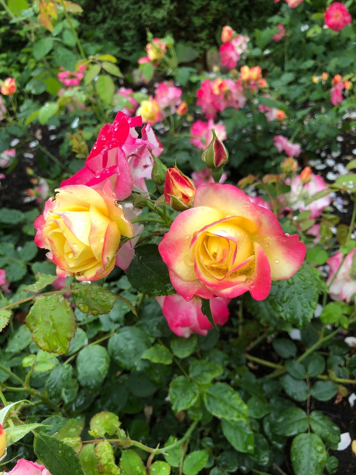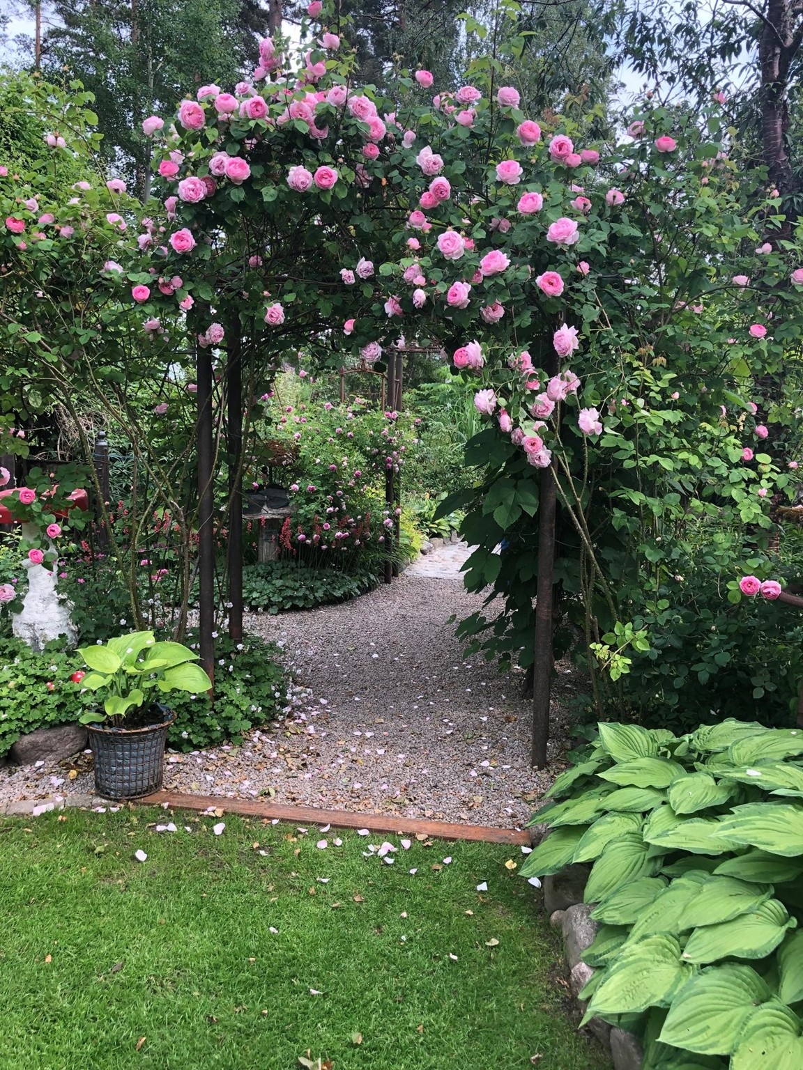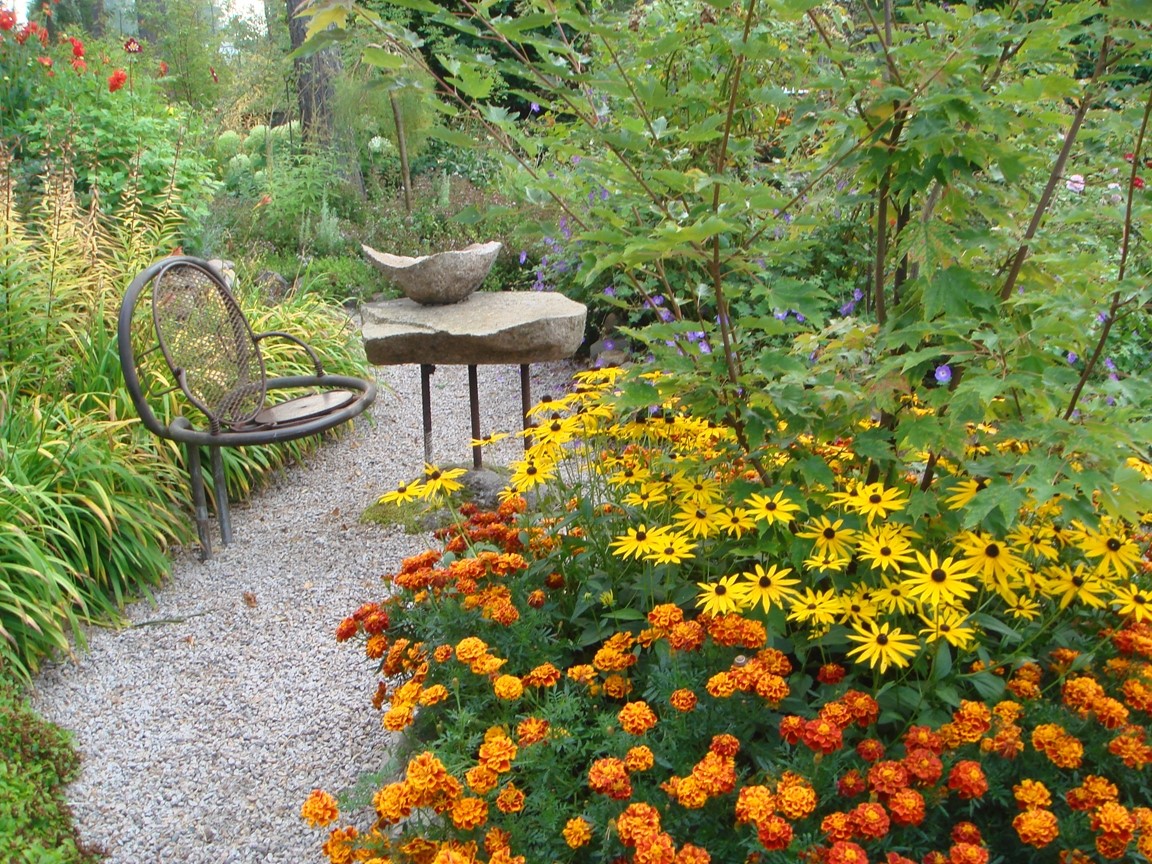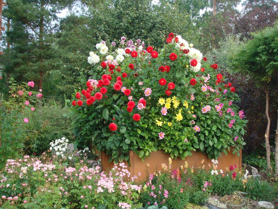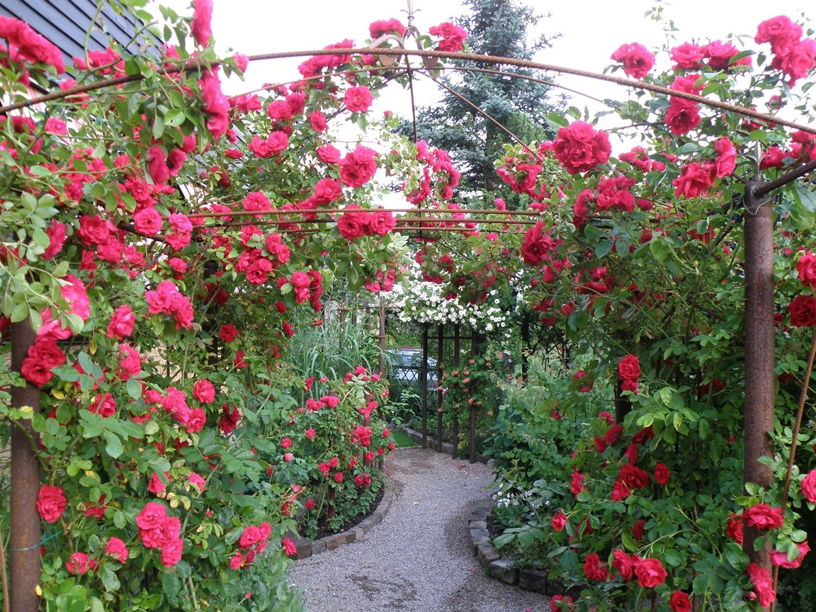Blomsterprakt med massor av blommor därav över 400 rosor, arrangerade med egentillverkade järnkonstruktioner. Flera vattenkonstruktioner finns. Mycket sten och gångar virvlar sig genom heia trädgården.