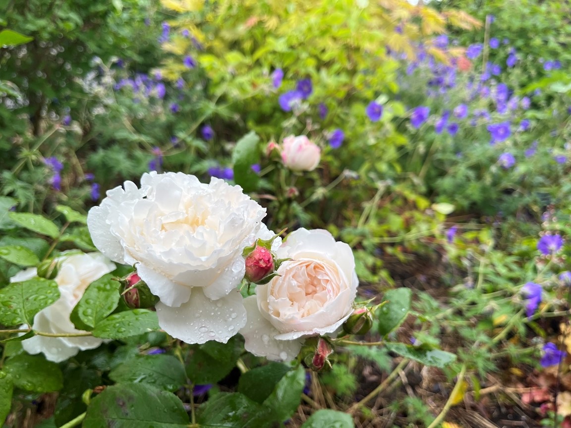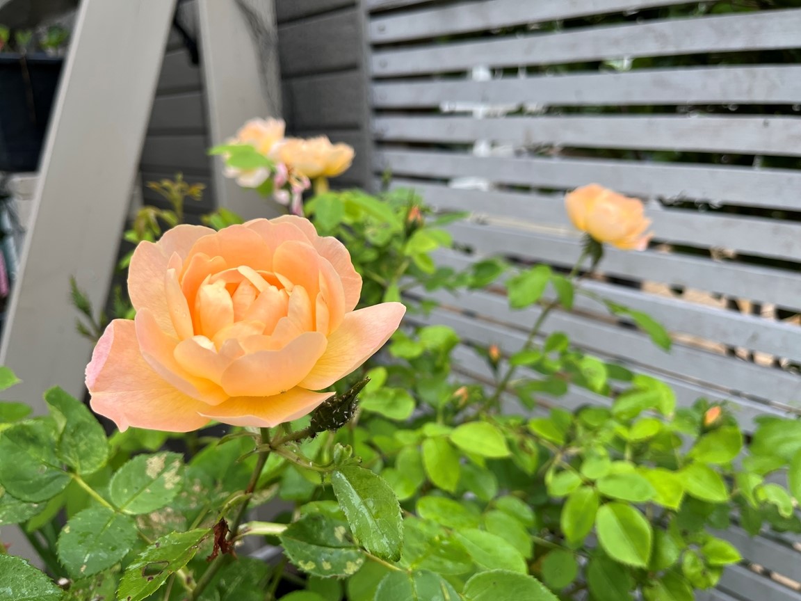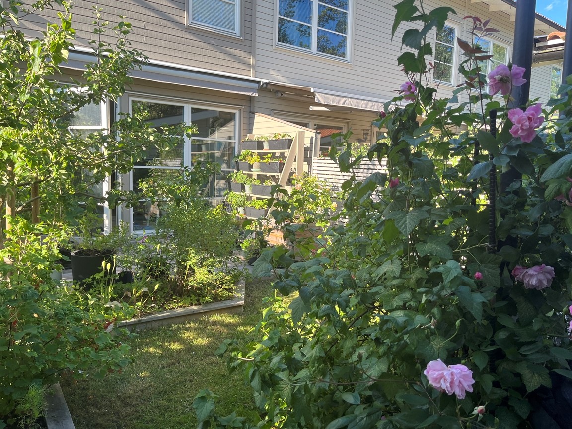 Med ca 130 kvm är vår radhusträdgård inte så stor men den rymmer många rosor, barnens studsmatta och tomat- och bärodling. Vi har ca 40 rosor där vi drivit upp mer än hälften från sticklingar. I trädgården finns alltifrån vår stora New Dawn, många Austinrosor som t.ex. Mary Delany, Winchester Cathedral, Royal Jubilee, Tottering by Gently, Lady Shalott mm. I vår rosportal klättrar rosen Wrams Gunnarstorp och i pergolan klättrar Valdemar, Ghislaine de Feligonde, en honungsros och Climbing Iceberg. På framsidan samsas rosorna med nävor, gillenia, alunrot och ettåringar. På gaveln samsas rosorna med blåbärstry och vår potatisodling i krukor. På baksidan har vi vår grönsaksodling med fokus på barnens favoriter tomat, gurka och melon. På baksidan har vi även vår bärodling med jordgubbstrappa, vinbär, björnbär och allåkerbär. I Uppland på gränsen till Södermanland. Varmt välkomna hem till oss!