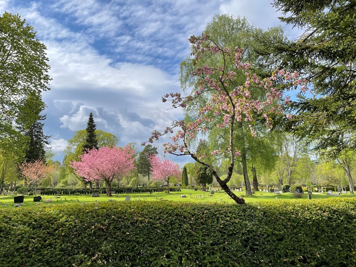 Den 20 hektar stora kyrkogården invigdes 1887 och bär på över hundra års berättelser, formade i sten, vegetation och landskap. Här kan du vandra genom olika tidsepoker och se hur gravvårdar och kyrkogårdsdesign har förändrats genom åren. Det rika och breda växtmaterialet – från ståtliga träd till omsorgsfullt valda planteringar – skapar en stillsam och inspirerande miljö för både eftertanke och trädgårdsintresse.