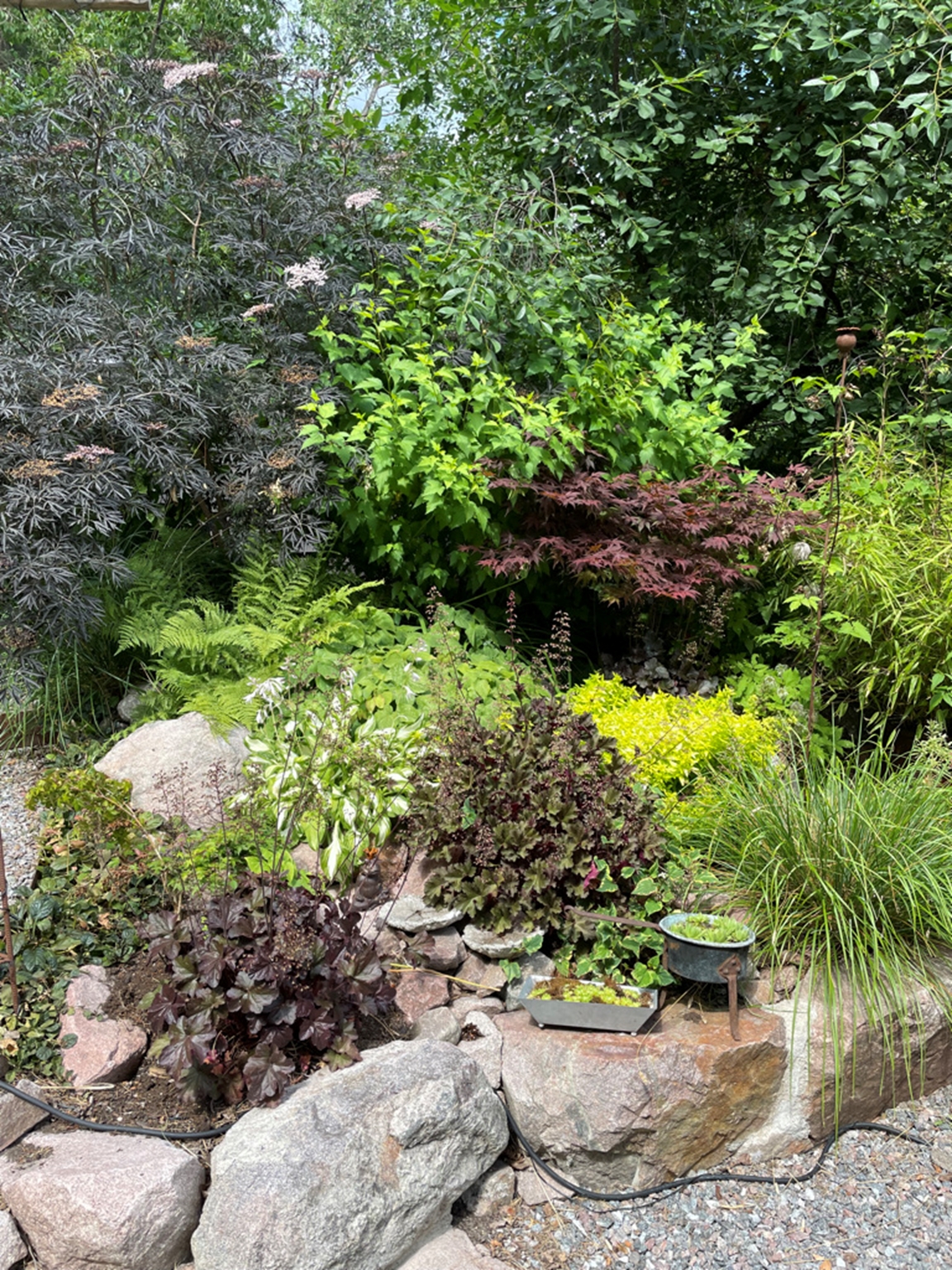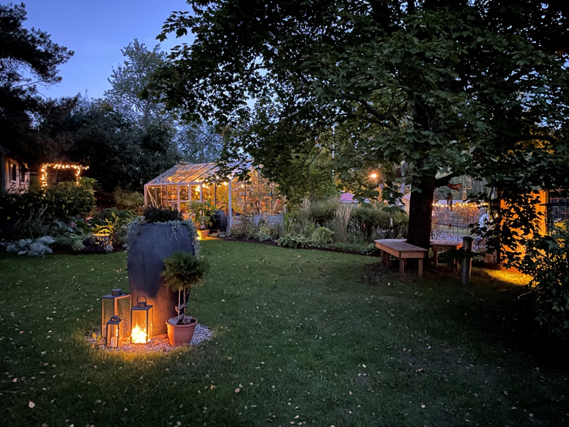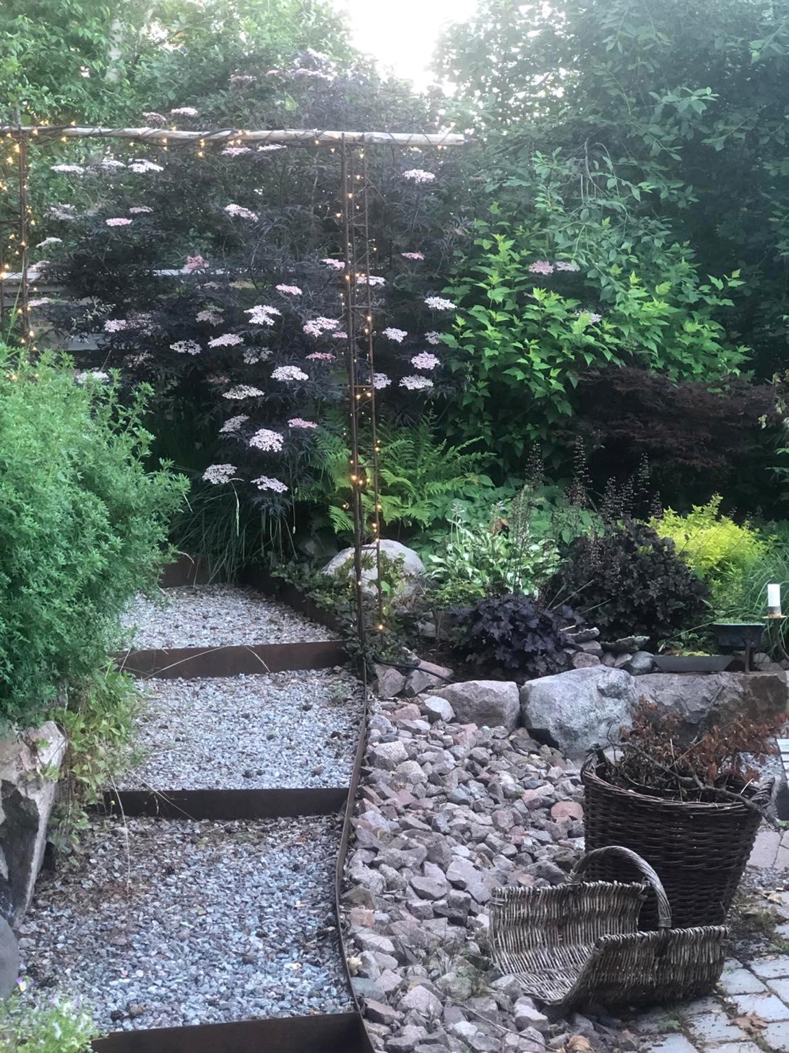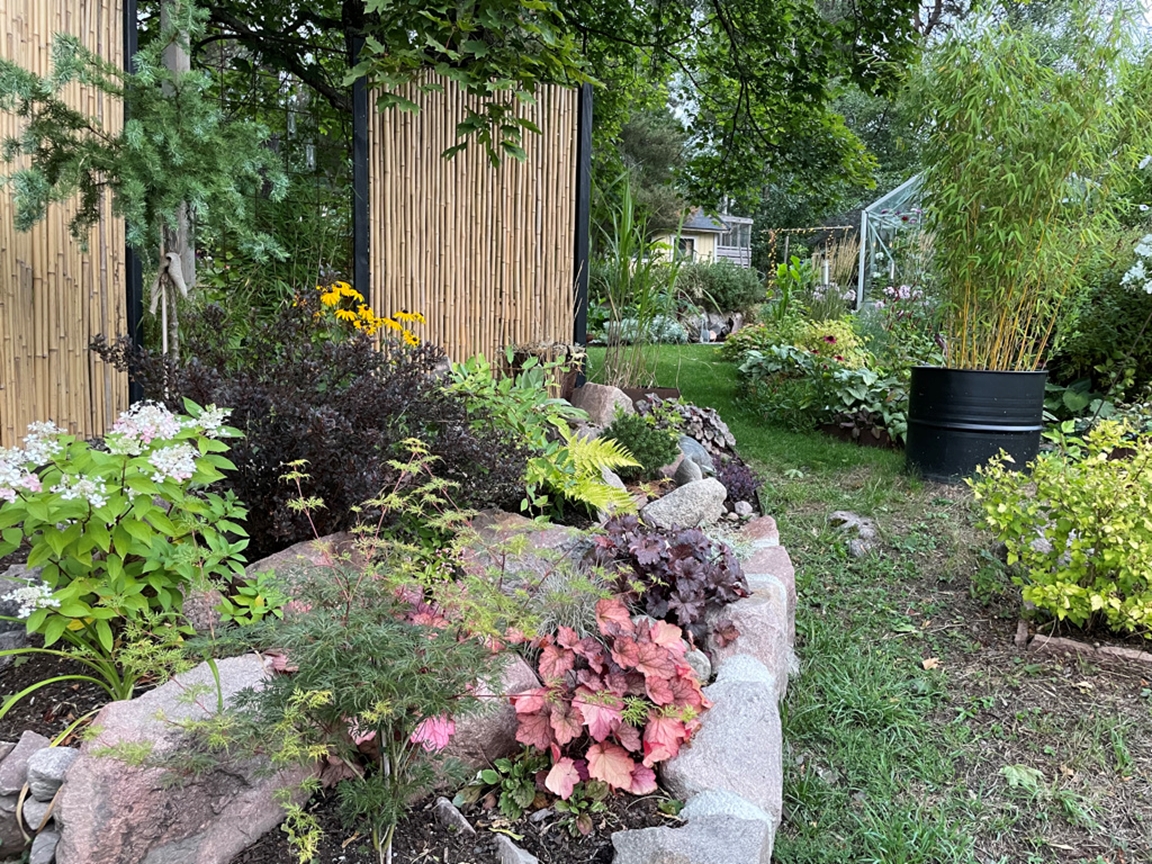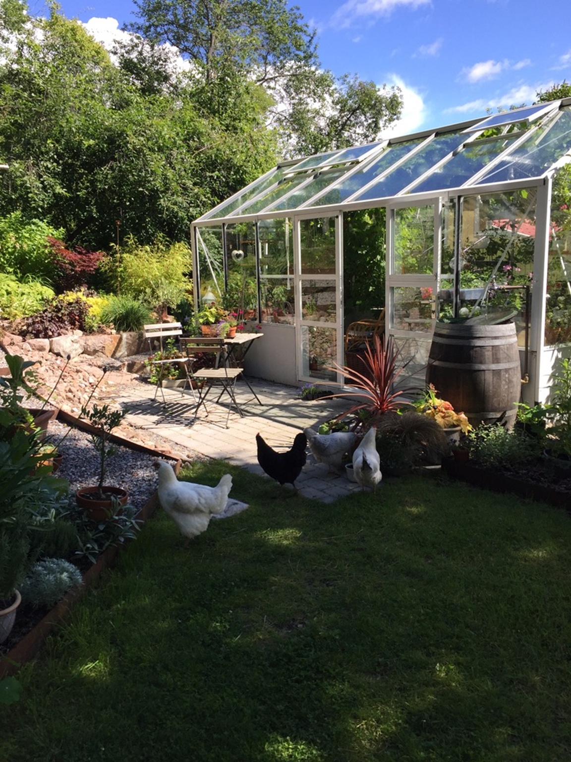 Vår trädgård är 1299 kvm och ligger i en stenig och torr skogsbacke i ett äldre villaområde. Marken är mycket svår att gräva, full av sten och schaktmassor. Under många år odlade jag därför mest i krukor. När mitt nya växthus byggdes 2018 tog trädgårdsintresset fart på allvar. Isället för att försöka gräva i den steniga hårda jorden började vi anlägga rabatter och odlingar genom att bygga ovanpå marken med hjälp av böljande cortenkanter och den stora mängd sten som blev över vid växthusbygget. Vi kämpar med de utmaningar som växtplatsen ger. Ibland funkar det och ibland får vi ge upp och tänka om. Jag vintersår perenner och förodlar en del sommarblommor till krukor och lådor.