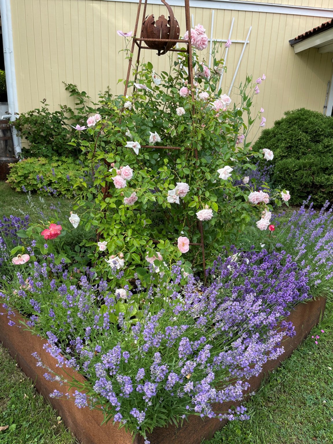 Upphöjda perennrabatter med cortenkanter och en blandning av olika sorters perenner.