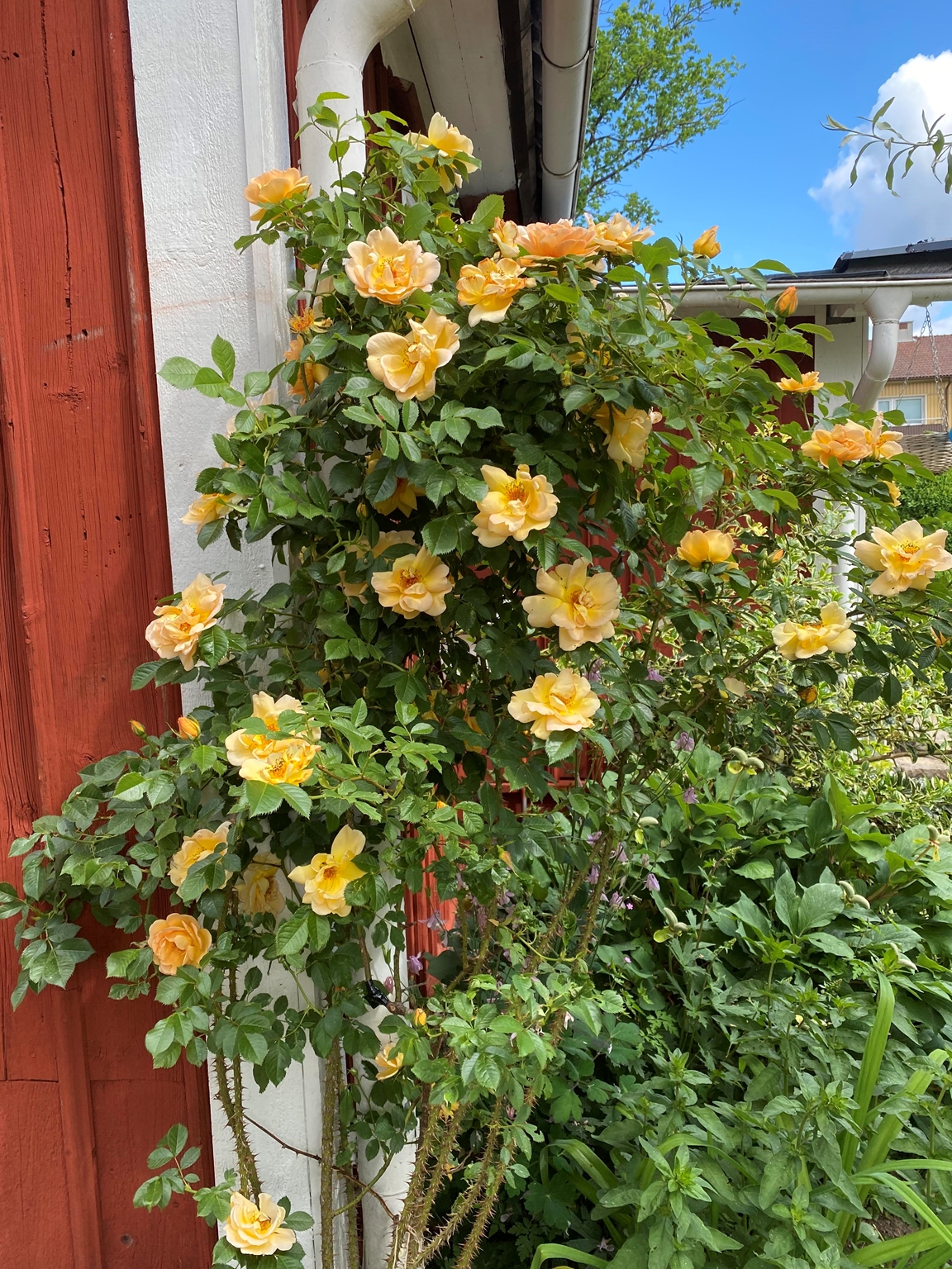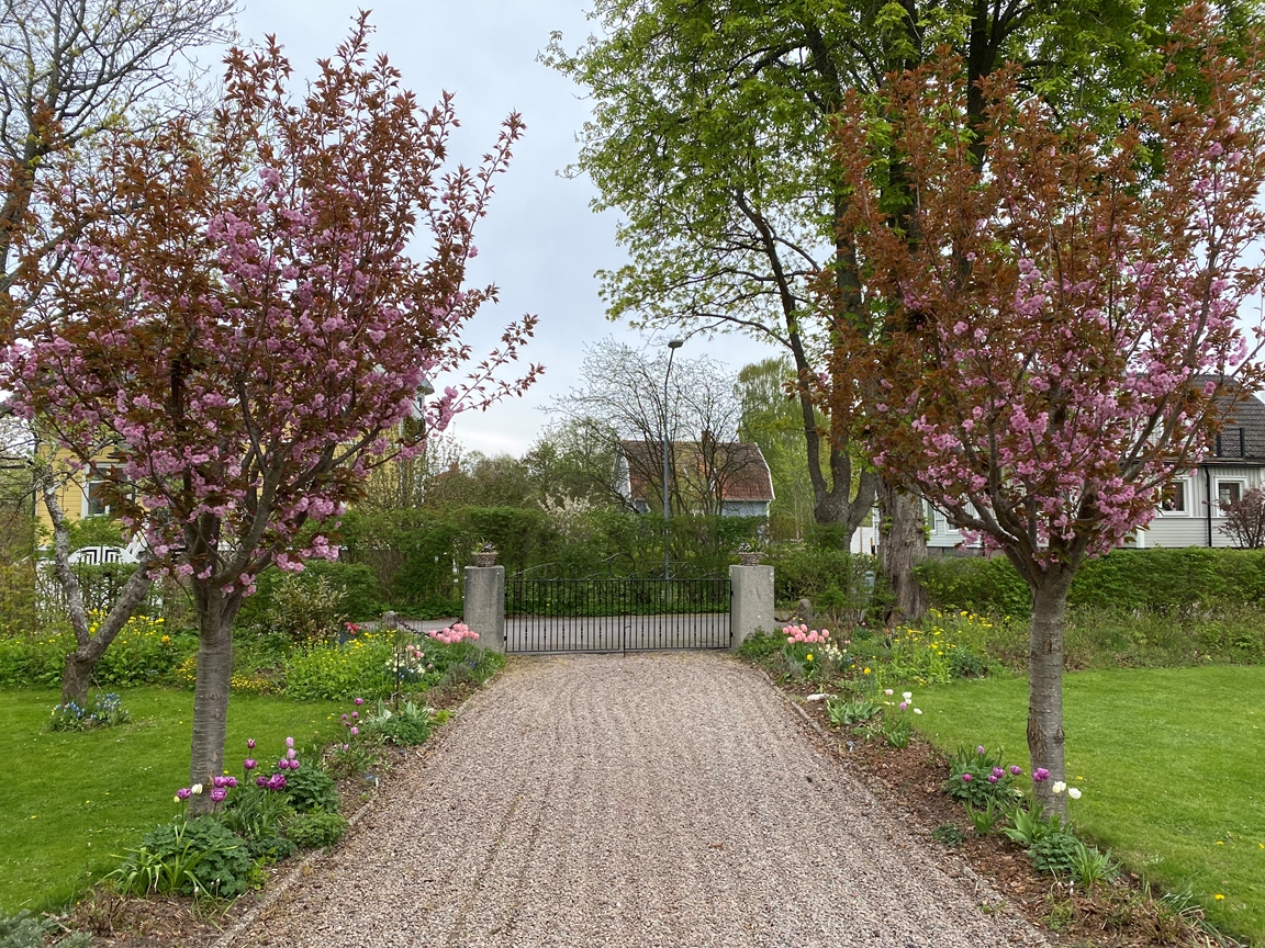 Vår trädgård är långt ifrån perfekt men här finns en gammaldags charm i form av klängande rosor i mossiga fruktträd, en del besvärligt ogräs såsom kirskål och vitplister i rabatterna samt tusensköna och maskros i gräsmattan. Då vi inte använder någon form av bekämpningsmedel blir det en ojämn kamp.