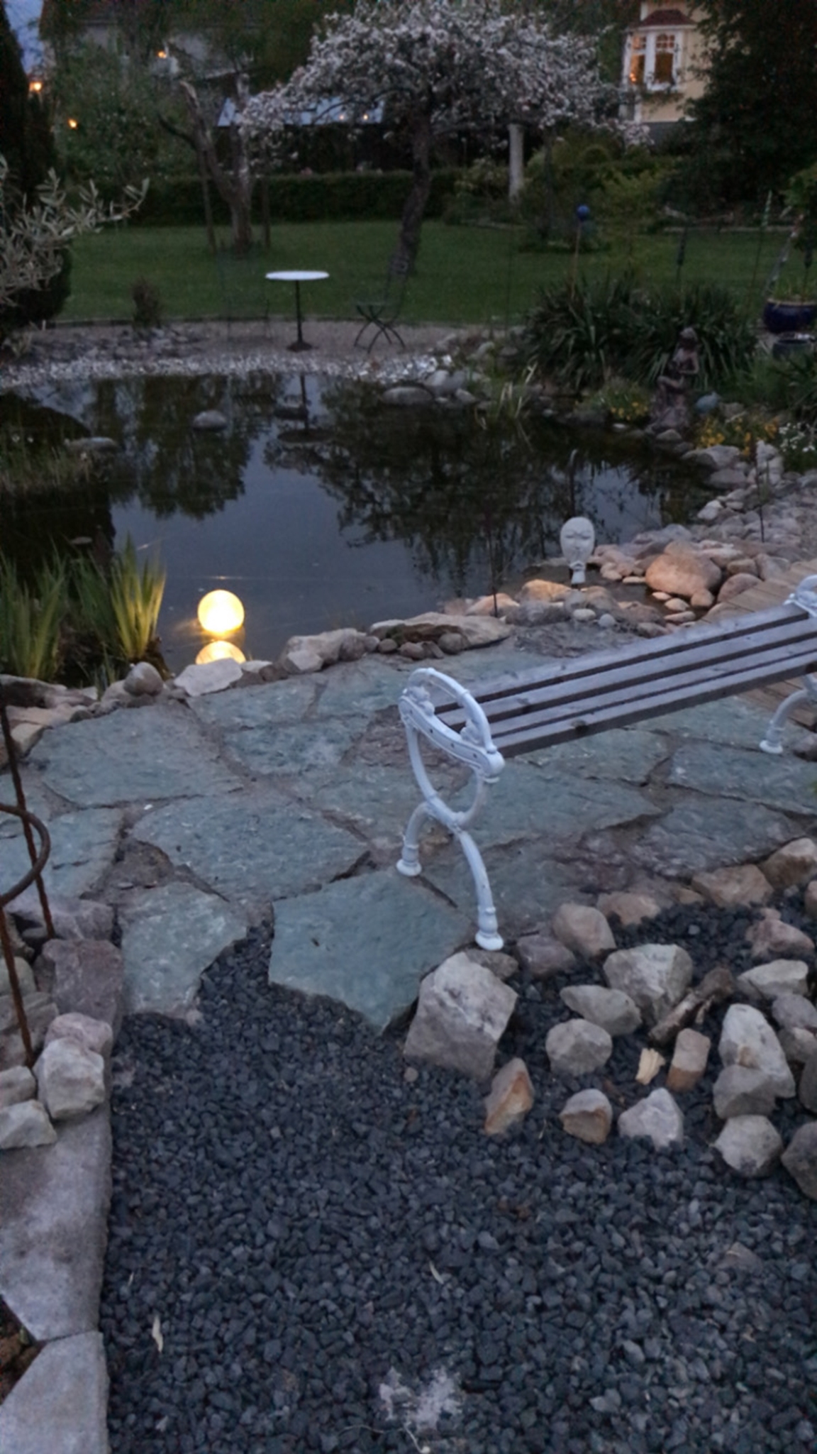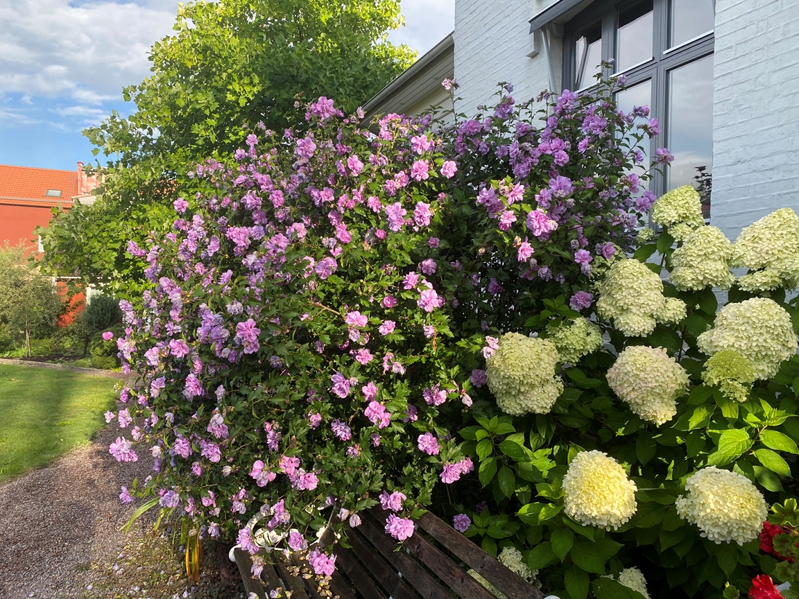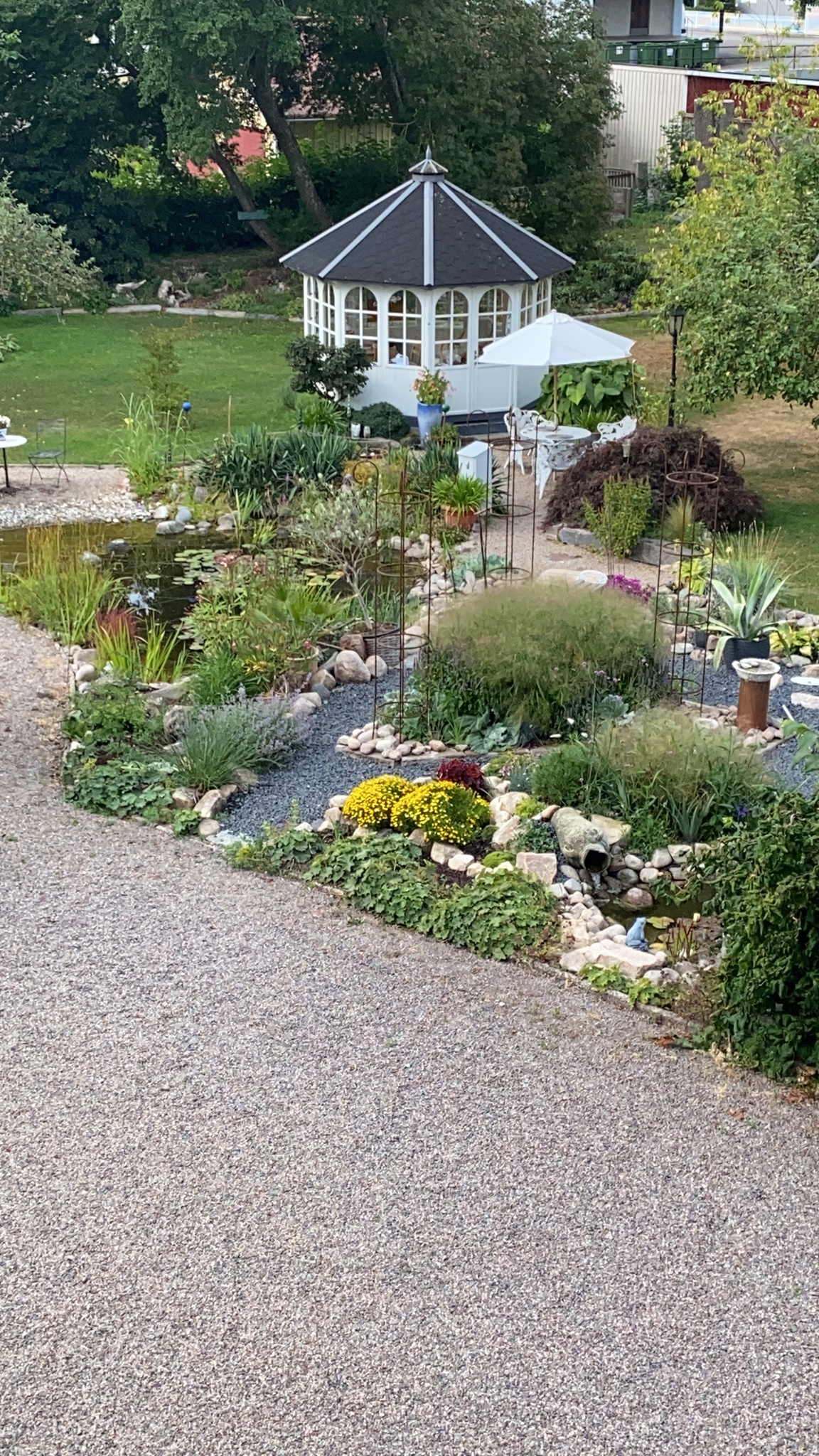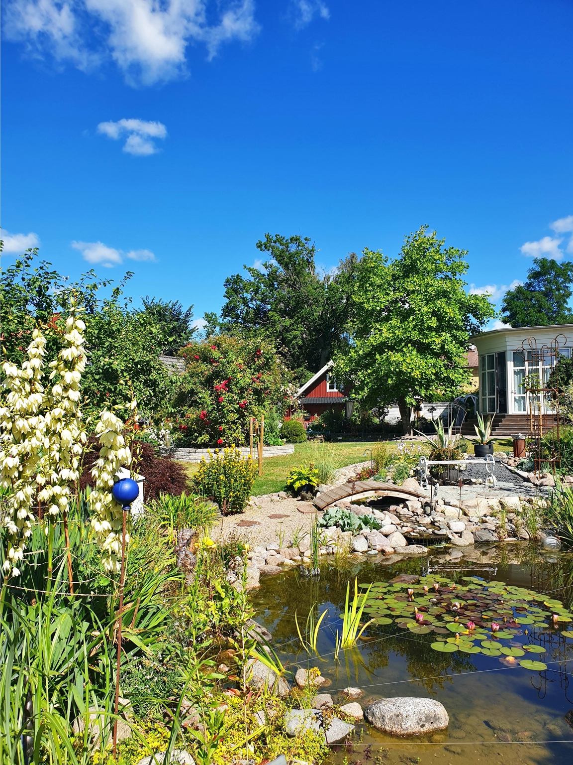 Under de senaste 20 åren har det succesivt kommit till nya inslag som spajefruktträd,buxbomshäckar och två dammar förbudna med en bäck. Vi har under många år byggt upp vår rosenträdgård som nu stoltserar med ca 100 sorter. På norrsidan samt under vårt valnöts och gulplommonträd trivs surjordsväxter som rhododendron och azaleor.