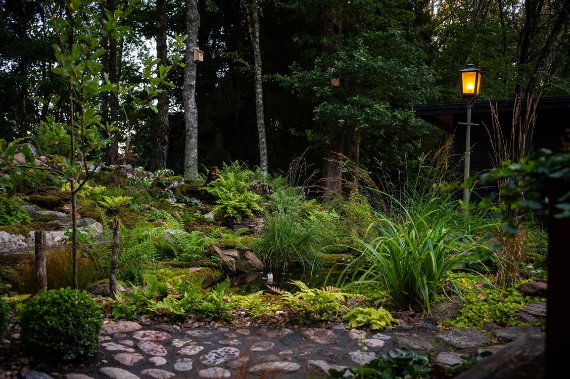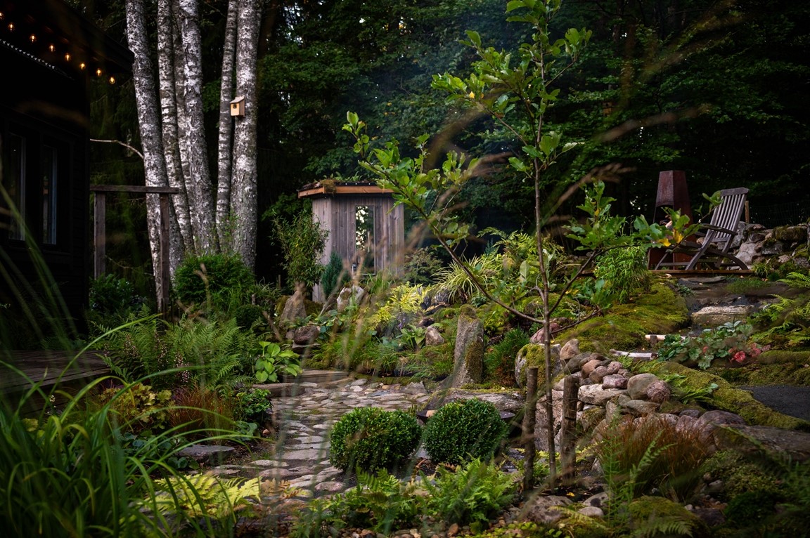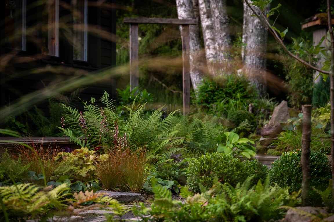 Vid skogstorpet har den nya, skogsinspirerade trädgården tagit sin form på endast två växtsäsonger. Den forna gräsmattan har formats om med enbart spade till hjälp och blivit en trädgård i flera nivåer, med ett nätverk av gångar, kantade av trädstammar och stubbar. I slänten letar sig vattendrag ner till dammarna, vars vatten lockat mer insekter och smådjur in i trädgården. Inspirationen ligger bokstavligen inom armslängds räckhåll och mycket av det som använts för att utforma trädgården kommer från skogen. Här får skogens växter möta naturens vilda karaktär. Marken täcks av mossa, med flera olika sorters bräken och träjon, inslag av japanska lönnar och barrväxter. Funkia, prydnadsgräs, kaukasisk förgätmigej, spetsmössa och alunrot ger liv och färg. All sten som grävts upp när dammarna anlades, har funnit sin nya plats ute i den mossmjuka mattan. Trädgården fanns att läsa om i Allt om Trädgård tidigt i våras – men det har hänt en del nytt bara sen den fotograferingen gjordes, så här finns nytt att upptäcka. Välkomna att besöka vår skogsträdgård!