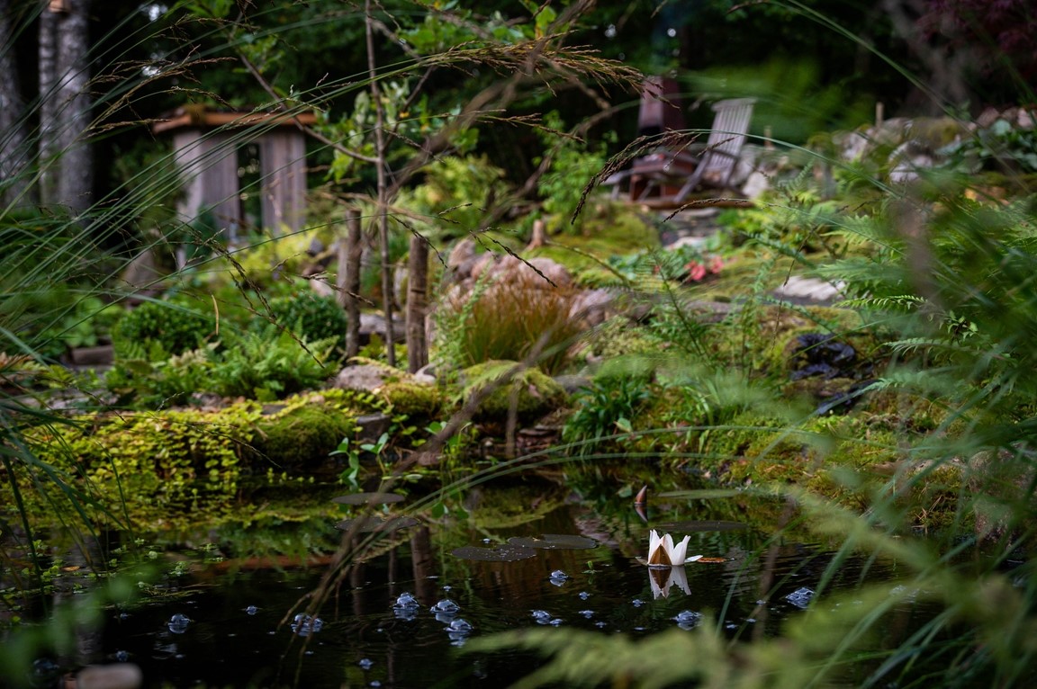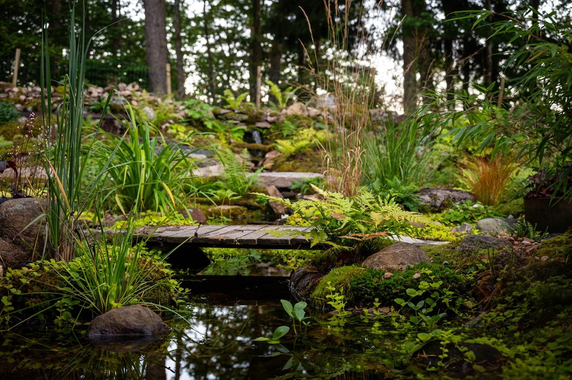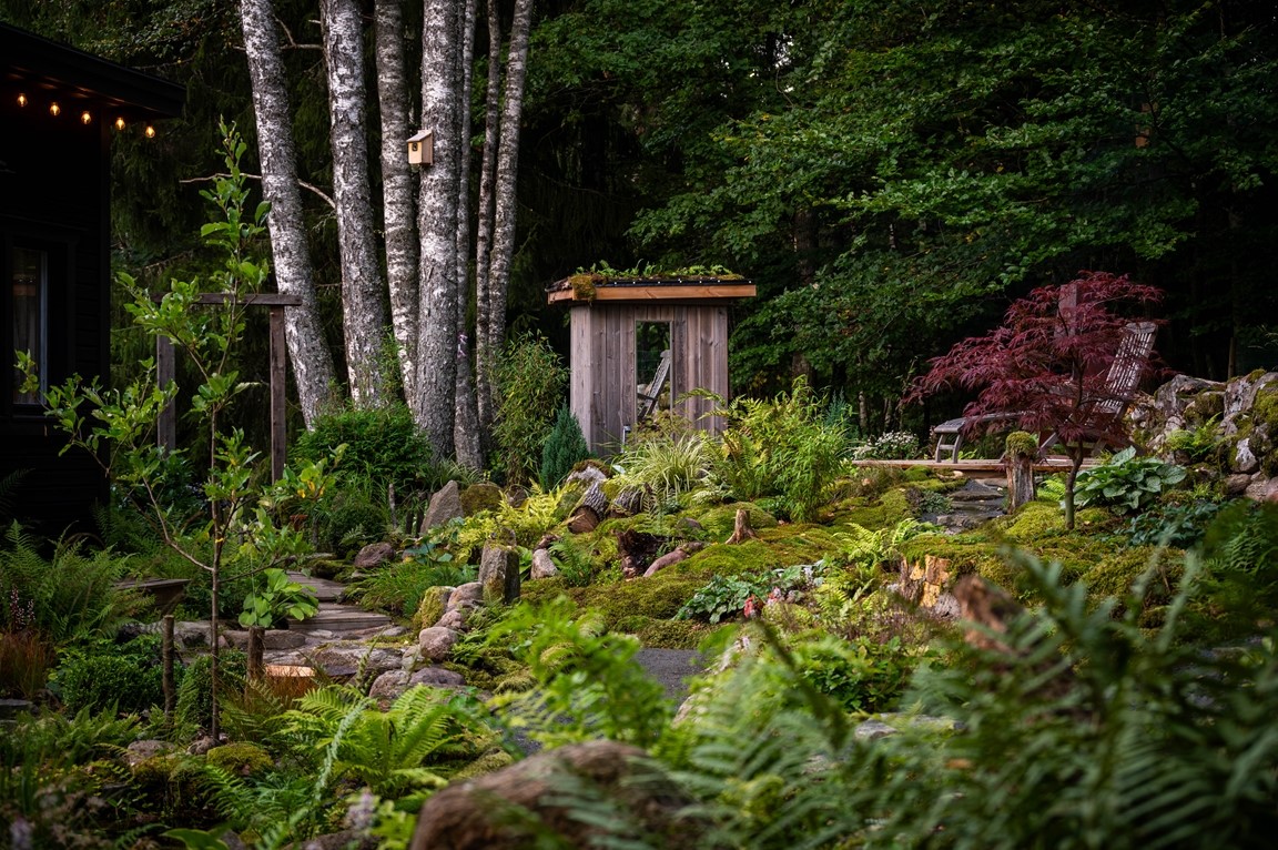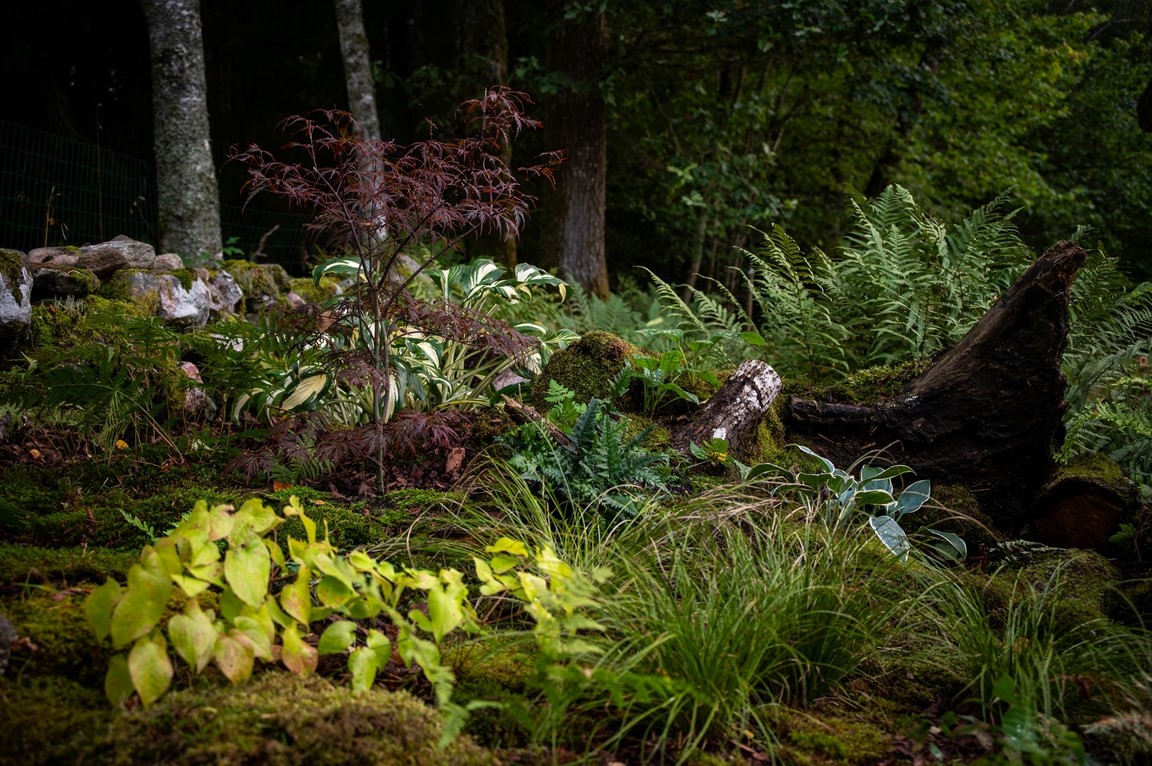 Vid skogstorpet har den nya, skogsinspirerade trädgården tagit sin form på endast två växtsäsonger. Den forna gräsmattan har formats om med enbart spade till hjälp och blivit en trädgård i flera nivåer, med ett nätverk av gångar, kantade av trädstammar och stubbar. I slänten letar sig vattendrag ner till dammarna, vars vatten lockat mer insekter och smådjur in i trädgården. Inspirationen ligger bokstavligen inom armslängds räckhåll och mycket av det som använts för att utforma trädgården kommer från skogen. Här får skogens växter möta naturens vilda karaktär. Marken täcks av mossa, med flera olika sorters bräken och träjon, inslag av japanska lönnar och barrväxter. Funkia, prydnadsgräs, kaukasisk förgätmigej, spetsmössa och alunrot ger liv och färg. All sten som grävts upp när dammarna anlades, har funnit sin nya plats ute i den mossmjuka mattan. Trädgården fanns att läsa om i Allt om Trädgård tidigt i våras – men det har hänt en del nytt bara sen den fotograferingen gjordes, så här finns nytt att upptäcka. Välkomna att besöka vår skogsträdgård!