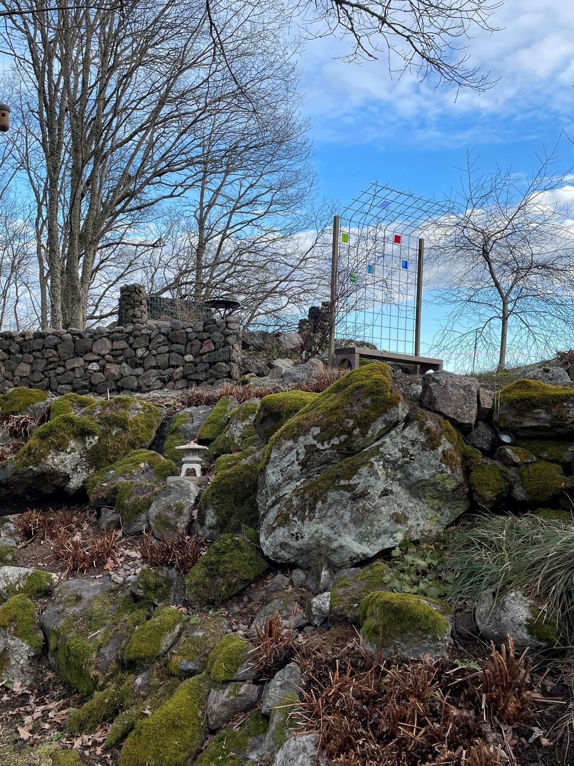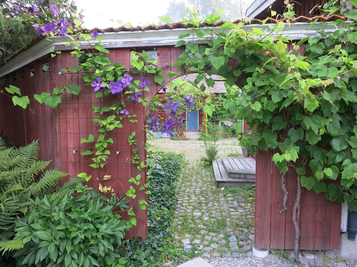 Här finns bland annat en ”ateljé”, en damm, flera perennrabatten, grusytor, stenläggningar och murar i natursten, en hel del gammalt ”skrot” har också fått nytt liv här.