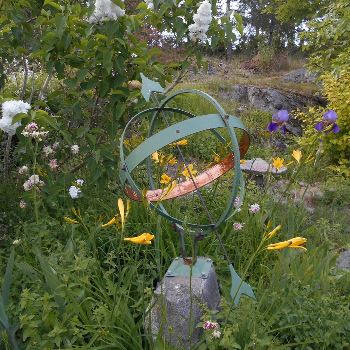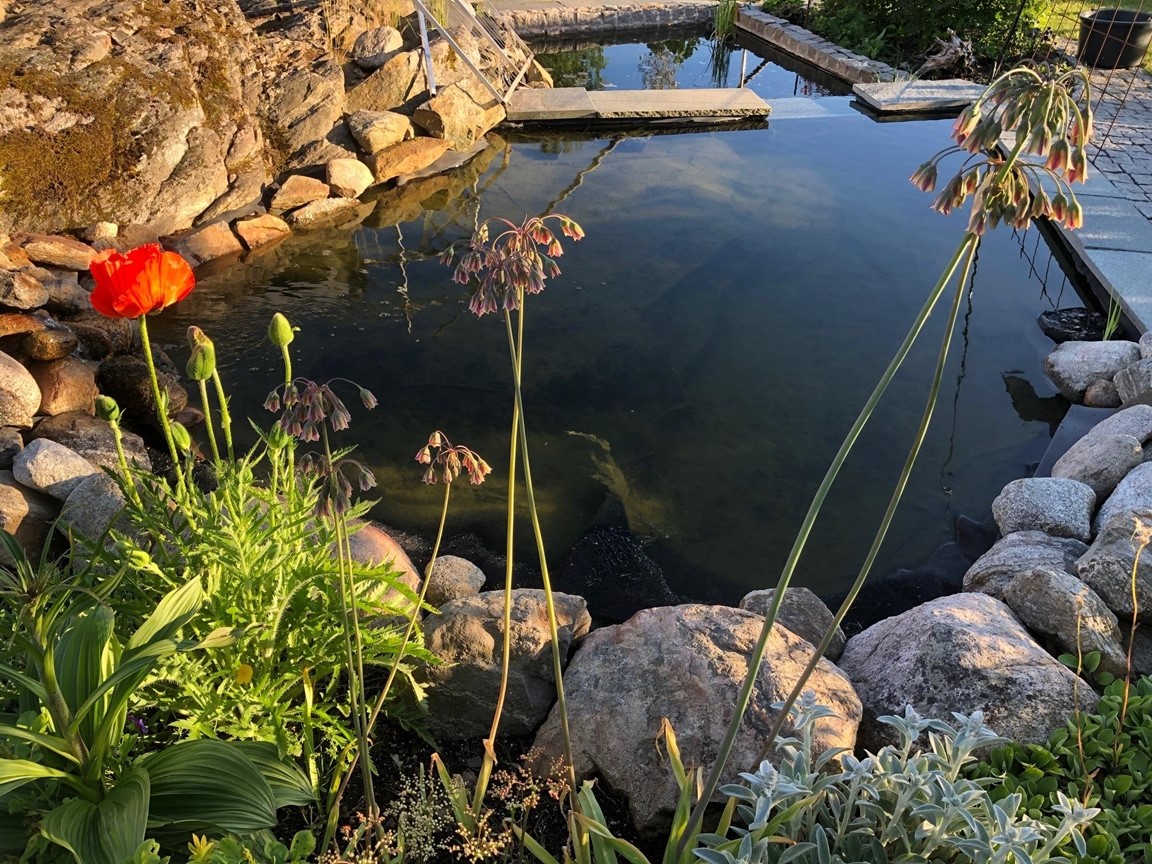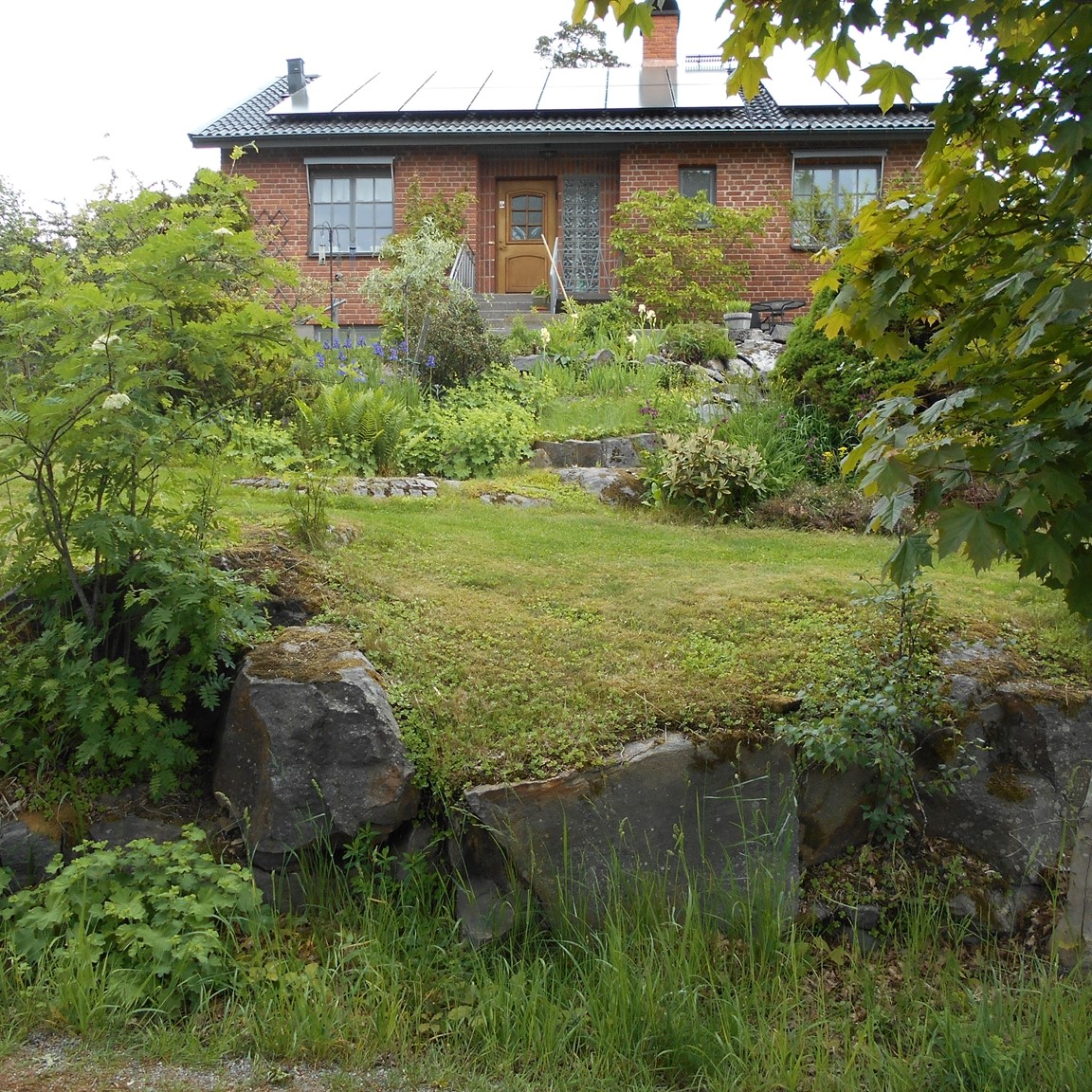 Trädgård i soligt söderläge på en bergig skogstomt. En blandning av vildvuxet och tuktat.Det ätbara är viktigt i vår trädgård så här finns fruktträd, bärbuskar och köksträdgård. Men även blommande buskar och perenner till lyst. En liten sommaräng för mångfalden. Senaste tillskottet är dammen, resultatet av parkslide-utrotning.