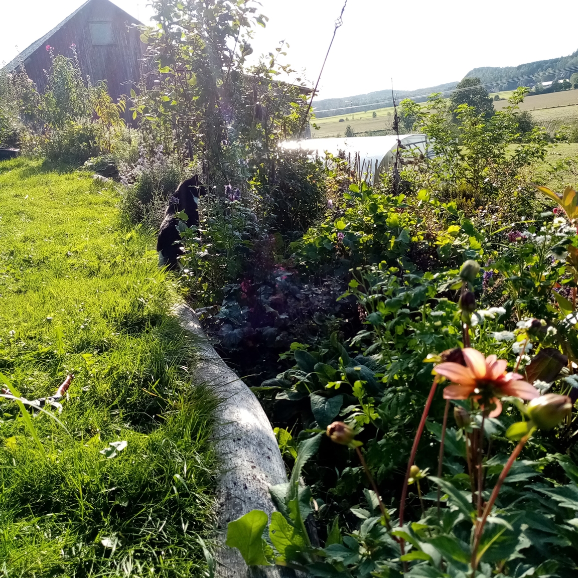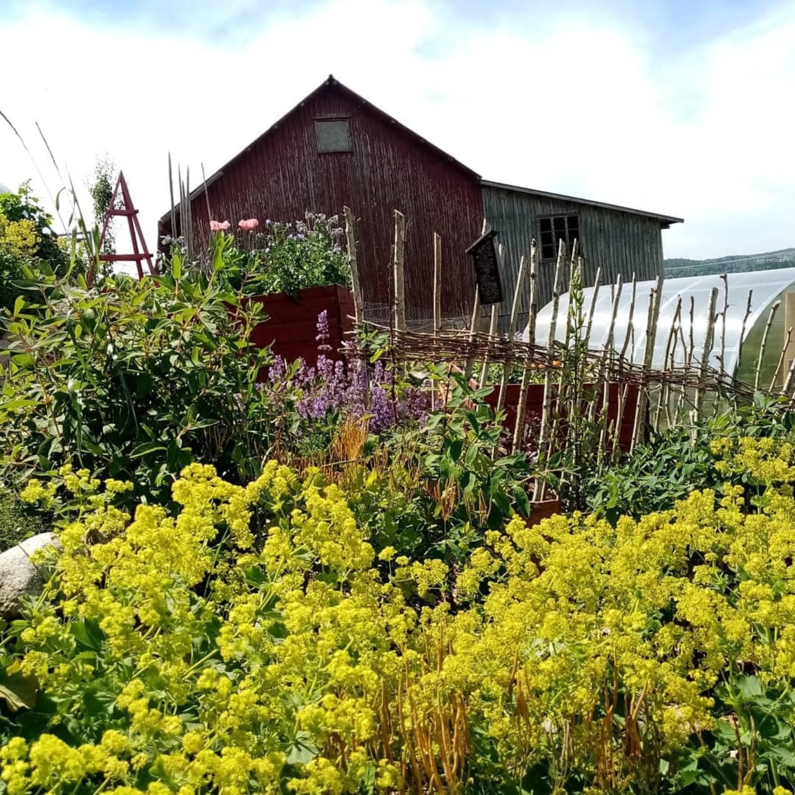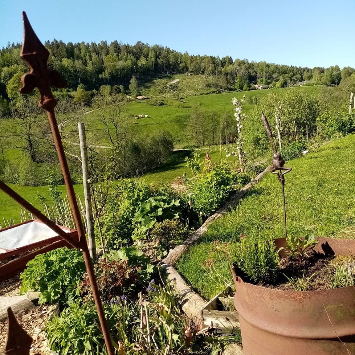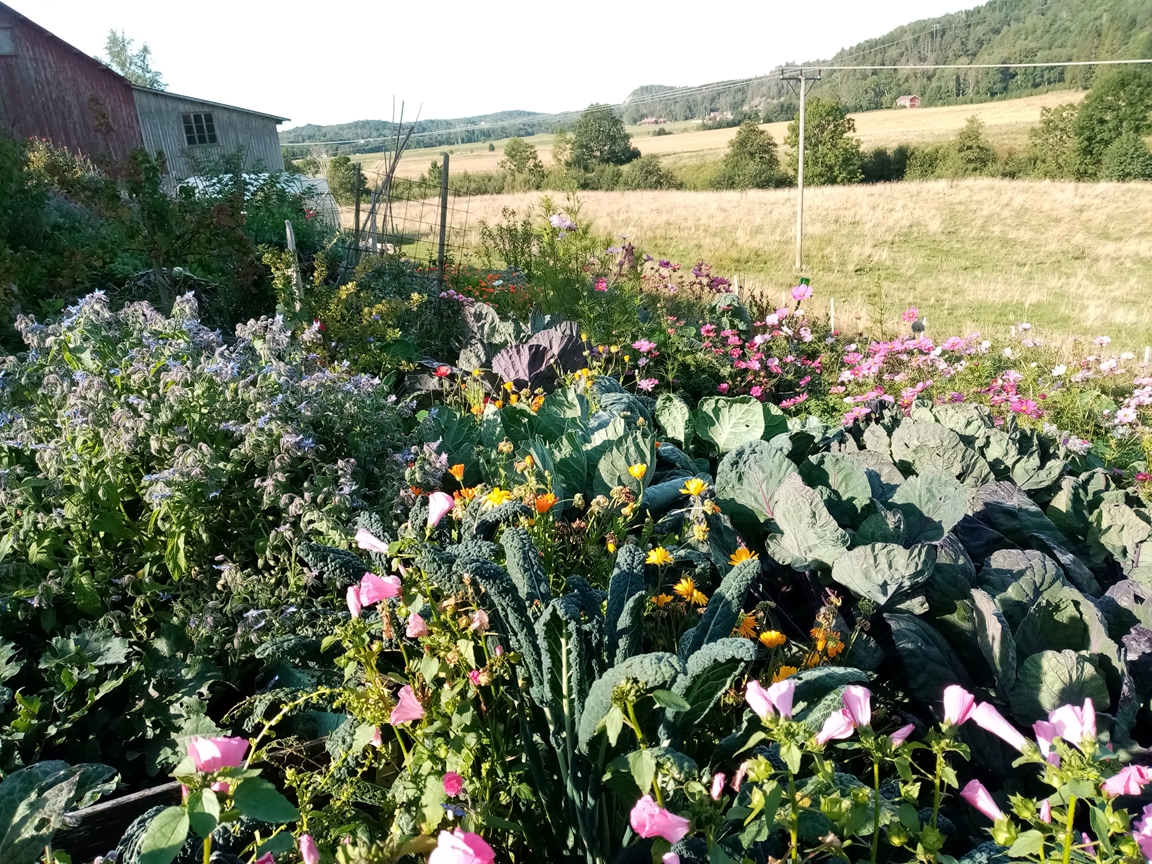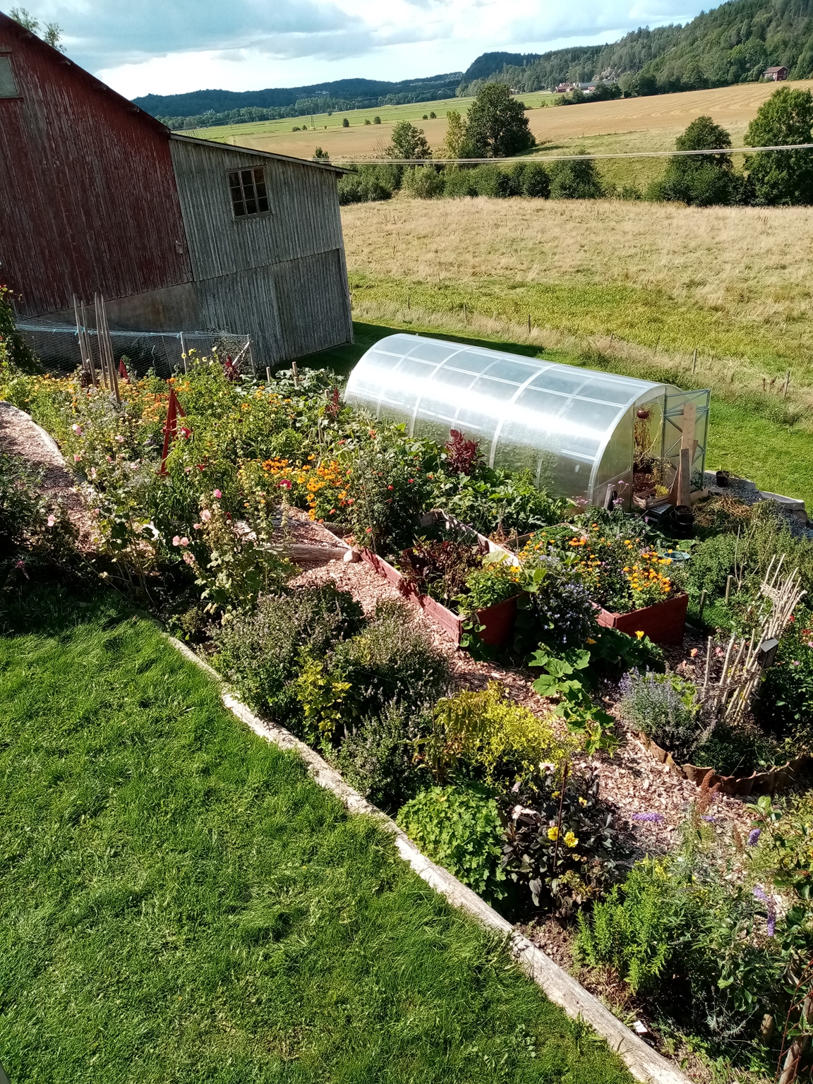En blommande köksträdgård där vi odlar grönsaker för självhushåll blandat med mycket blommor och perenner, rosor, bärbuskar och fruktträd. Vid trädgården ligger även hönshuset med utegård och så har vi 3 bisamhällen i närheten av trädgården. Trädgården anlades 2018, (förut fanns här bara en vilduxen slänt och en liten klippt gräsmatta närmast huset) och är fortfarande under uppbyggnad. Odlingarna ligger i en slänt och odlingsbäddarna är anlagd som terasser, man har fantastiskt utsikt över kohagen, åkrar med berg och skogen i bakgrunden. Vi odlar även i 2 växthus, ett tunnelväxthus på 18 m2 och ett hembyggt på ca 10 m2.