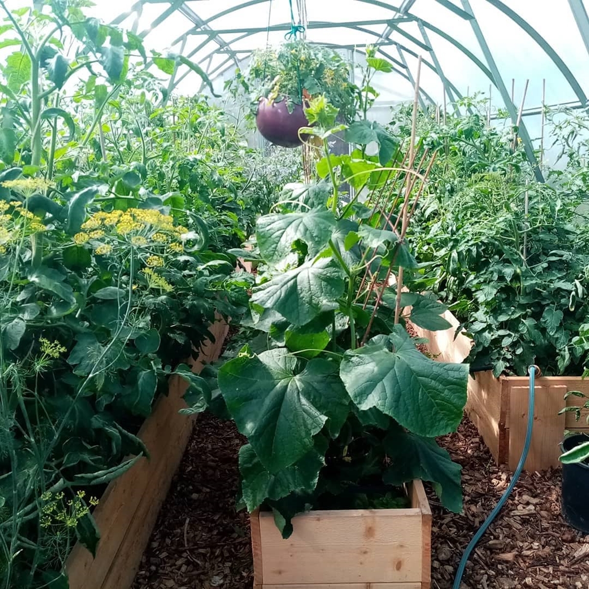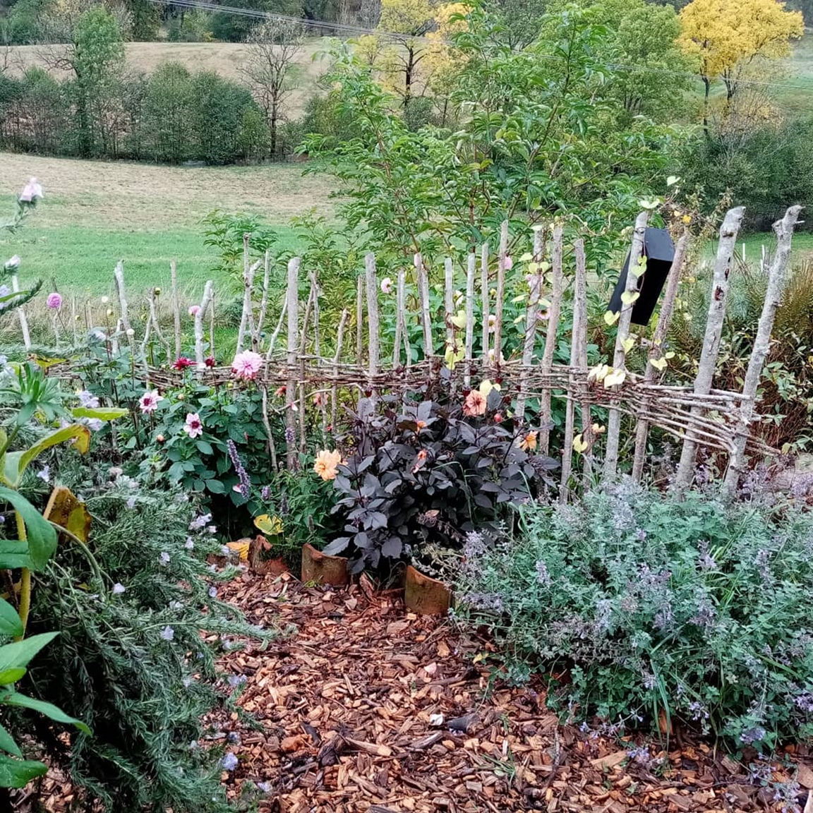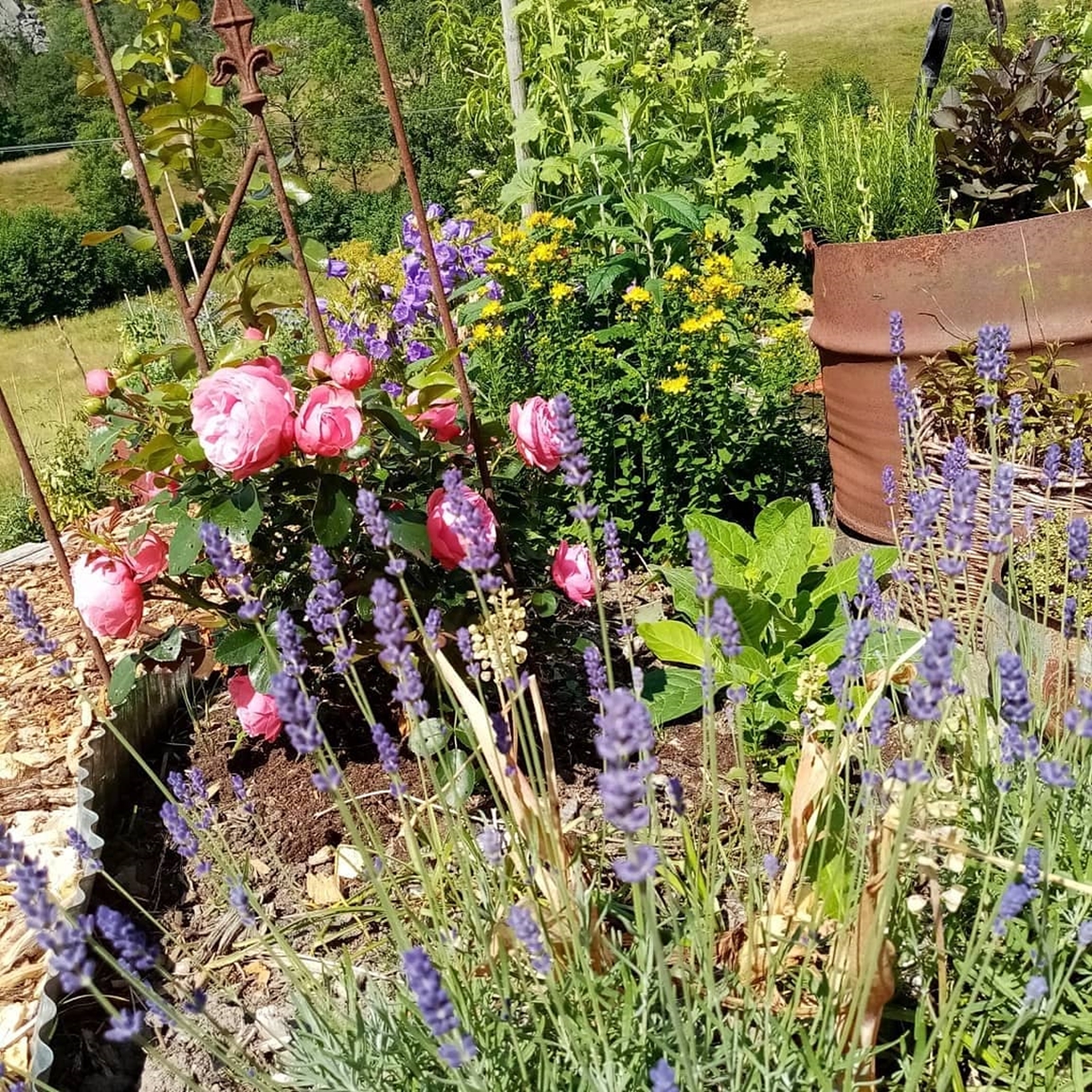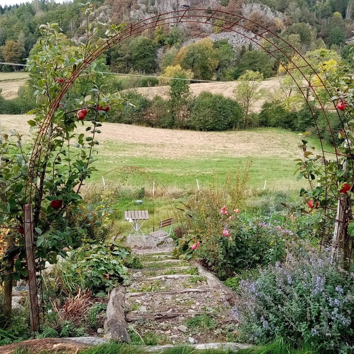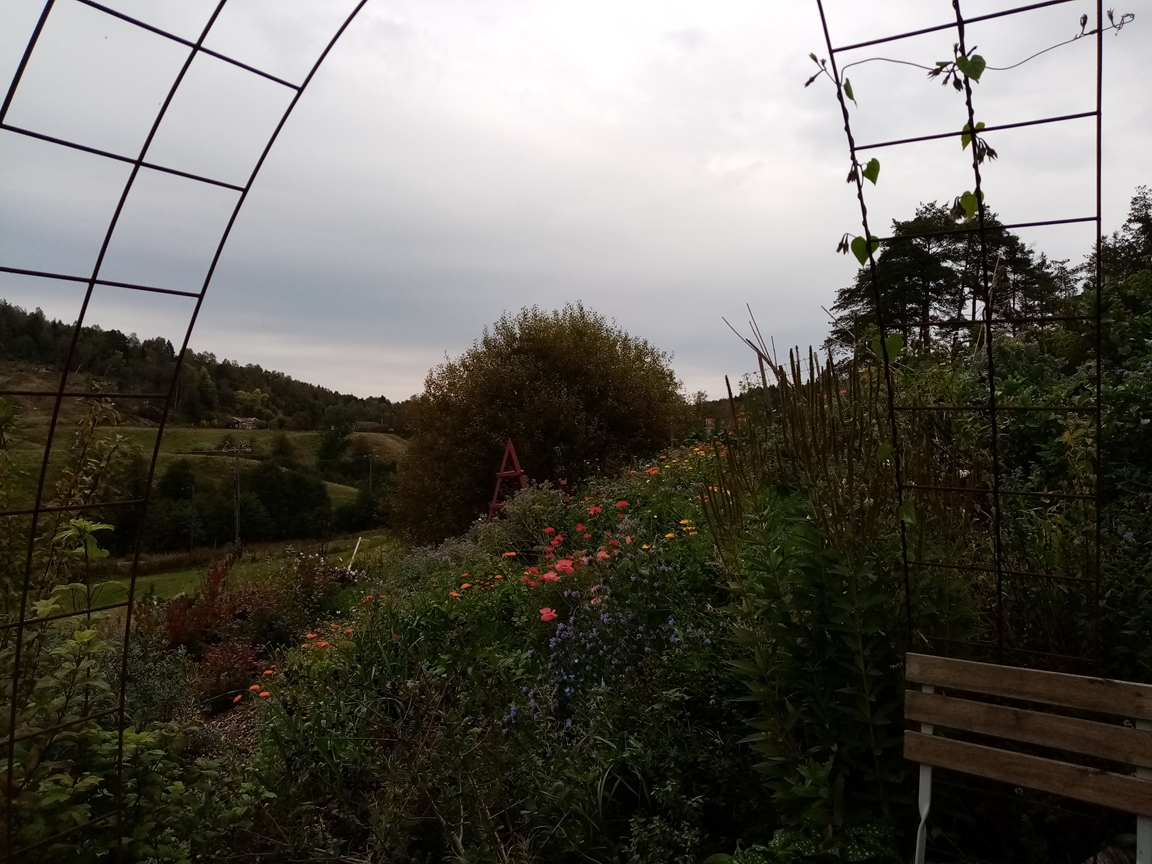 En blommande köksträdgård där vi odlar grönsaker för självhushåll blandat med mycket blommor och perenner, rosor, bärbuskar och fruktträd. Vid trädgården ligger även hönshuset med utegård och så har vi 3 bisamhällen i närheten av trädgården. Trädgården anlades 2018, (förut fanns här bara en vilduxen slänt och en liten klippt gräsmatta närmast huset) och är fortfarande under uppbyggnad. Odlingarna ligger i en slänt och odlingsbäddarna är anlagd som terasser, man har fantastiskt utsikt över kohagen, åkrar med berg och skogen i bakgrunden. Vi odlar även i 2 växthus, ett tunnelväxthus på 18 m2 och ett hembyggt på ca 10 m2.