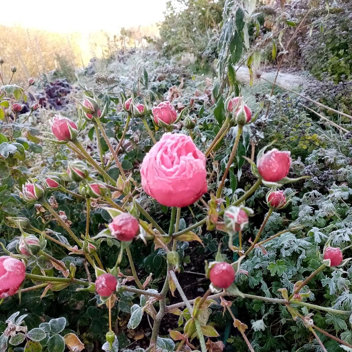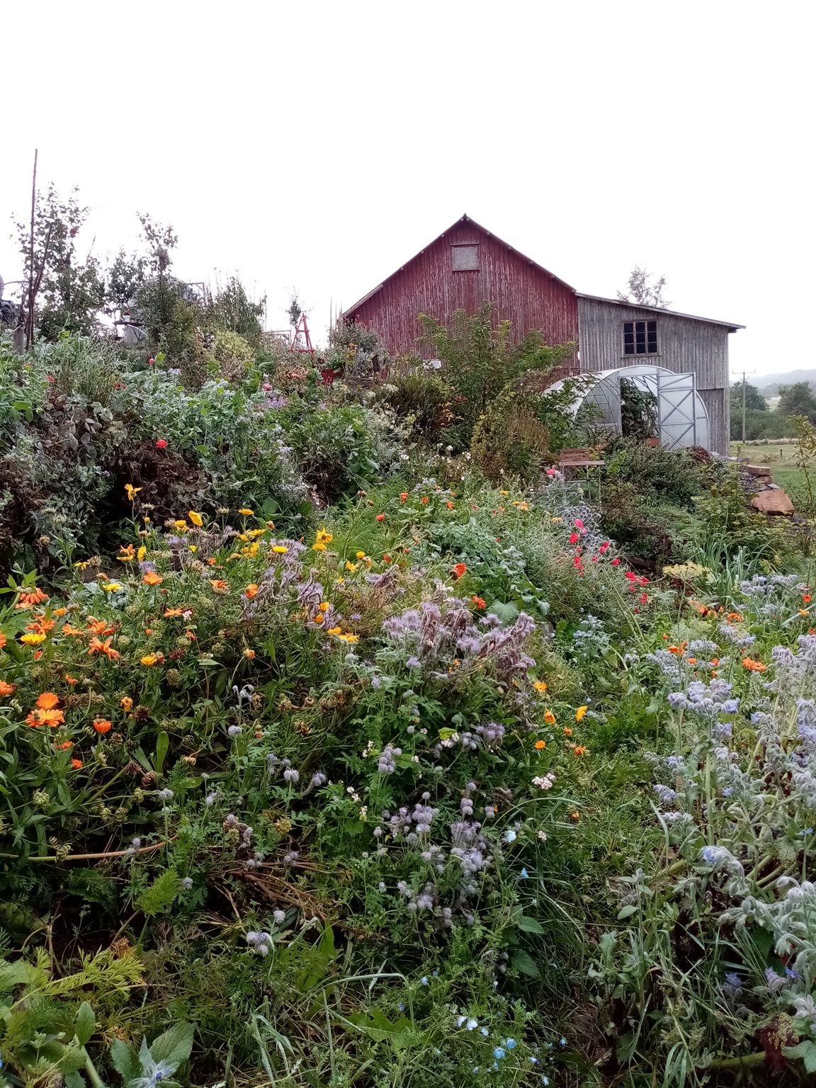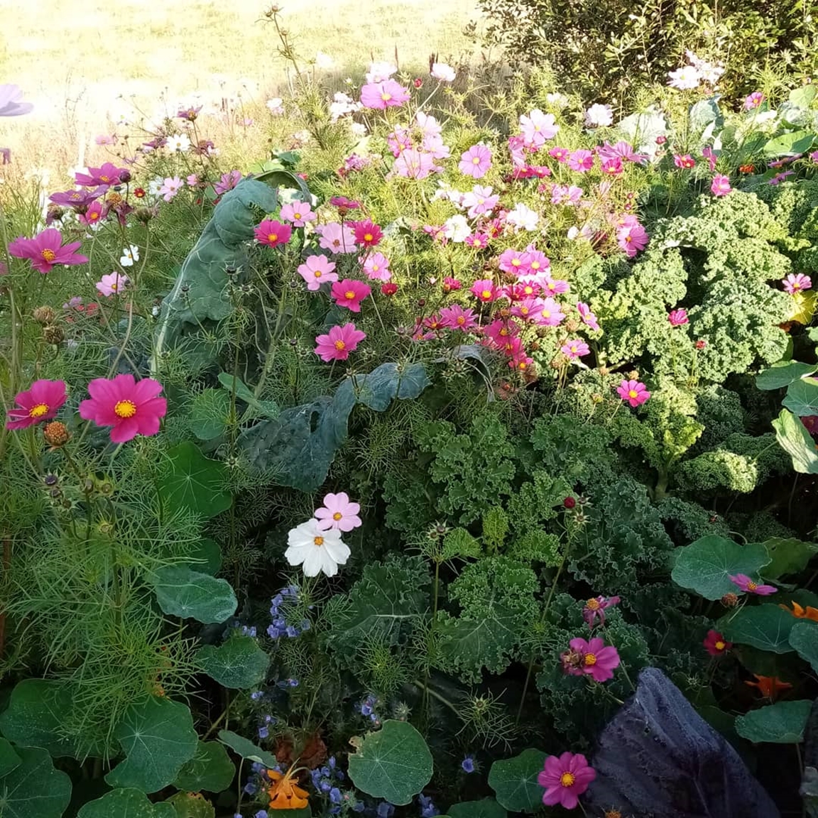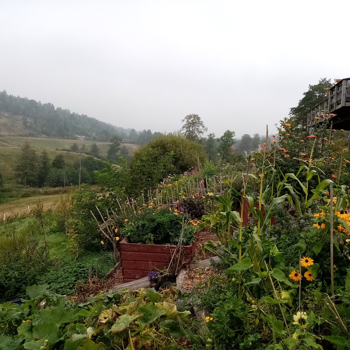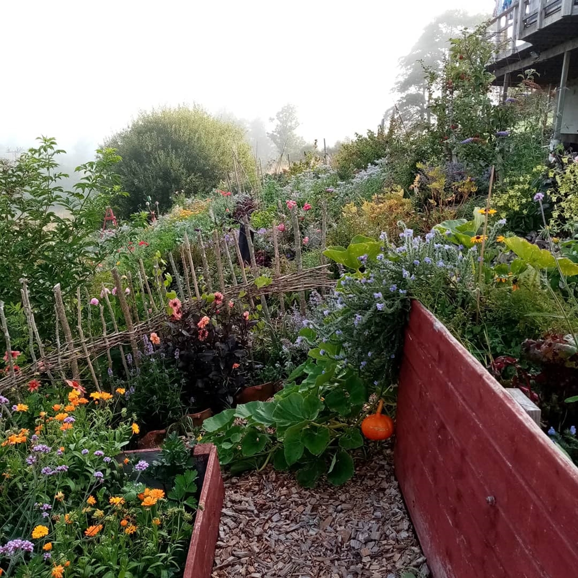 En blommande köksträdgård där vi odlar grönsaker för självhushåll blandat med mycket blommor och perenner, rosor, bärbuskar och fruktträd. Vid trädgården ligger även hönshuset med utegård och så har vi 3 bisamhällen i närheten av trädgården. Trädgården anlades 2018, (förut fanns här bara en vilduxen slänt och en liten klippt gräsmatta närmast huset) och är fortfarande under uppbyggnad. Odlingarna ligger i en slänt och odlingsbäddarna är anlagd som terasser, man har fantastiskt utsikt över kohagen, åkrar med berg och skogen i bakgrunden. Vi odlar även i 2 växthus, ett tunnelväxthus på 18 m2 och ett hembyggt på ca 10 m2.