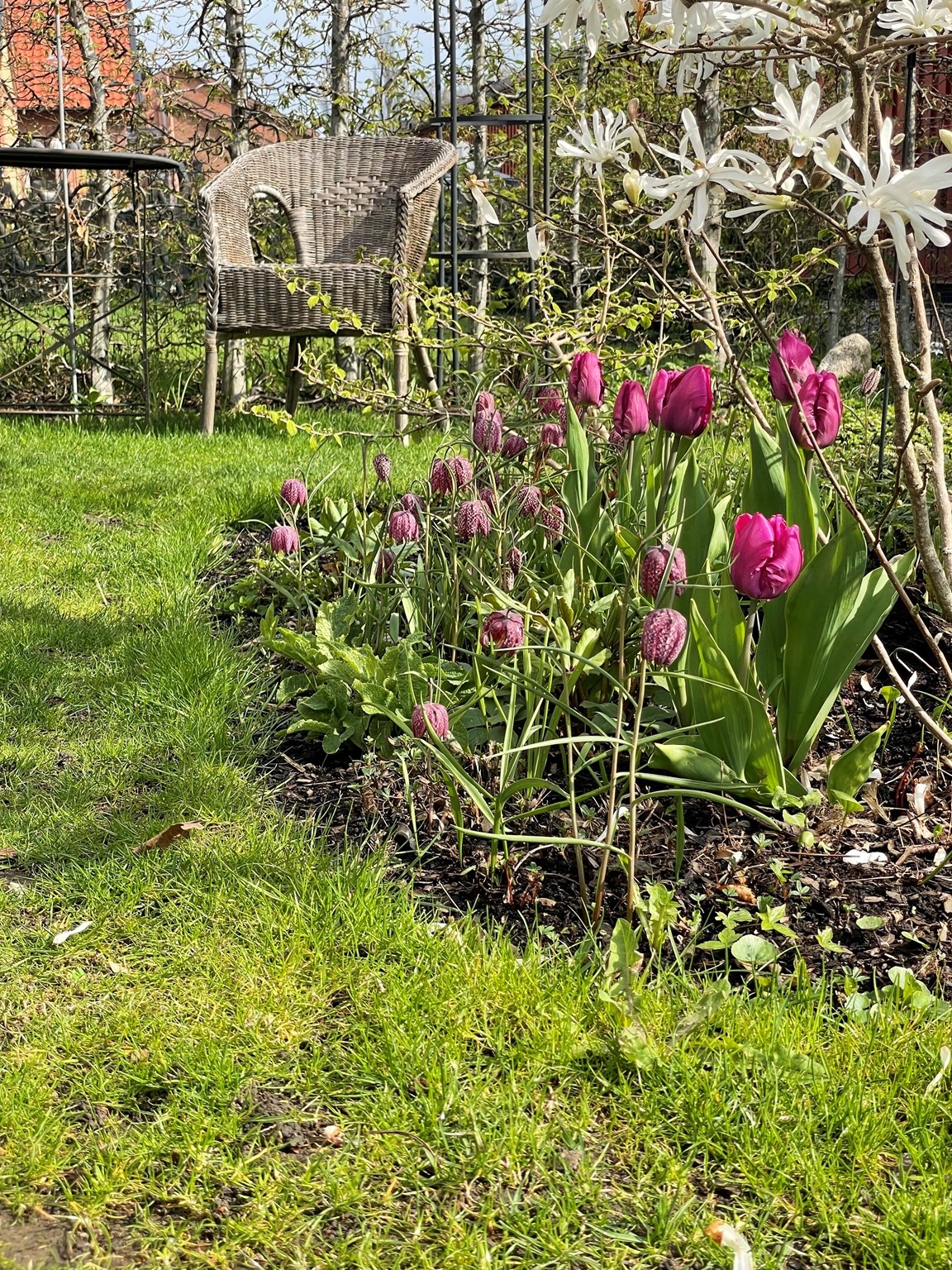 Vi har en liten trädgård med framförallt perenner. Vår cirka 100 m2 lilla trädgården ligger i söderläge och är omgiven avenbokshäckar och husväggar så troligen är det ofta zon II som råder här. Runda former, färgstämda rabatter och små träd utgör stommen i trädgården som är planerad för att klara sig "på egen stjälk". Vi har också valt växter som attraherar humlor, bin och fjärilar och vi vill gärna locka hit både småfåglar och igelkottar.