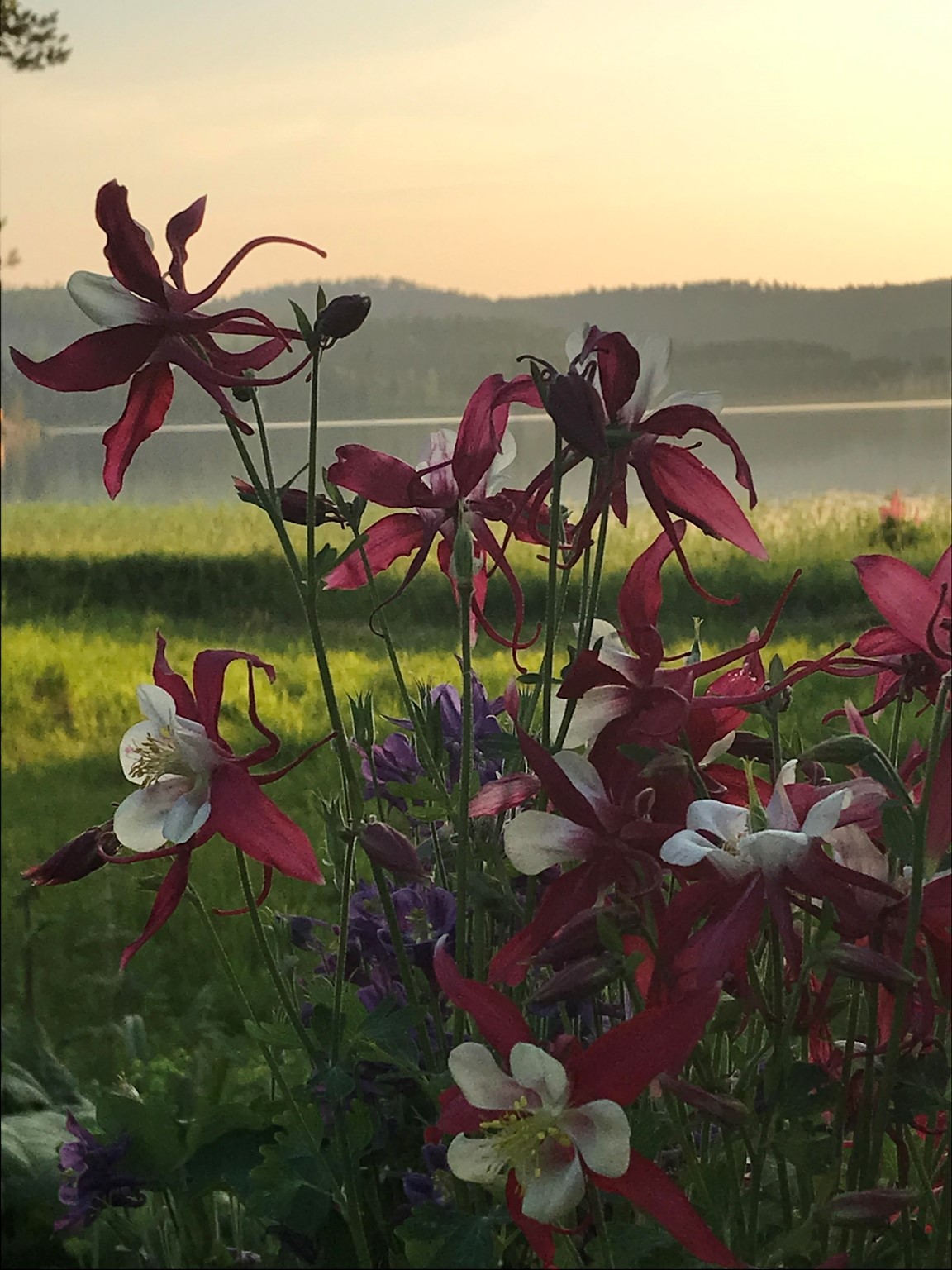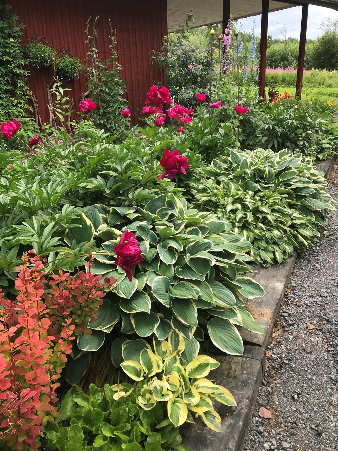 Mina favoritblommor är liljor och Akleja samt hosta som finns lite överallt i trädgården men jag gillar också det vilda så prästkragar plockar jag aldrig bort ur rabatterna. Det är jag som odlar och gräver och det är min man som bygger det jag hittar på.