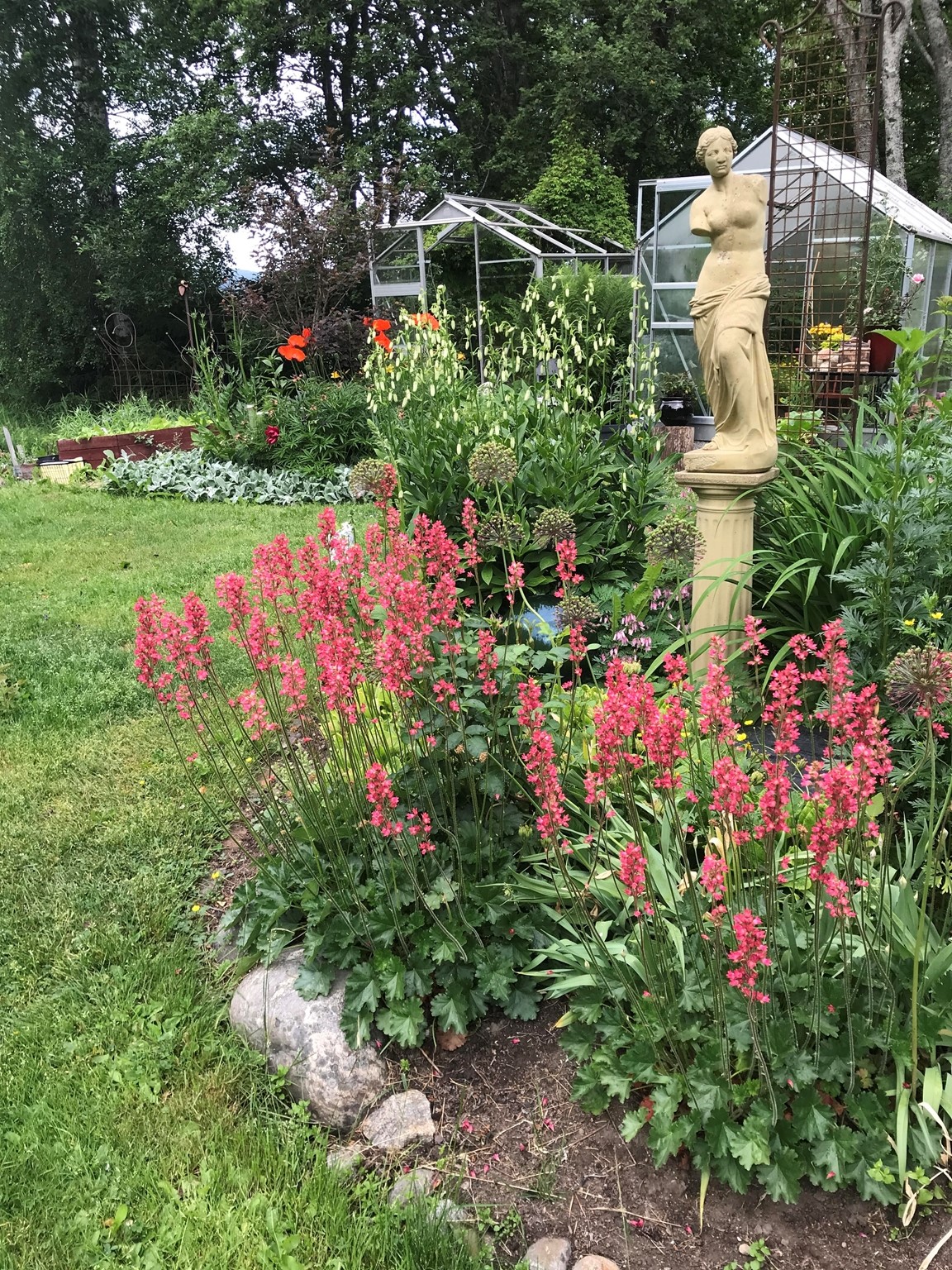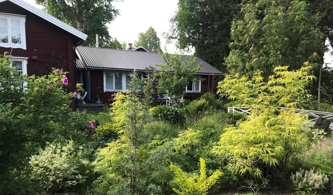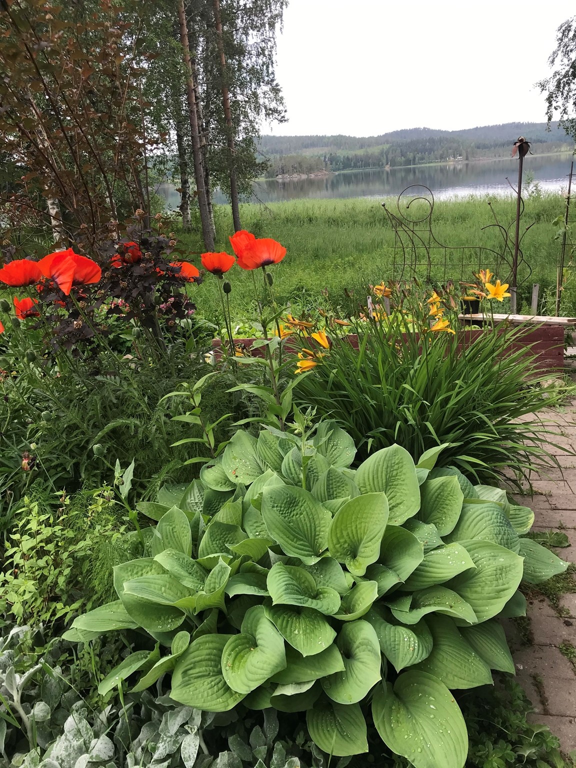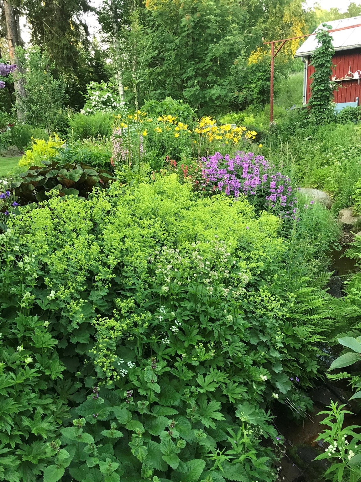 Vår trädgård ligger vid en sjö och har en bäck som rinner gemom tomten, jag försöker jobba med naturen och ha kvar en del stora träd som fanns här från början då tomten bestod av skog och sten. Tomten är på ca 1500 kvm . Vi har lagt upp sten längst bäckkanten och byggt rabatter runt dessa. Bäcken går full med vatten ända upp under broarna ibland så det går inte alltid att gräva längst med slänten utan jag har försökt rensa bort gräs för att det naturliga ormbunkarna ska komma fram i stället, ett ständigt pågående jobb.