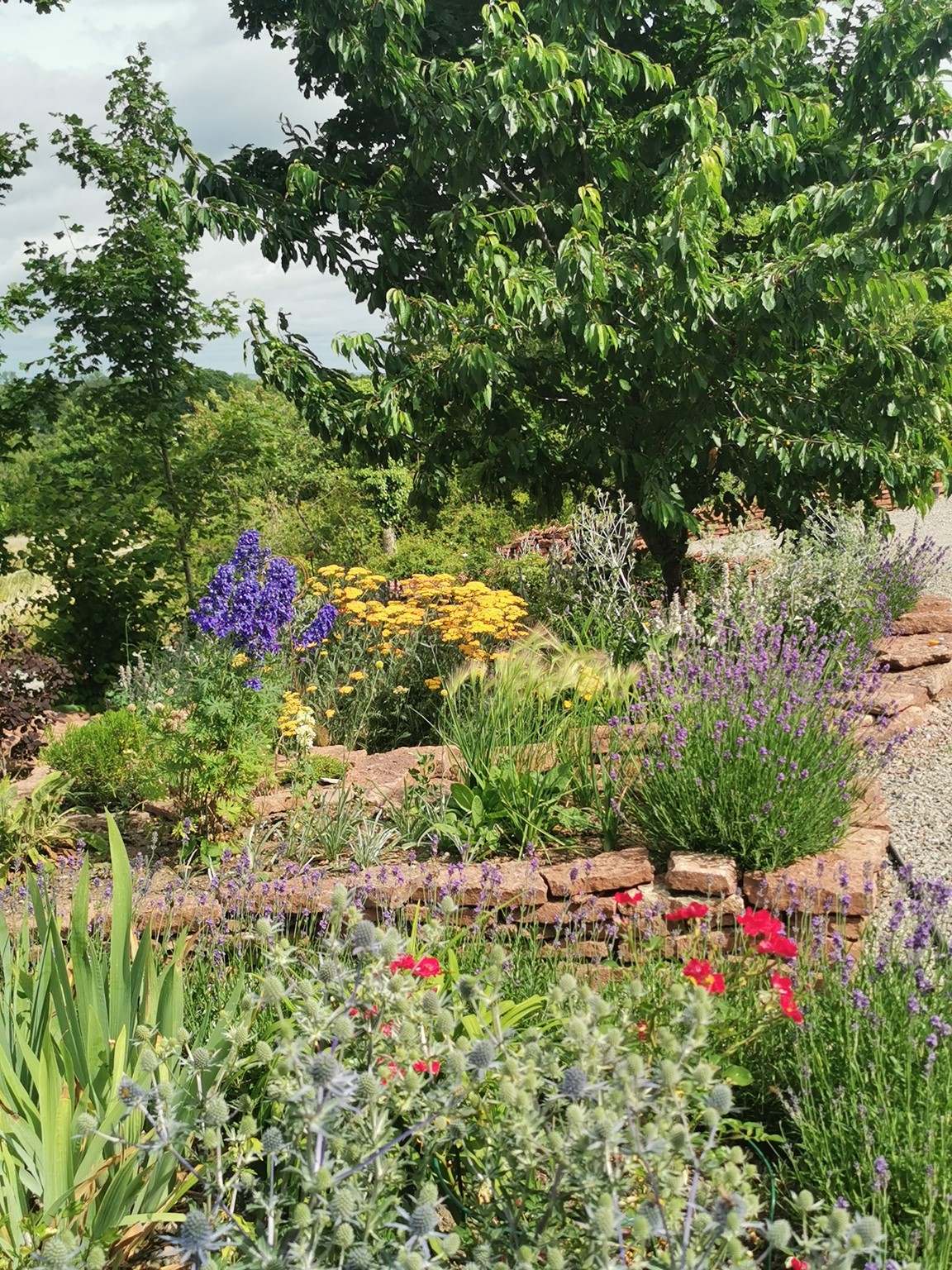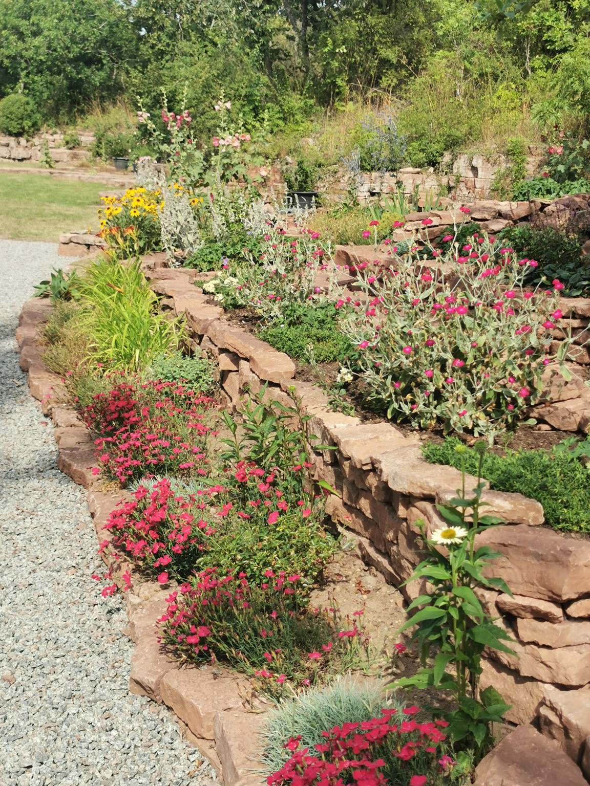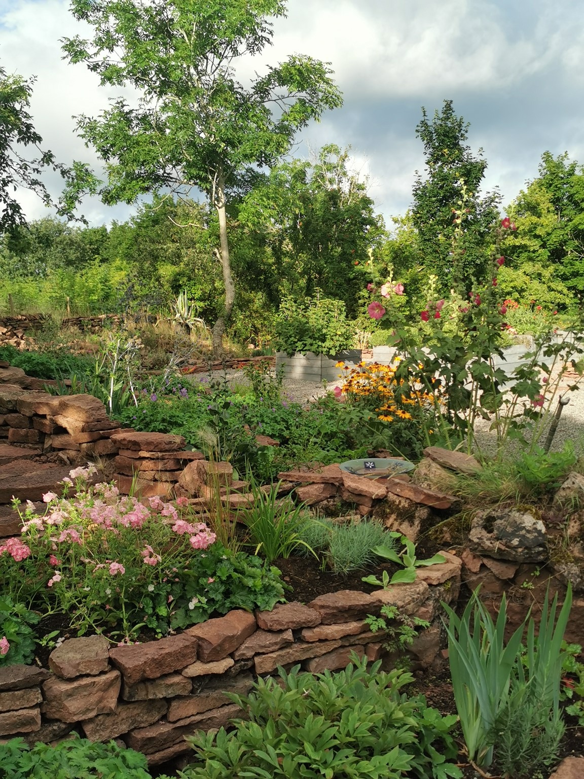 En ny trädgård på kanten av landborgen med vacker utsikt över Kalmar sund, där det vilda möter det tuktade. De flesta rabatterna är uppbyggda av kalksten. Här finns rosor, perenner, buskar och träd.
