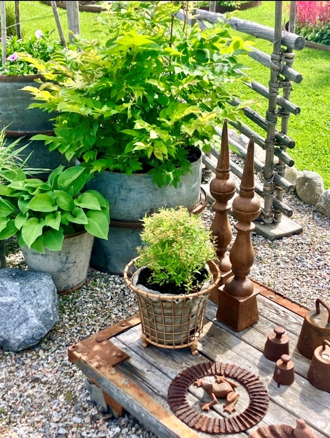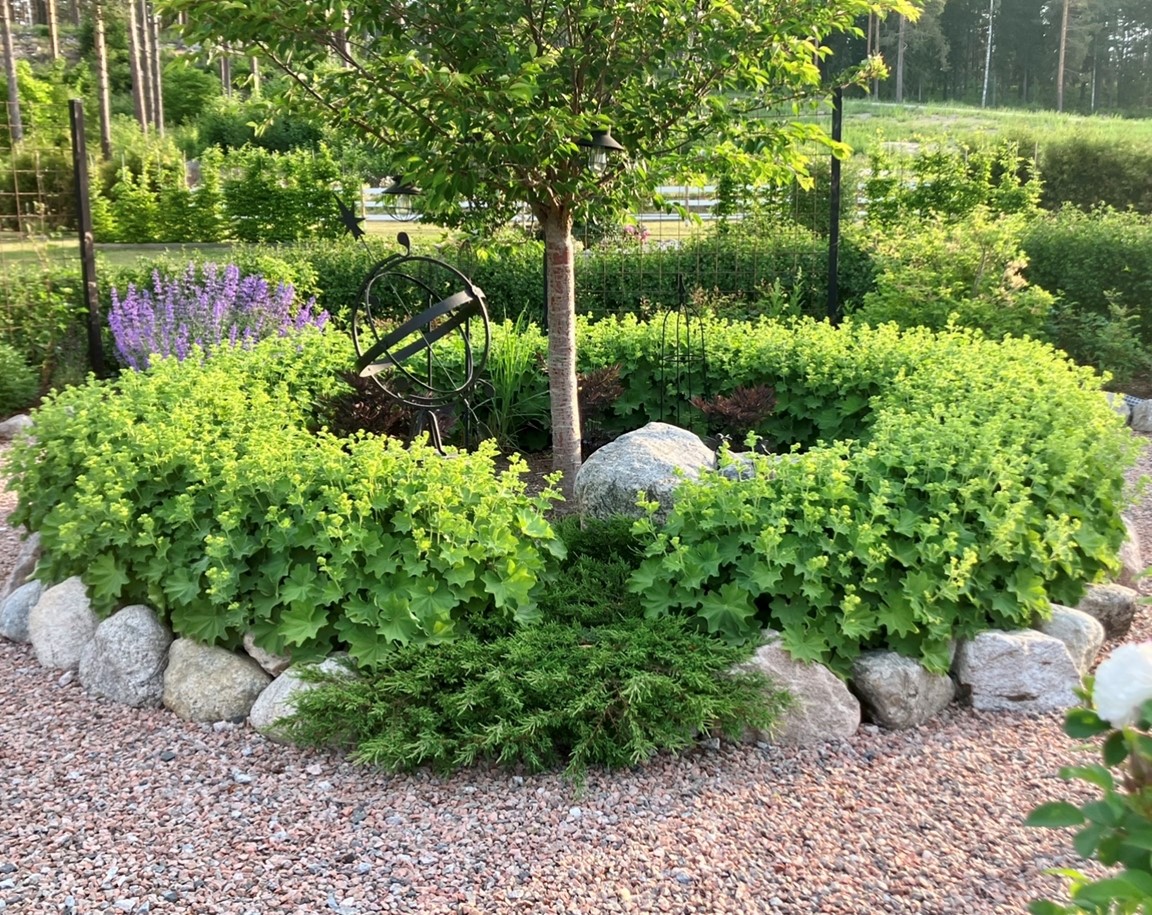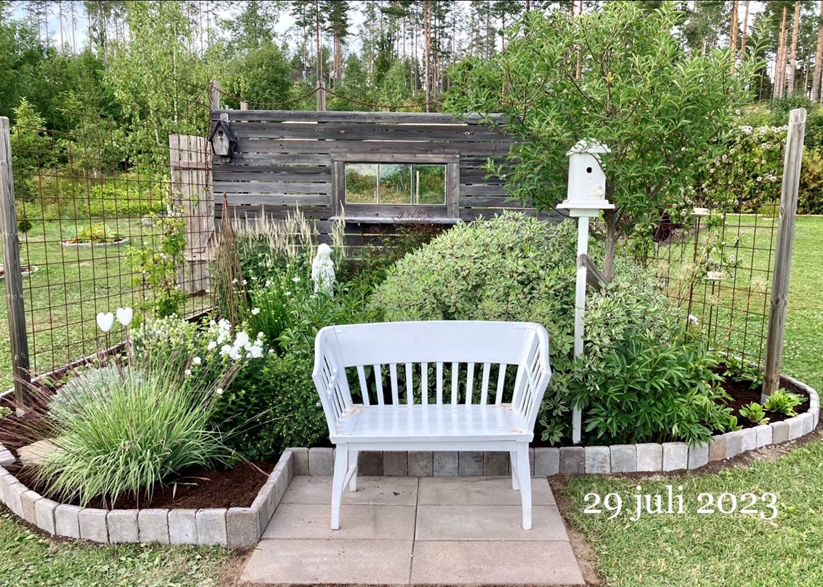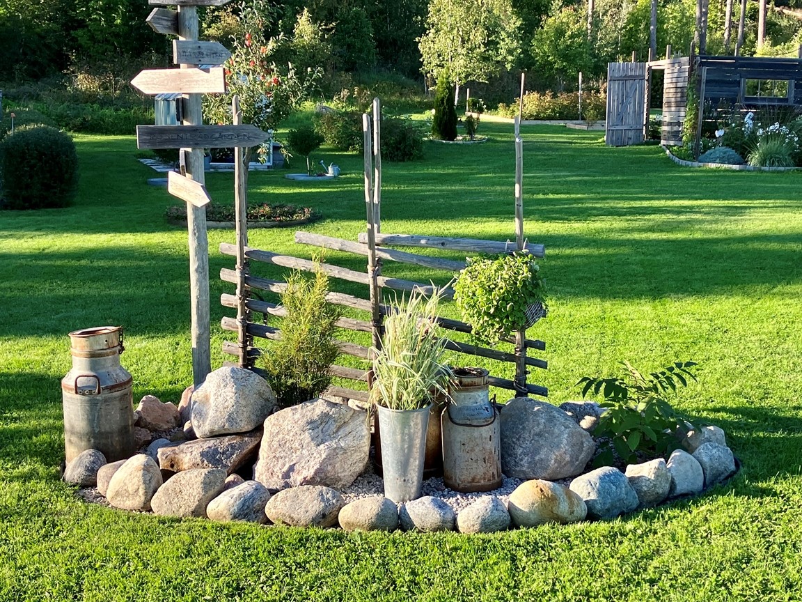 En stor trädgård på ca 10,000 kvm som var helt tom då vi flyttade hit 2016. För varje år så utvecklas trädgården med flera olika planteringar och byggprojekt. Här finns bl.a. Köksträdgård, stenparti, pergola, vita rabatten med sin rustika plankvägg, rosenträdgården m.m. Valet av perenner, buskar och träd går lite åt det romantiska, gammaldags hållet och kombineras med detaljer i rustikt trä och rostiga prylar.