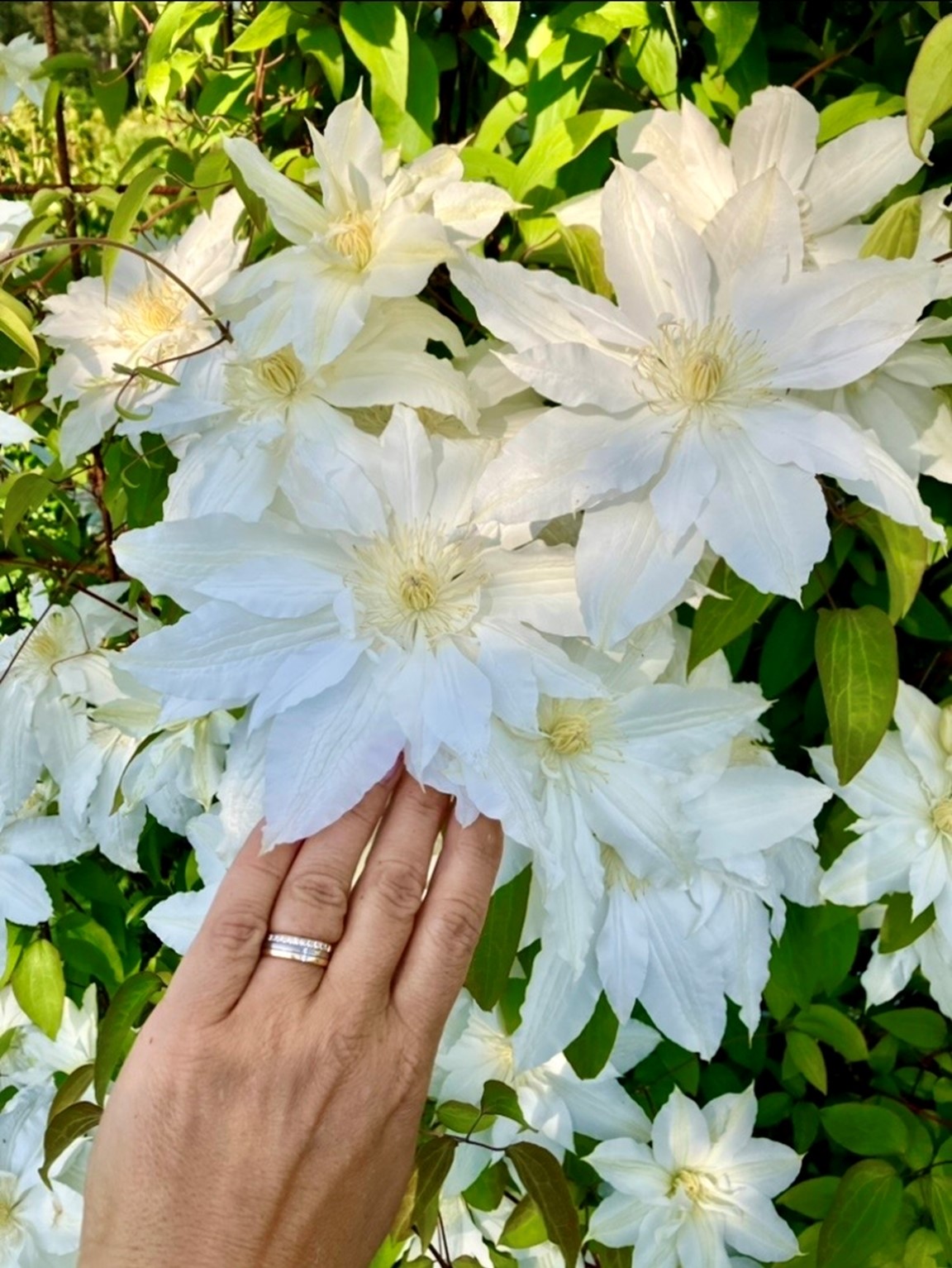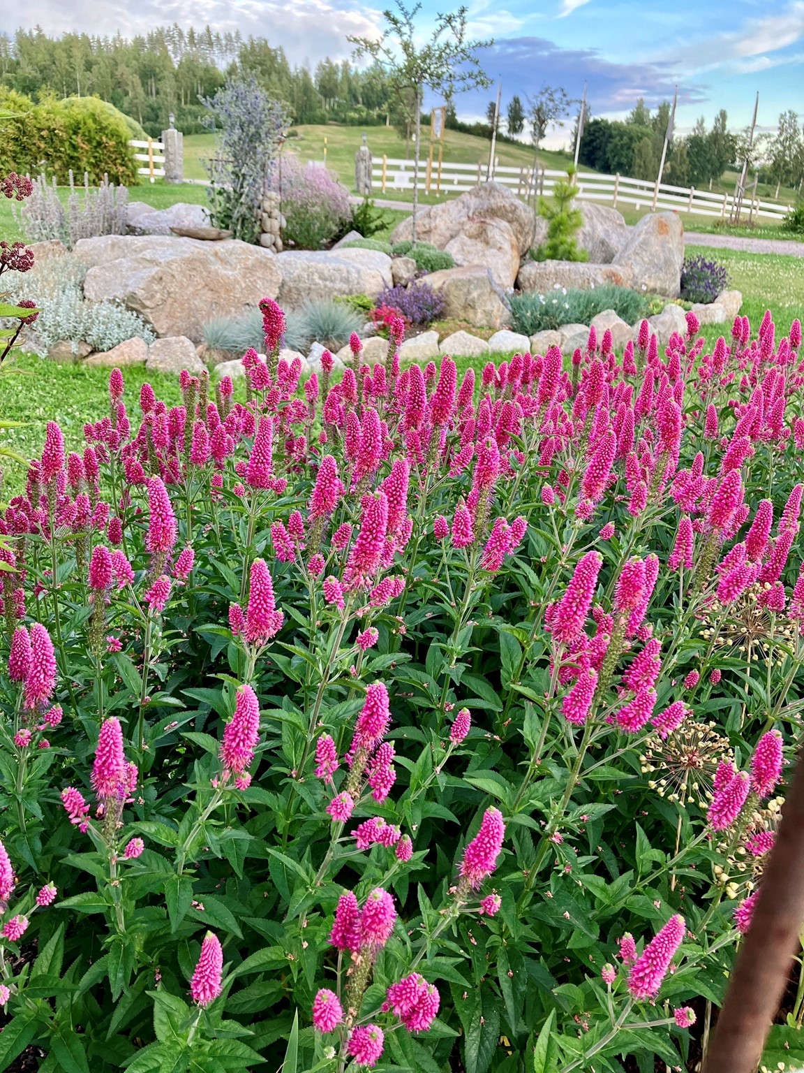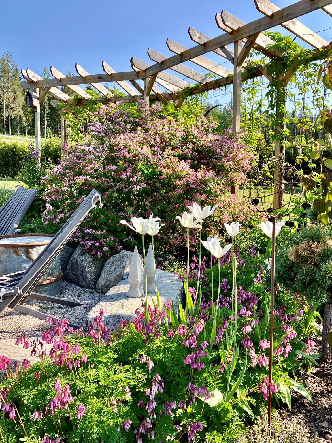 En stor trädgård på ca 10,000 kvm som var helt tom då vi flyttade hit 2016. För varje år så utvecklas trädgården med flera olika planteringar och byggprojekt. Här finns bl.a. Köksträdgård, stenparti, pergola, vita rabatten med sin rustika plankvägg, rosenträdgården m.m. Valet av perenner, buskar och träd går lite åt det romantiska, gammaldags hållet och kombineras med detaljer i rustikt trä och rostiga prylar.