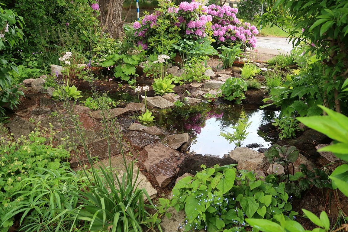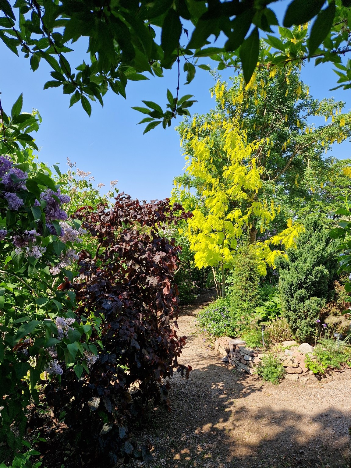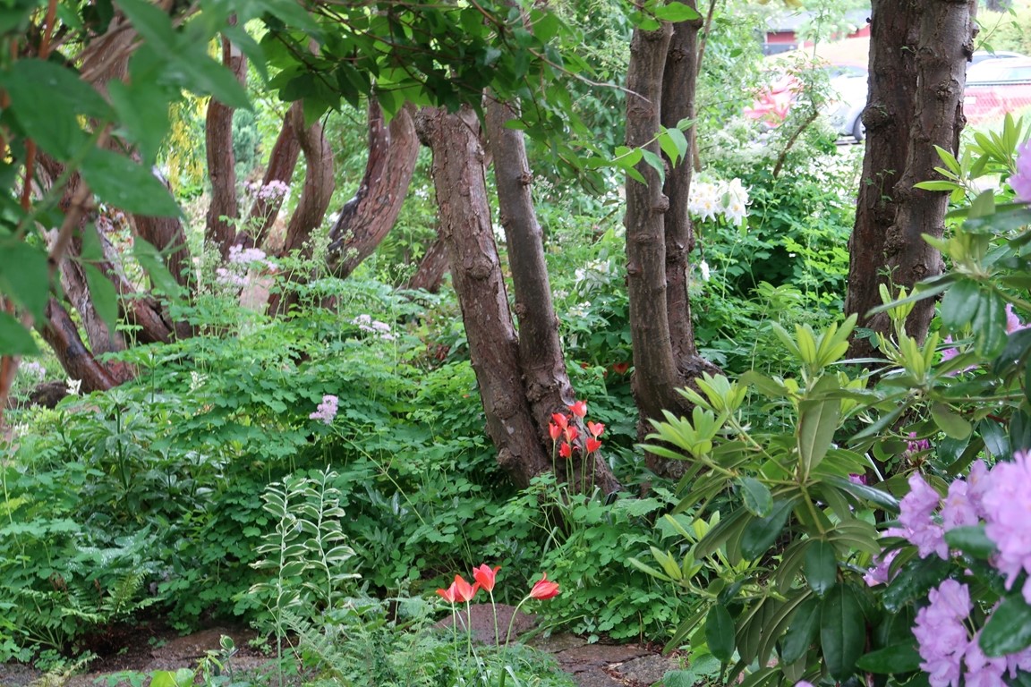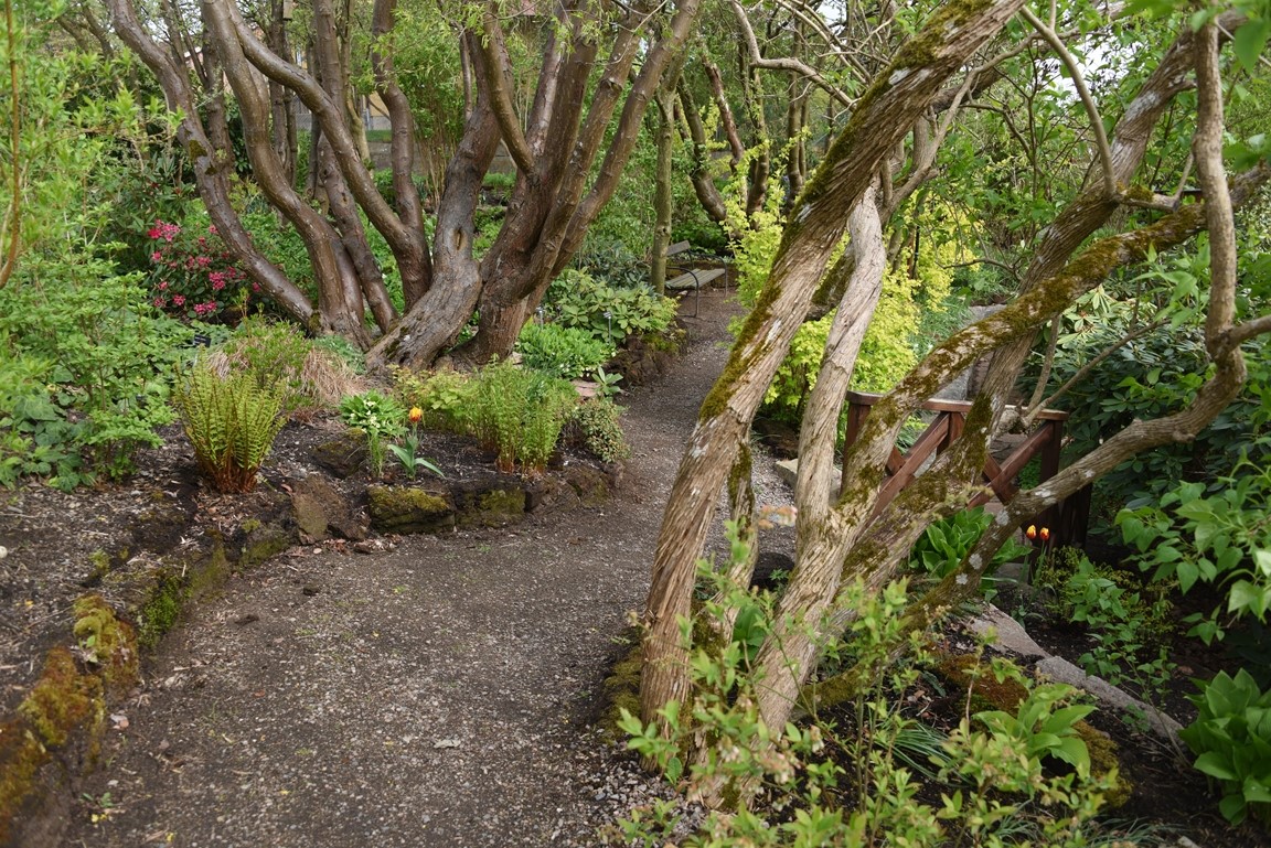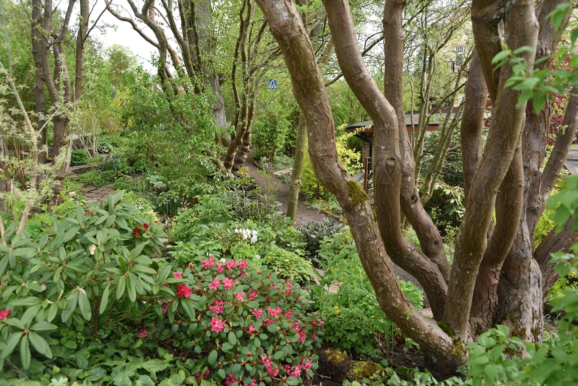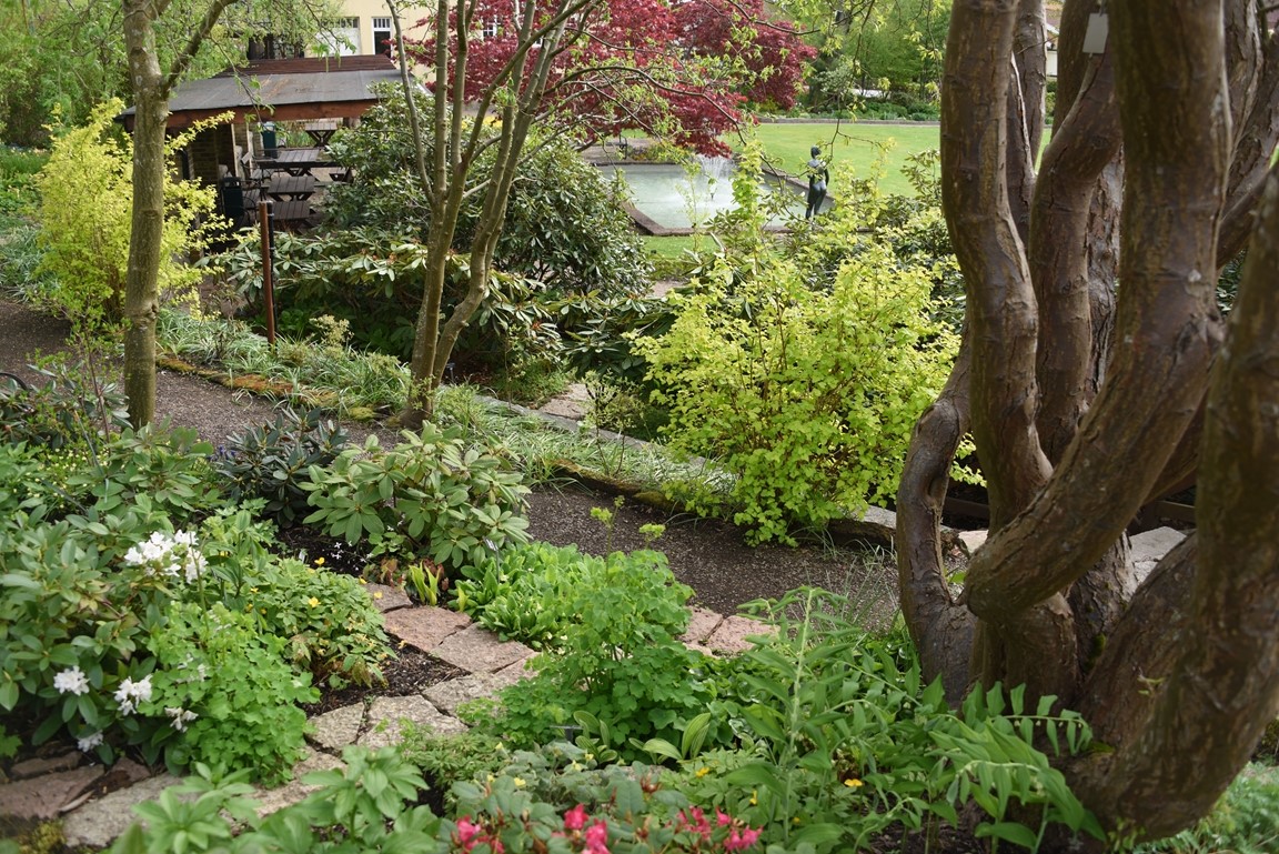 Klassiska trädgårdselement med rabatter i samklang med flera nyskapande, skiktade lundmiljöer med ovanliga träd, buskar och perenner. Många ovanliga växter.