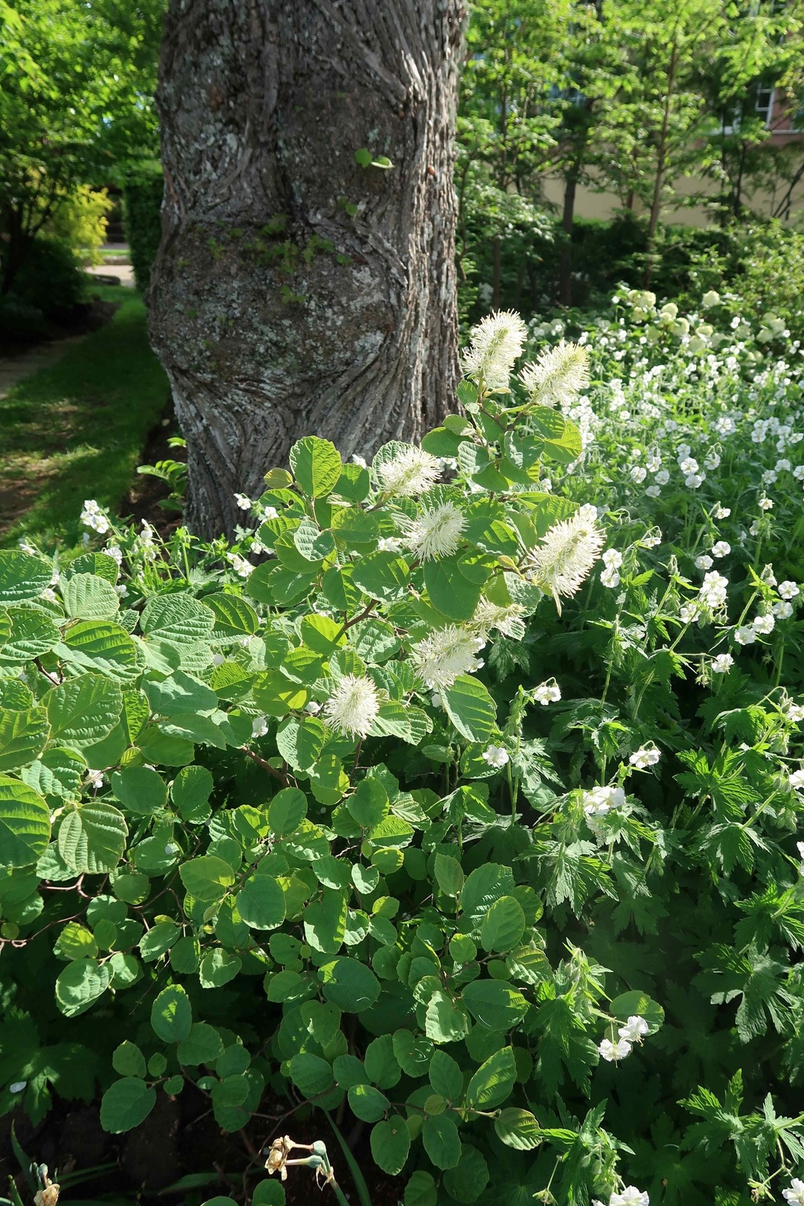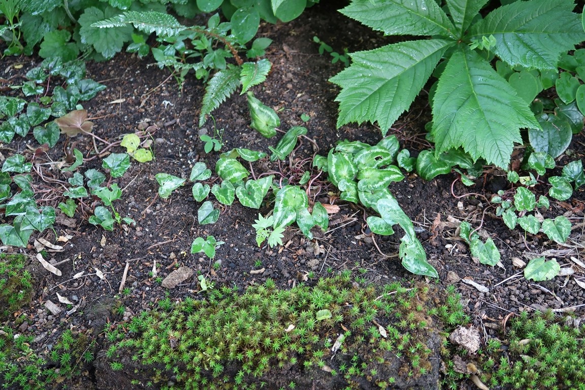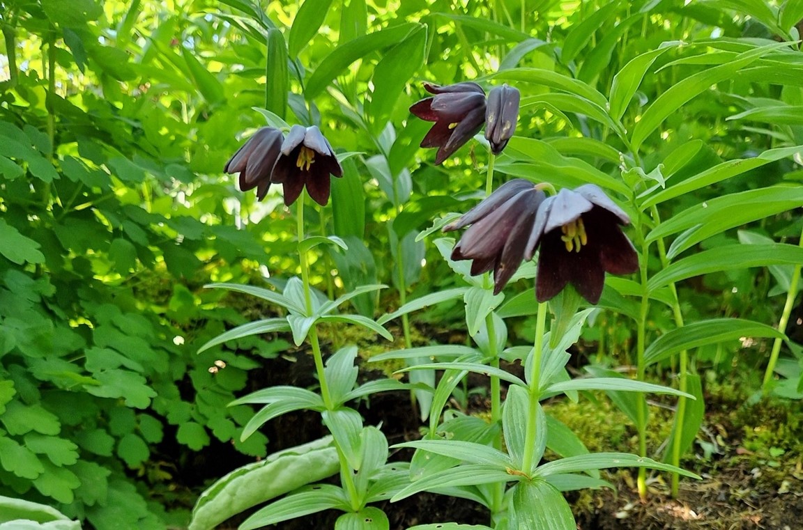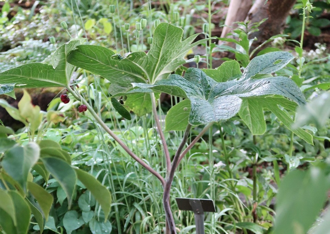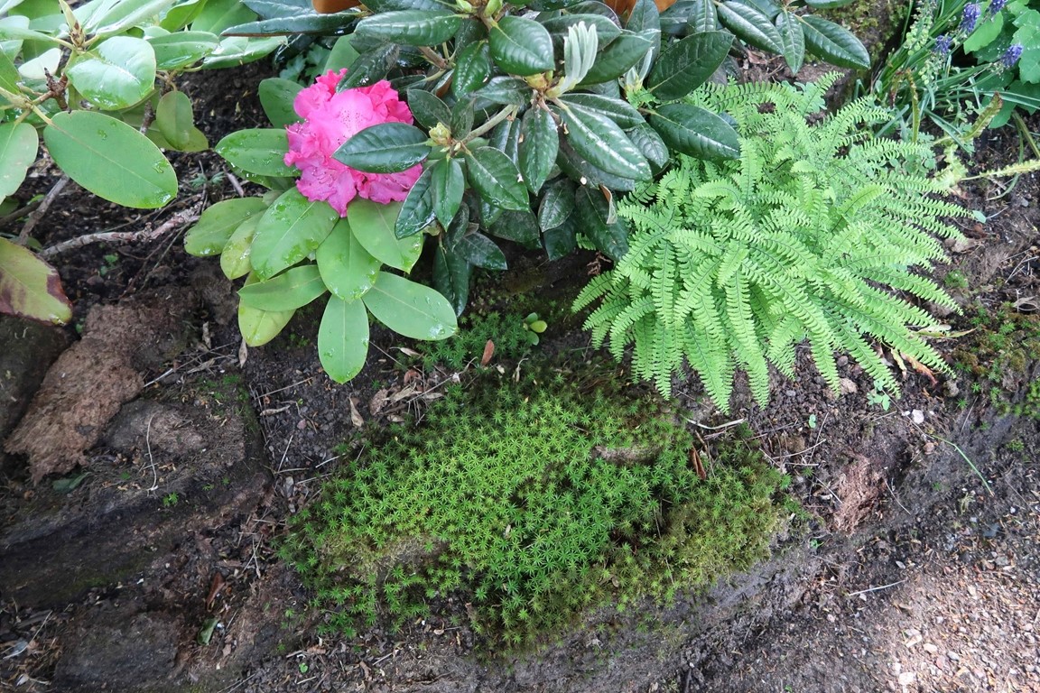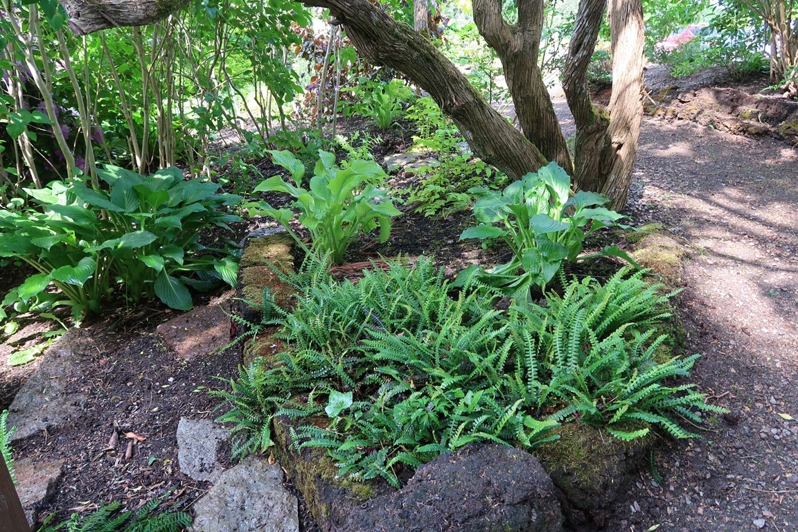 Klassiska trädgårdselement med rabatter i samklang med flera nyskapande, skiktade lundmiljöer med ovanliga träd, buskar och perenner. Många ovanliga växter.