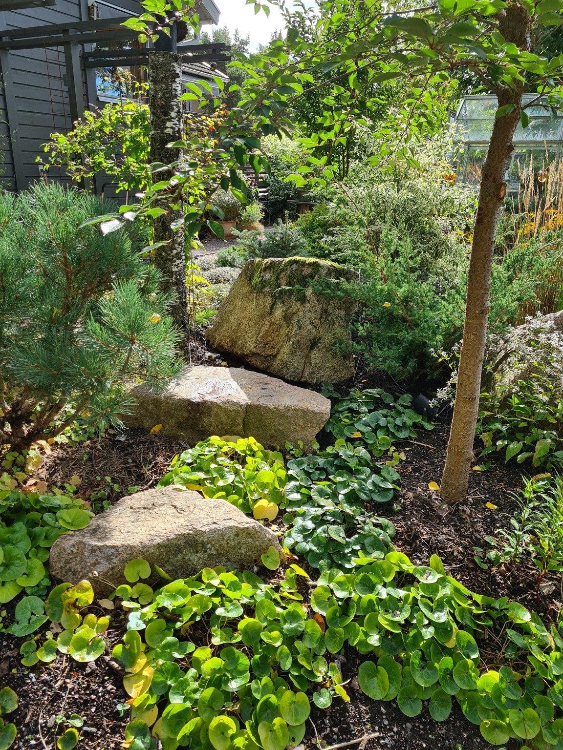 Baksidan mot norr består av en sluttande skogsbacke. Där hittar man rhododendron, ormbunkar och magnolior, men även en hel del blåbär. Vi har flera vilda träd såsom tall, gran, ek och sälg. Känslan här är helt annorlunda mot framsidan.