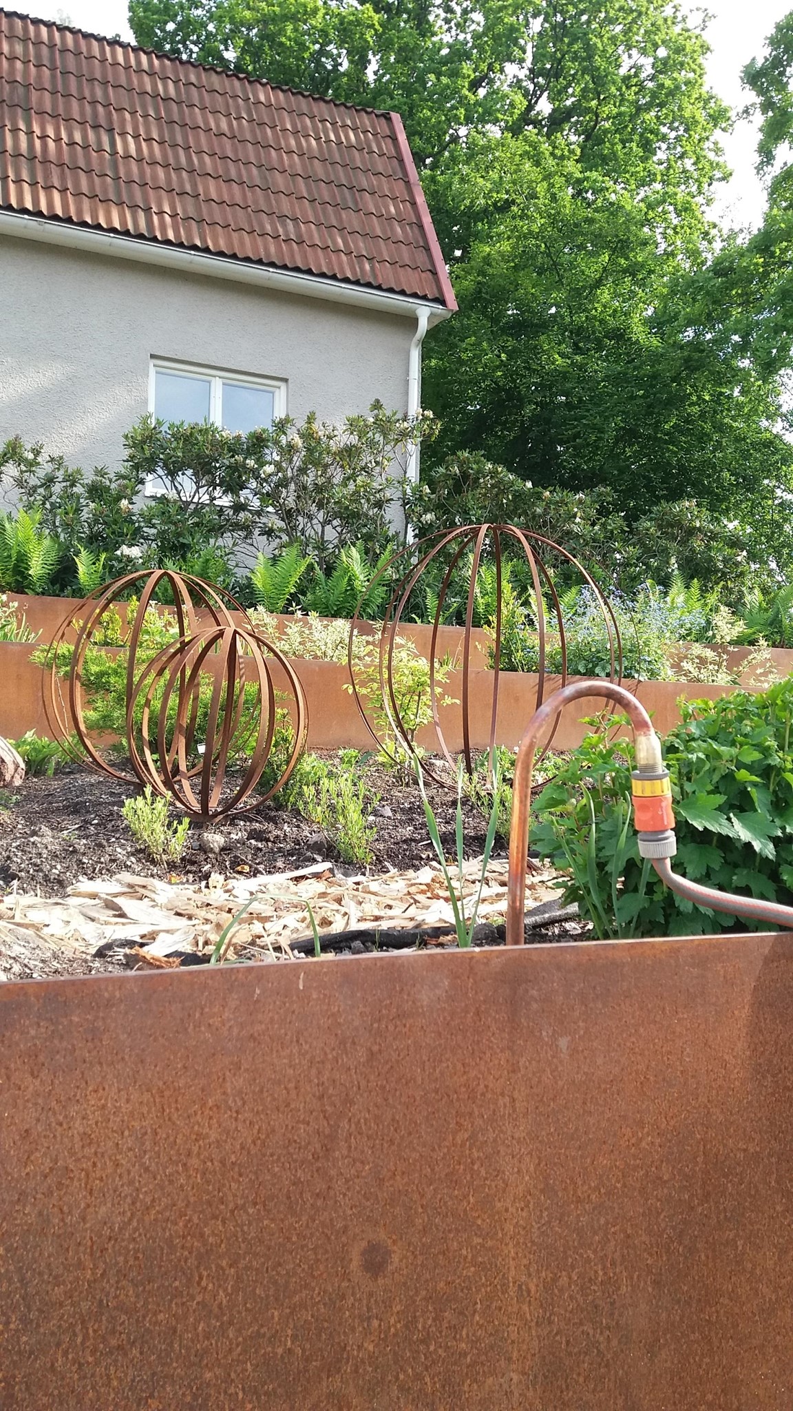 Inramning av rabatter, växtstöd och terrassering har vi gjort av corten.
