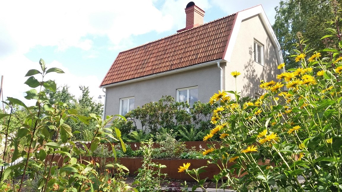 Woodland under en ek, perennberså, fjärilsstig, köksträdgård och en lummig uteplats i skuggan av en bok. Vi har anlagt naturliga gångstråk mellan trädgårdsrummen och stenläggning runt huset av återanvänd ölandssten från trädgårdar i Stockholm.