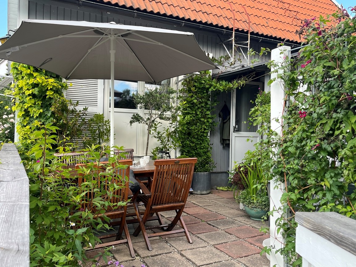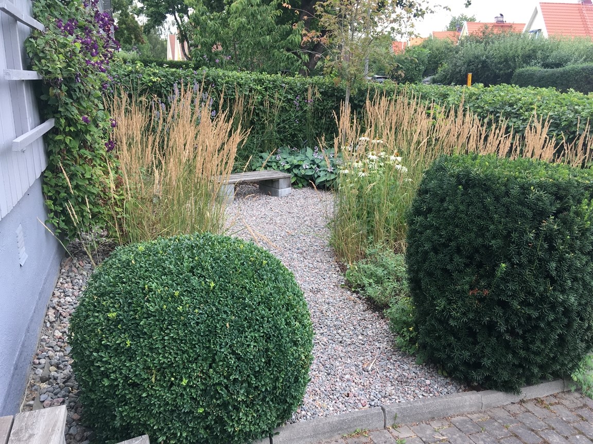 Sedan 30 år och som tredje generation förvaltar vi en hörntomt på 450 kvm vilken finns i ett kedjehusområde (byggt 1951) intill Örby slott i Älvsjö. Mormor äppelträd och häckar bidrar ännu till dess grundstomme och karaktär. Vi har fört in vår generations former, träd, växter och material men även satsat på en belysa -både för trivsel och funktion.