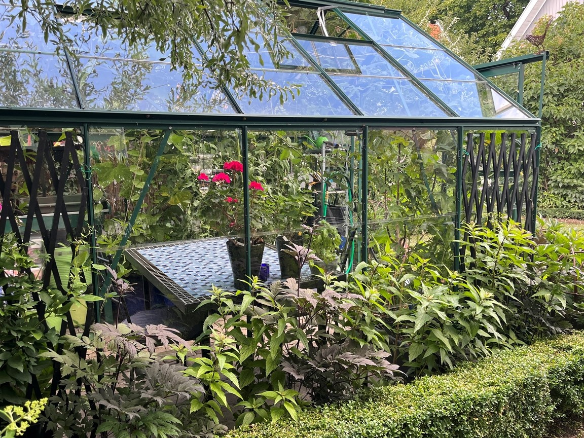På framsidan är välkomnar entré med sitt ”gräsrum”. På husets andra sida där uppfarten finns, hittas växthus, köksträdgård med kryddland, långa rabatter, gräsmatta, hemligt rum för skyddade bad i vår badtunna, hörnorna med damm respektive kompostområdet samt altanen med uteköket och medelhavsväxter