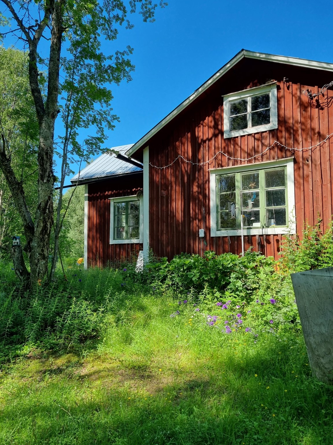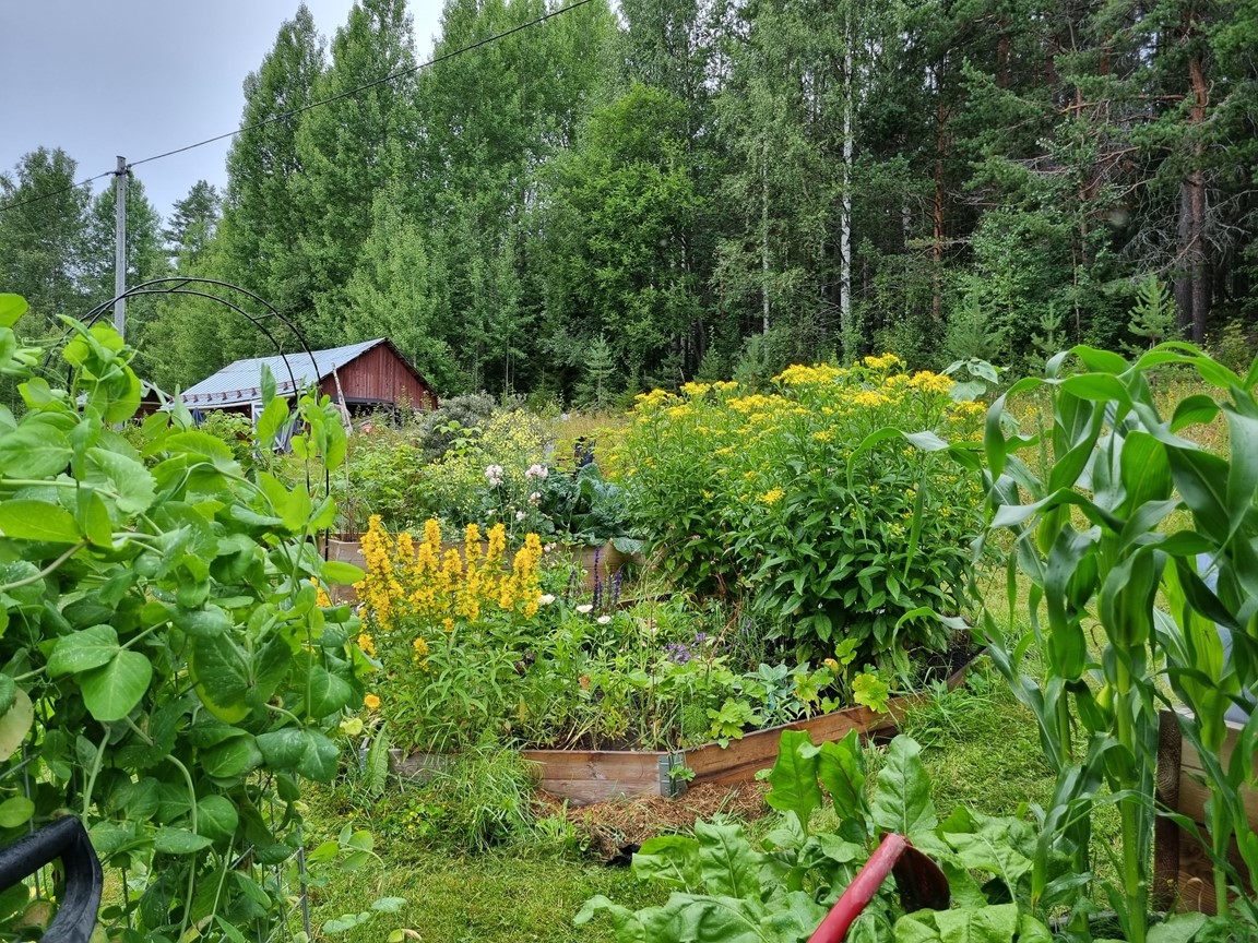 Ett torp som har trädgård under uppbyggnad. Där både träd, grönsaker och blommor intresserar oss.