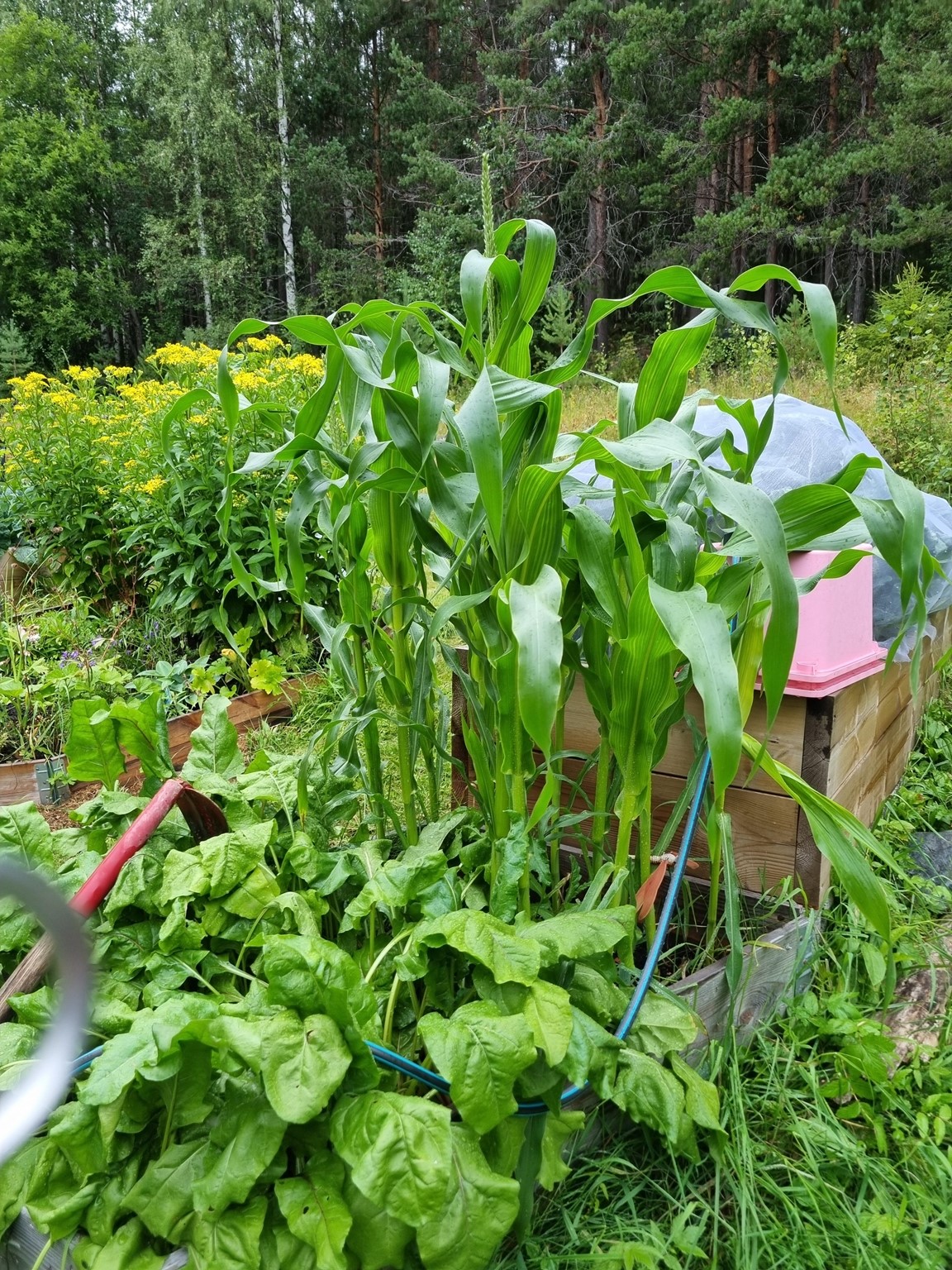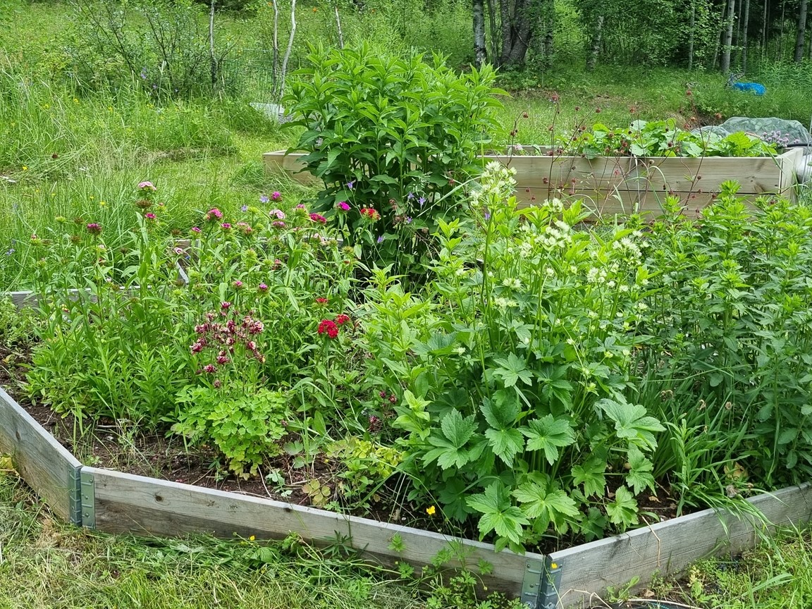 bärbuskar, grönsaker och blommor i naturnära miljö inbäddat i skogsglänta