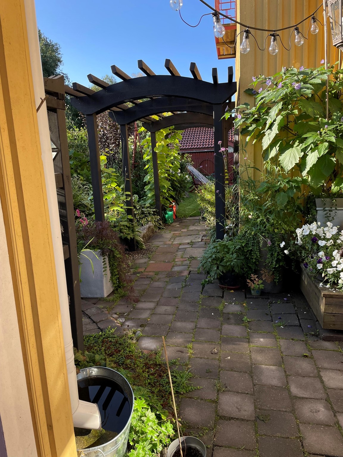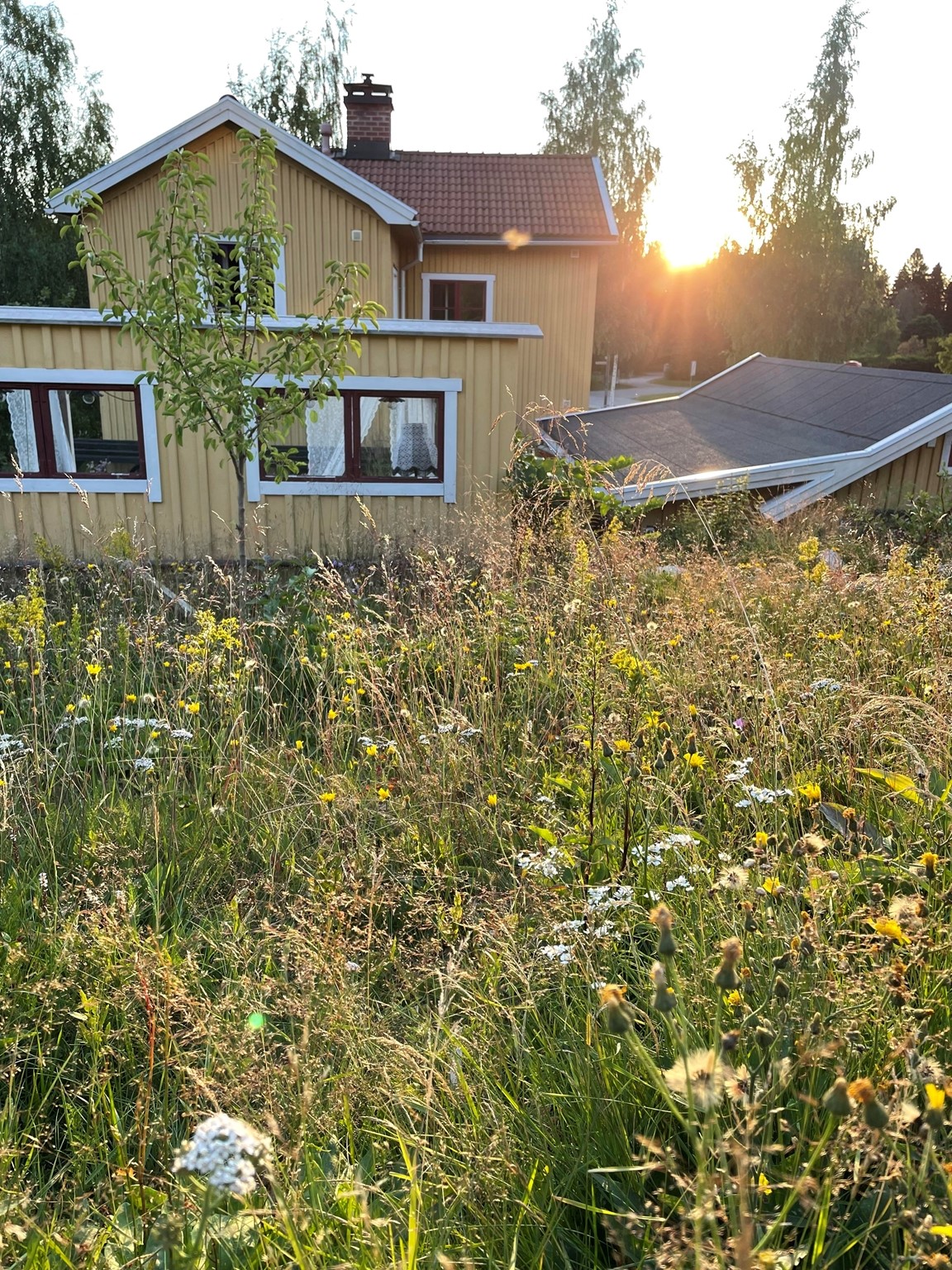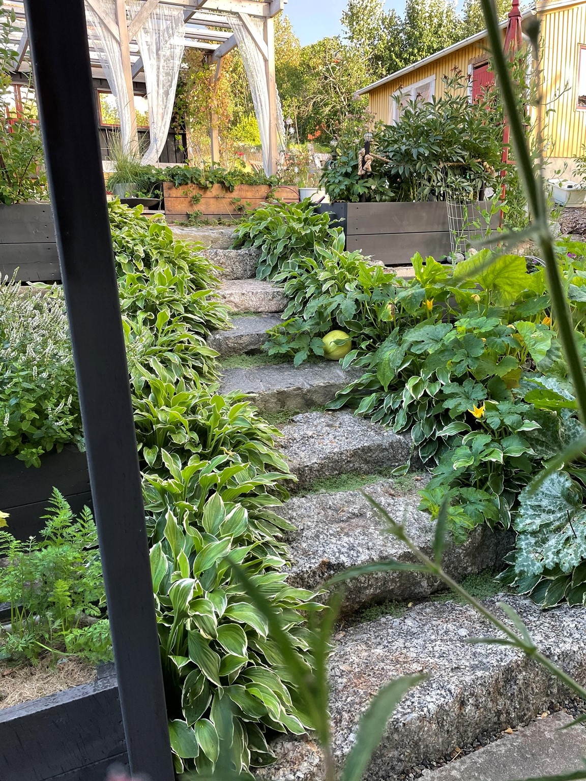 Hus och tomt från 1930-talet. Kuperad morän på Sandbacka. Tomten består av tre tydliga nivåer med olika rumsindelningar. Här finns vilda bär, odlade bär, köksträdgård, fruktträd, perenner, vild äng, rabatter och buskar. Sittplatser som manar till stillhet och reflektion finns också gott om. Trädgården grävdes delvis om 2021 och arbetet blir aldrig klart. Precis som det ska vara i en trädgård...