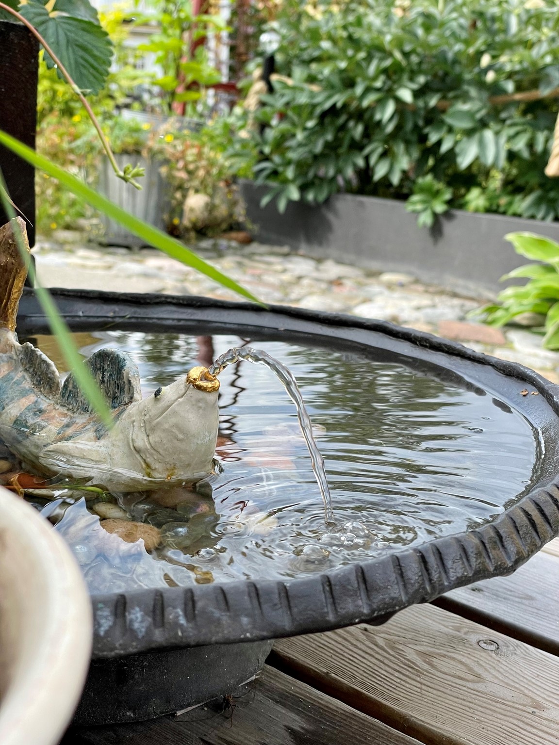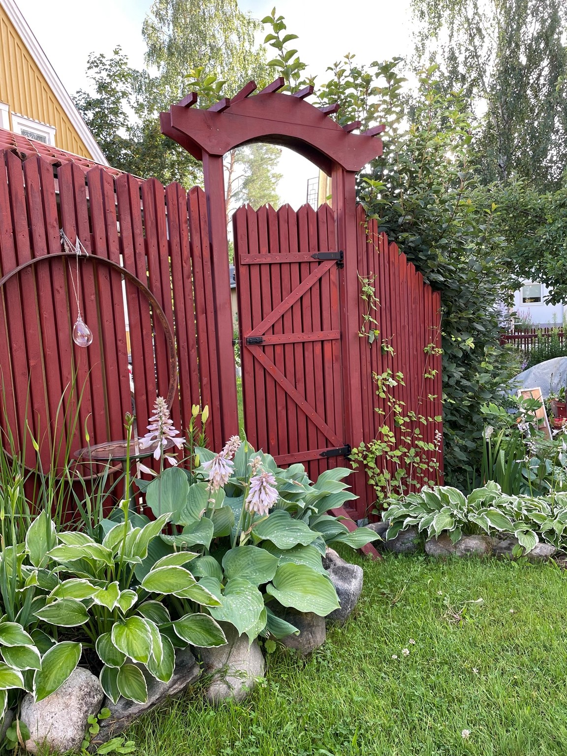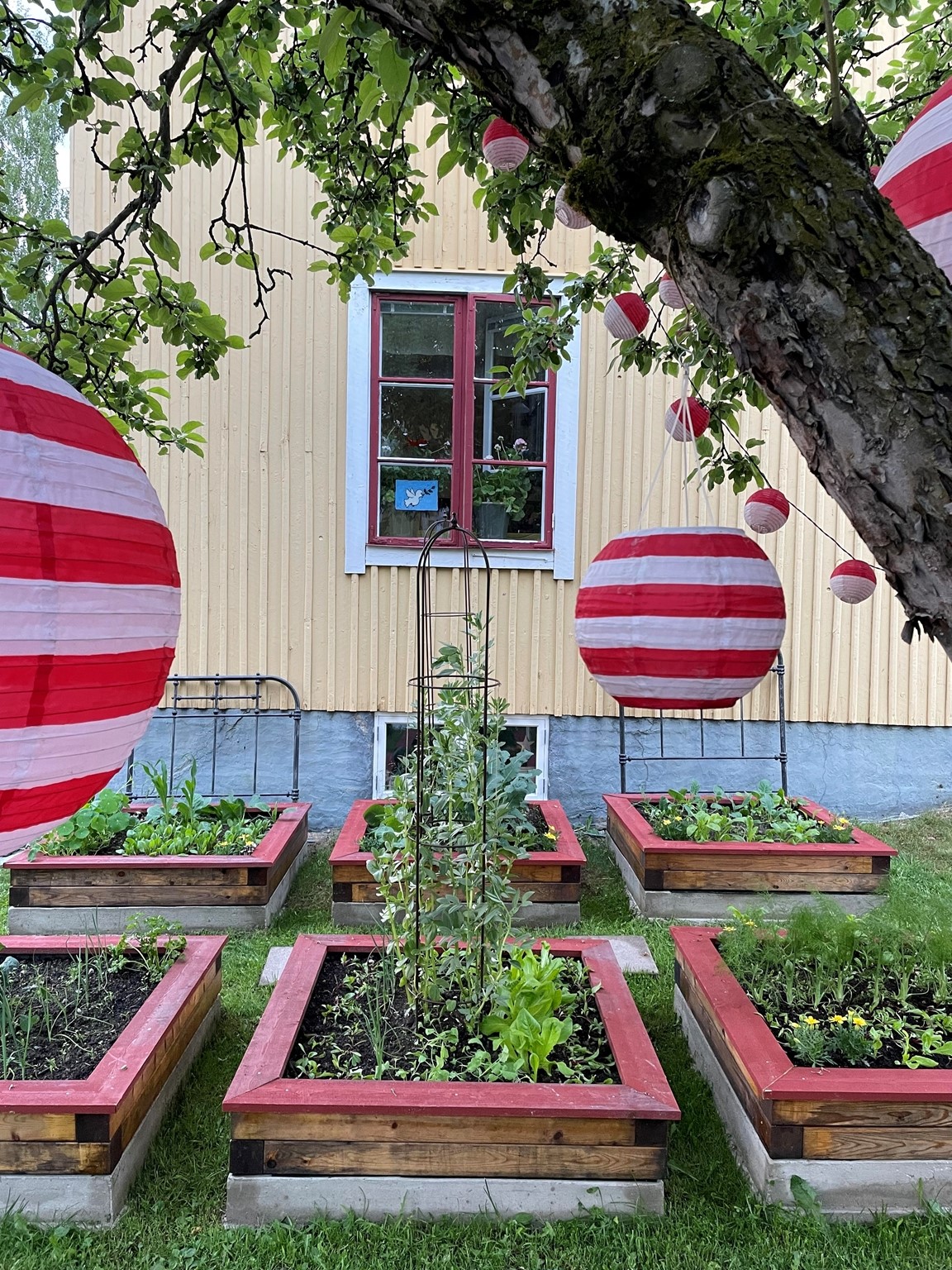 Hus och tomt från 1930-talet. Kuperad morän på Sandbacka. Tomten består av tre tydliga nivåer med olika rumsindelningar. Här finns vilda bär, odlade bär, köksträdgård, fruktträd, perenner, vild äng, rabatter och buskar. Sittplatser som manar till stillhet och reflektion finns också gott om. Trädgården grävdes delvis om 2021 och arbetet blir aldrig klart. Precis som det ska vara i en trädgård...