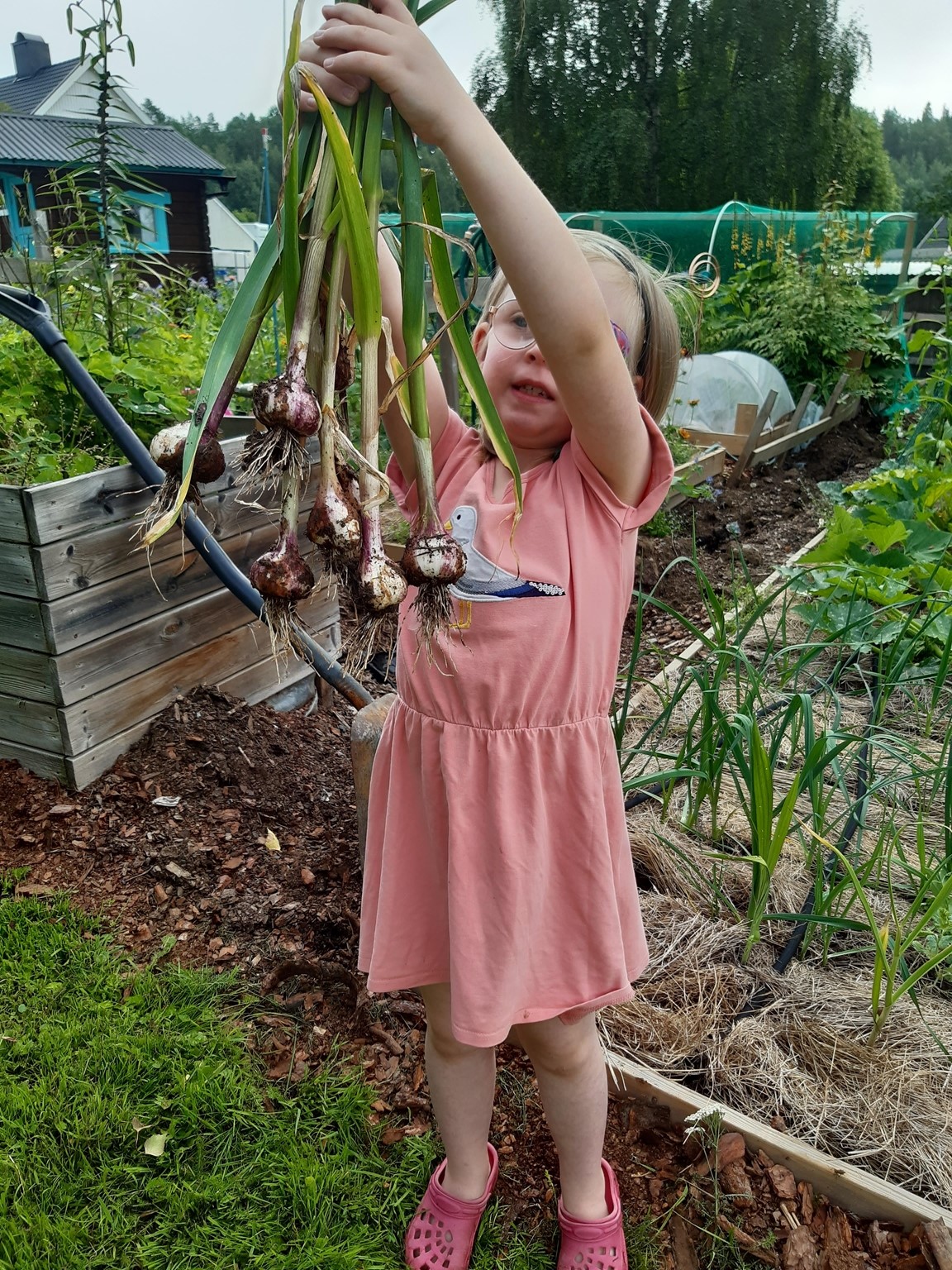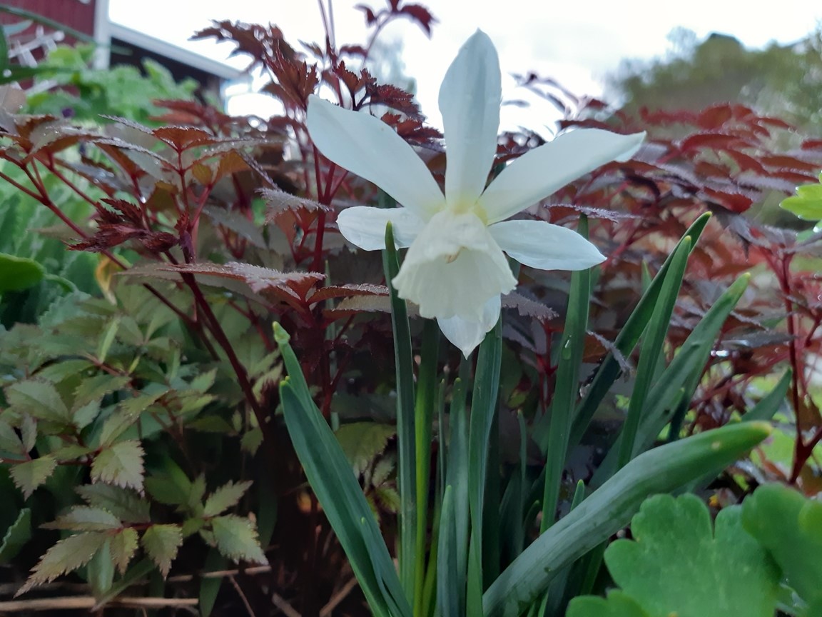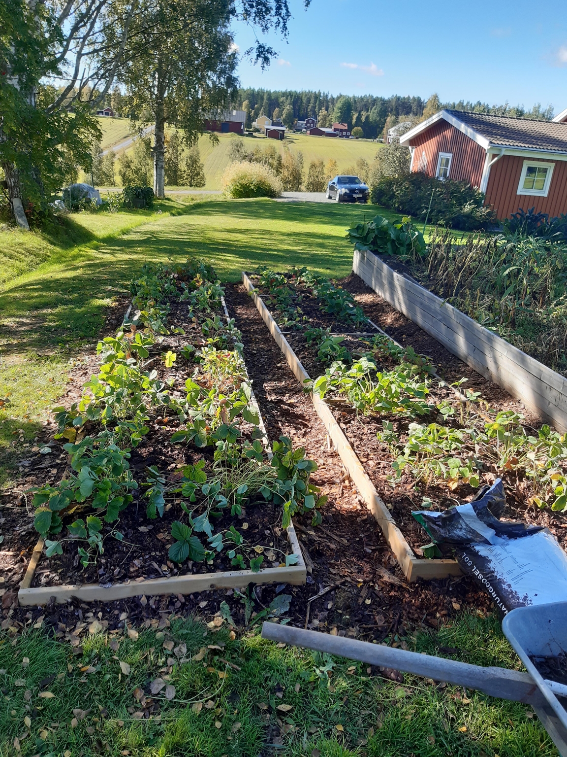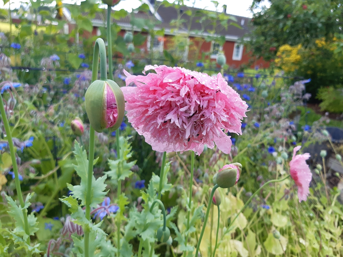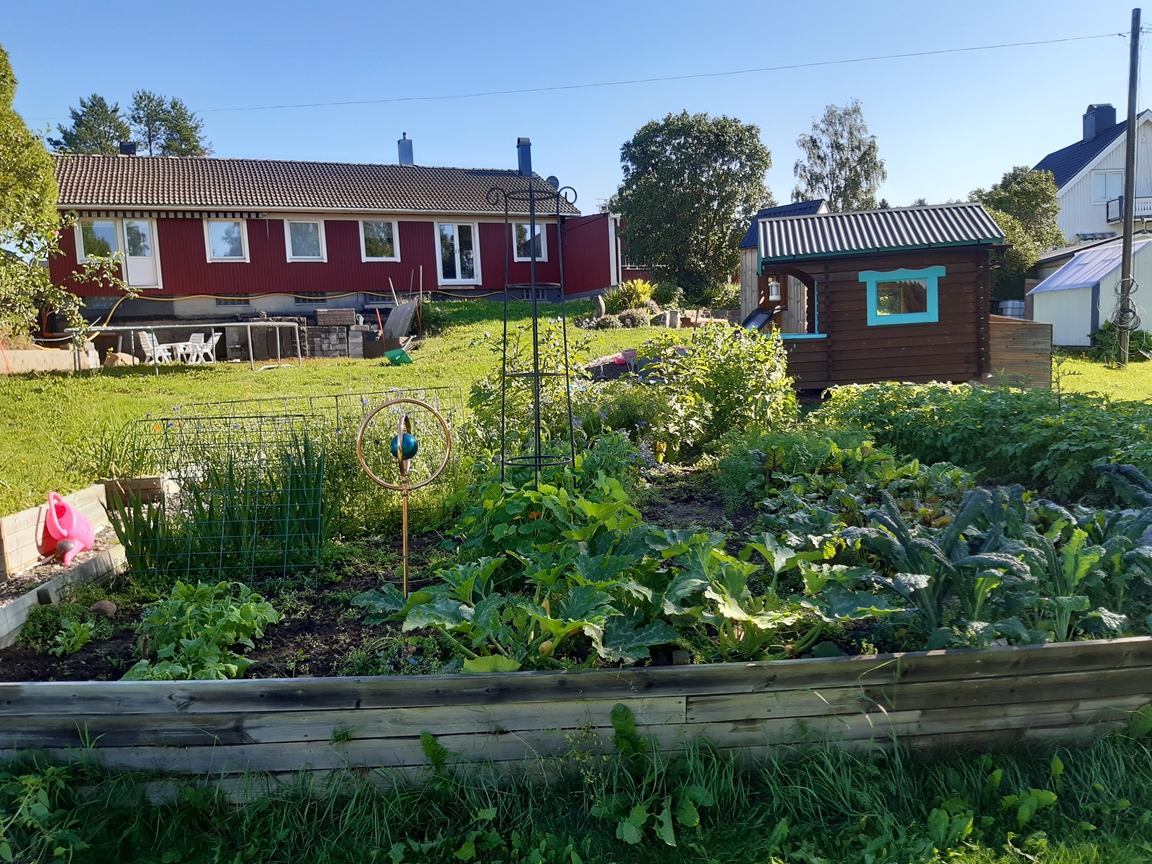 Vi har bott i vårt hus med vår trädgård i drygt 16 år och mycket har förändrats sedan vi flyttade hit. Då fanns ett antal träd och buskar utplacerade här och var tillsammans med ett par rabatter och lite jordgubbar. Nu finns här ett trädgårdsland som vi för ett par år sedan började dela upp i långa lådor för att undvika att trampa ihop vår leriga jord, en liten hallonhäck, ett jordgubbsland, en lekstuga omgiven av smultron, en grillplats delvis omgiven av en låg mur med rabatt ovanför, ett växthus på 20 m² som vi byggde 2021. Vi tycker om både sådant som är vackert och sådant som går att äta och har därför både utökat rabatter, gjort bäddar för sommarblommor till buketter och planterat päron- och plommonträd.