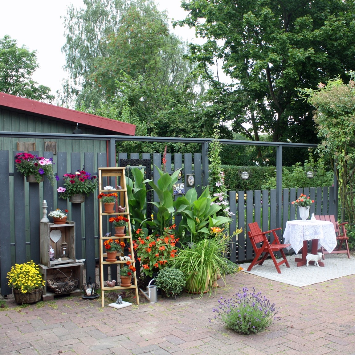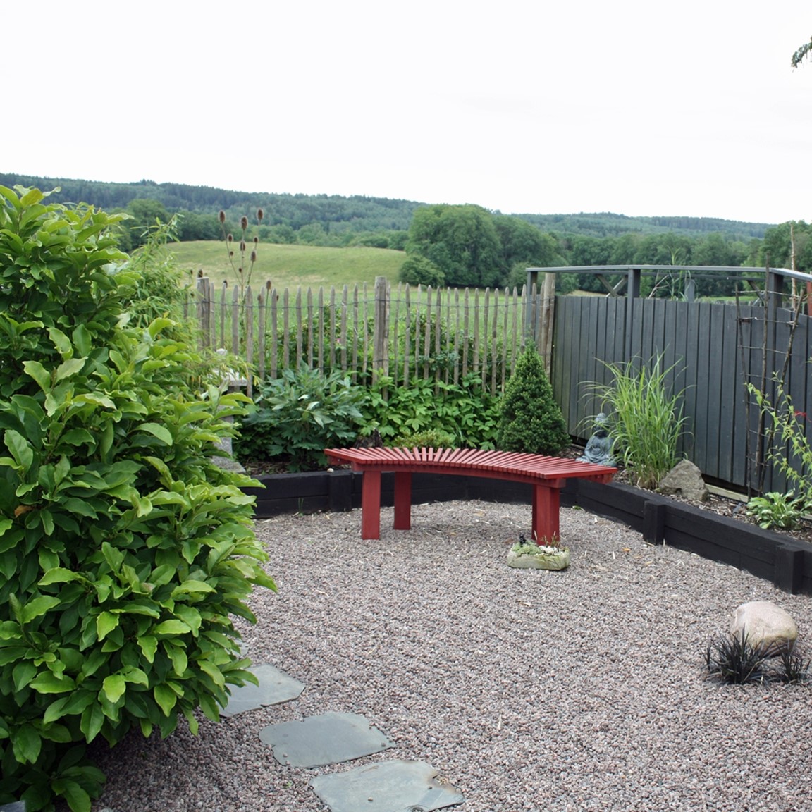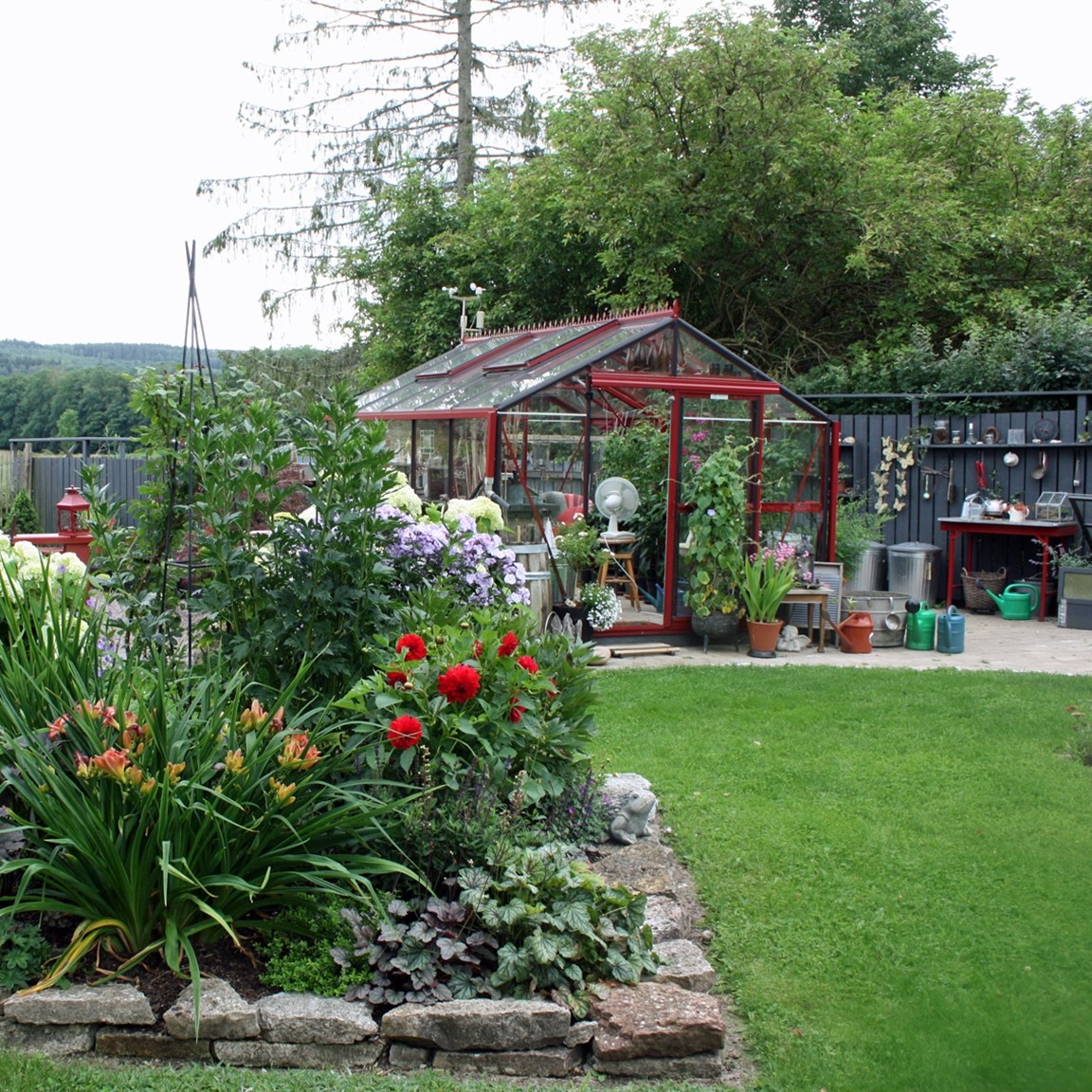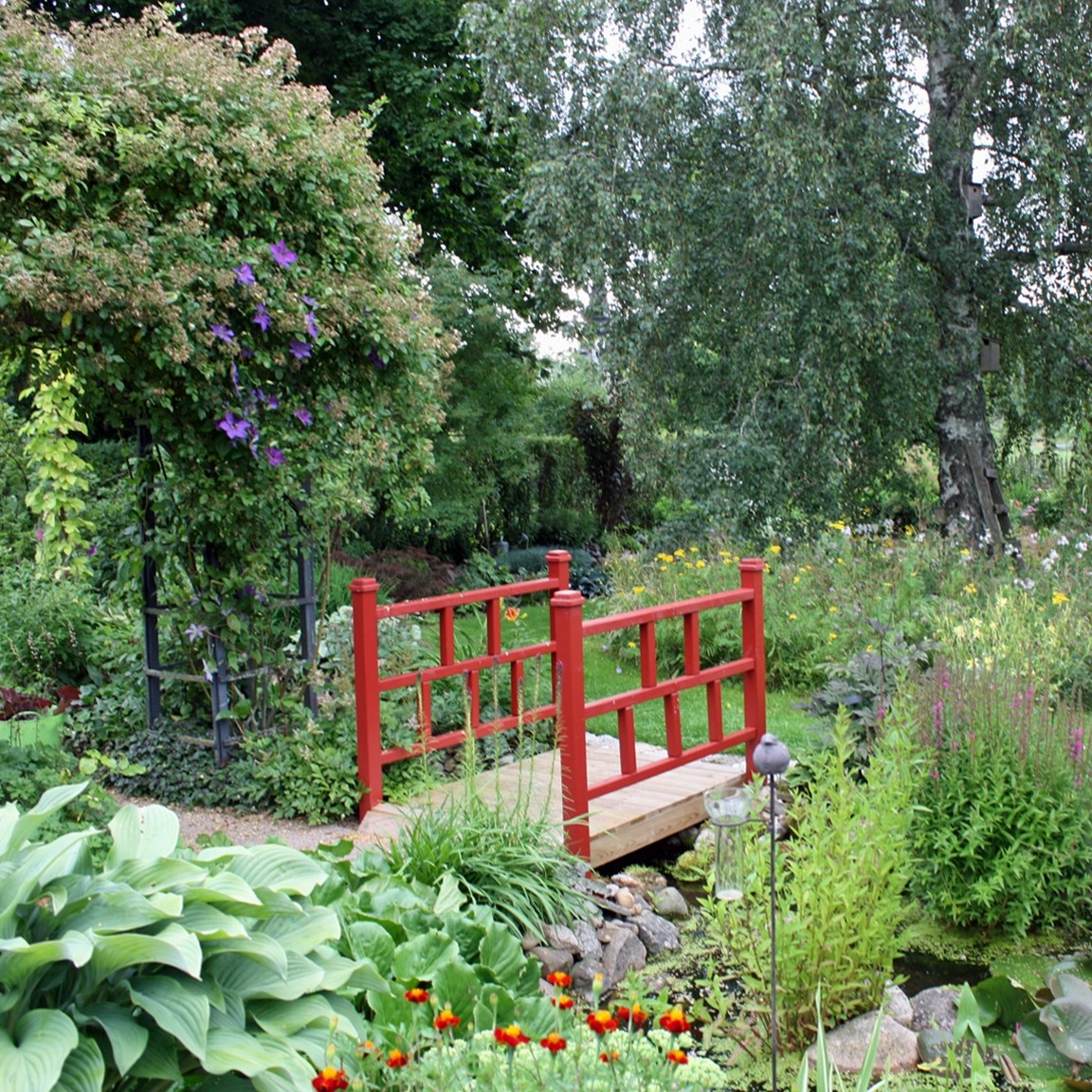 Vi har förvandlat vår tomt till en trädgård där både människor och djur trivs. Med utsikt mot Varnhems klosterkyrka finns här två dammar och en liten bäck (allt framgrävt för hand) omgivna av frodiga rabatter. Här finns också en liten äng, ett växthus, en japaninspirerad del samt flera sittplatser. Ett flertal egentillverkade växtstöd, portaler och torn för rosor och klematis pryder sin plats. Nya projekt är ständigt på gång och gräsmattan krymper lite varje år. Välkomna hälsar Catarina och Roland