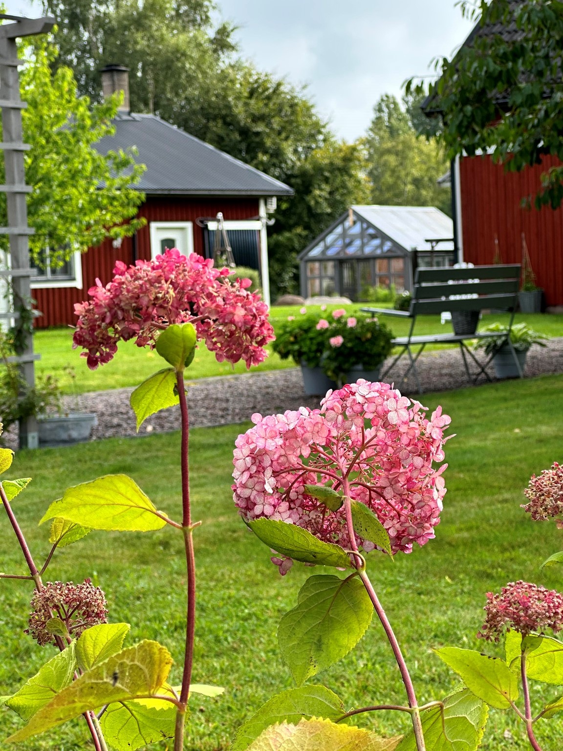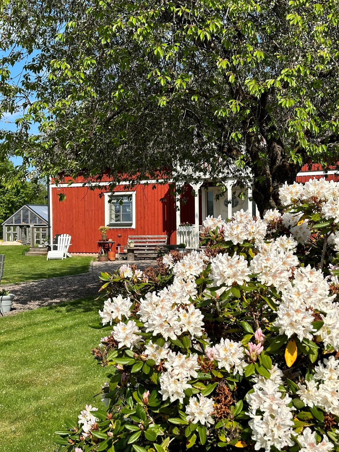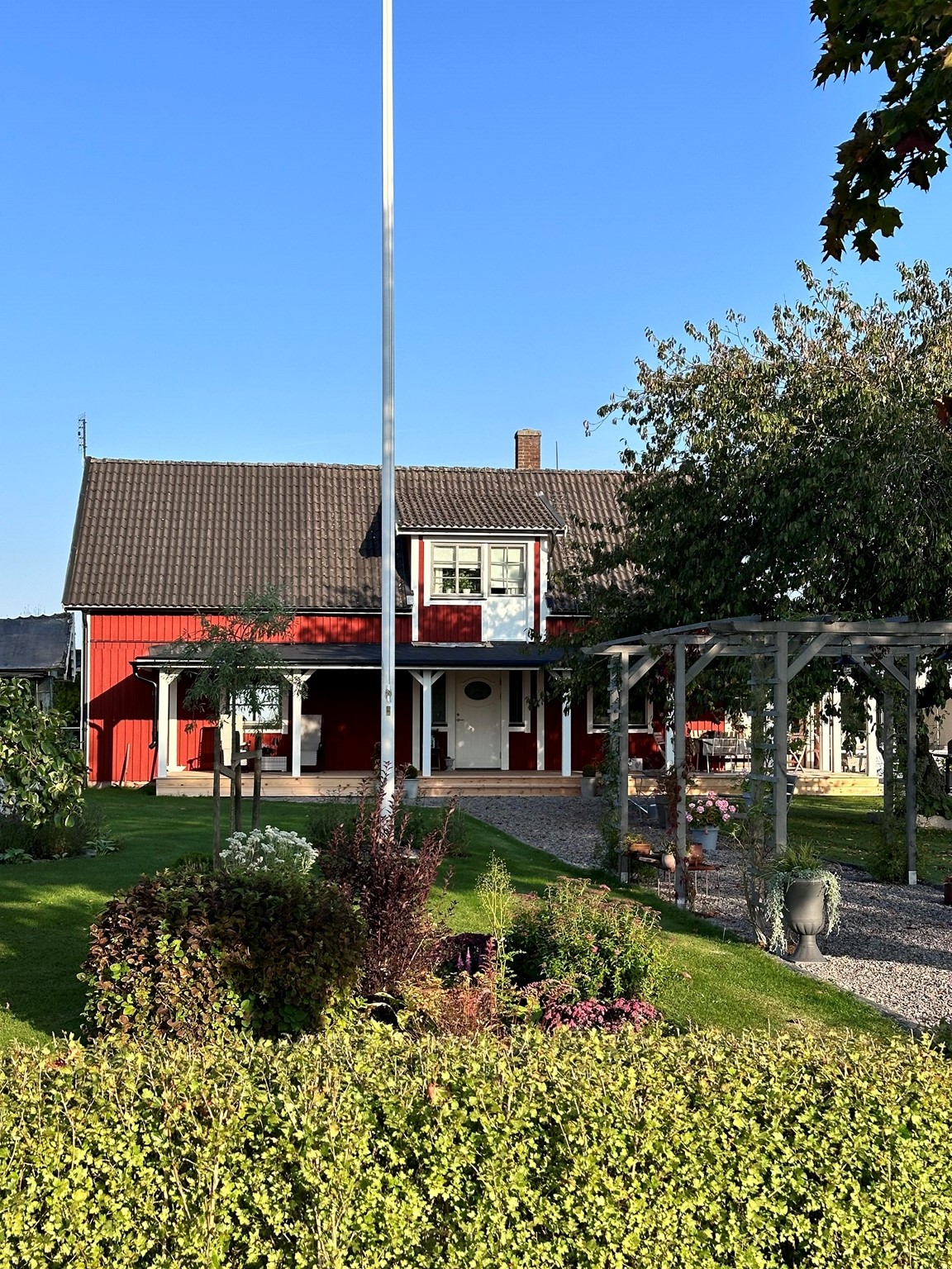 Året -24 byggde vi till en stor veranda på huset så därav olika bilder på huset.