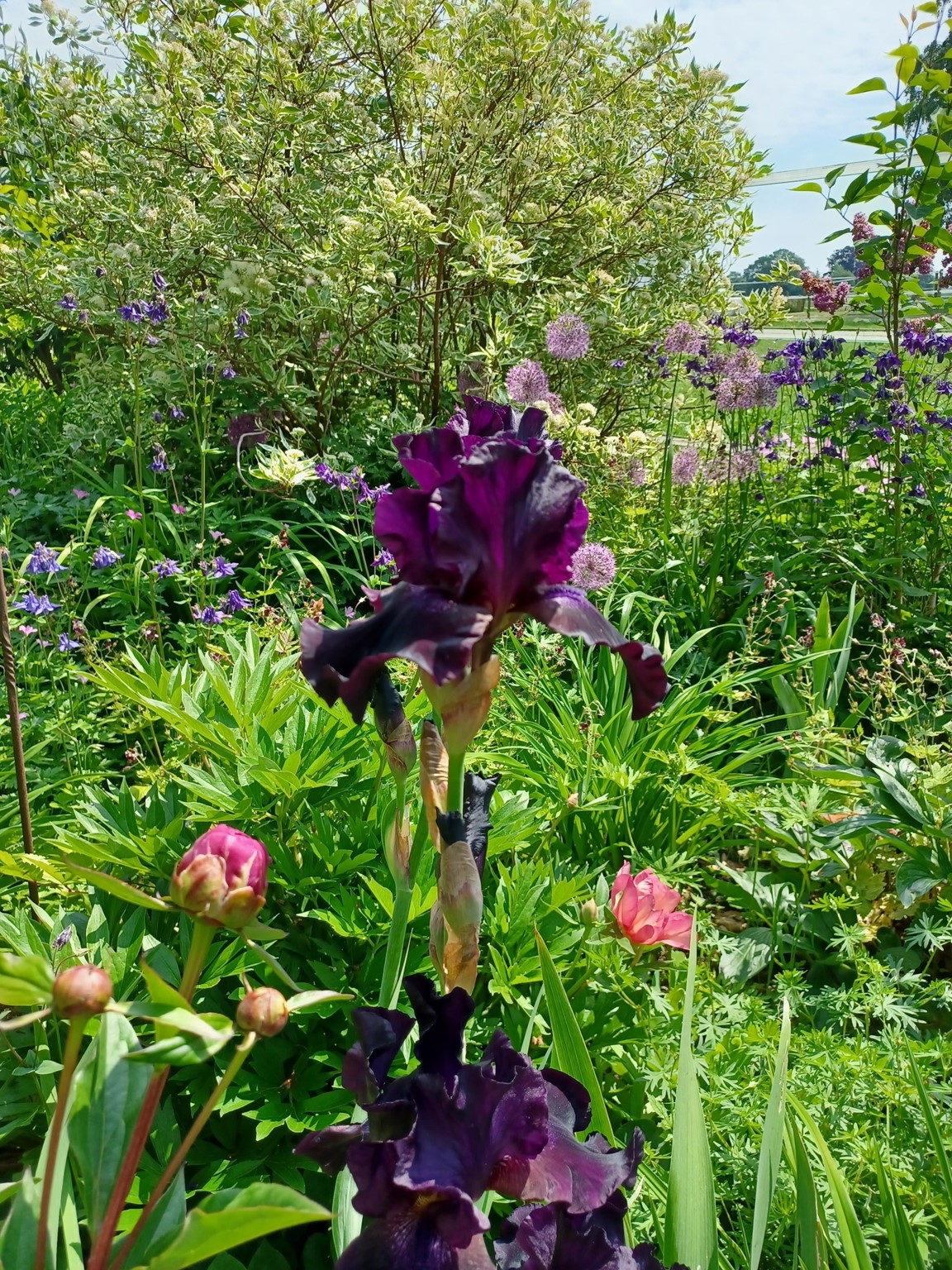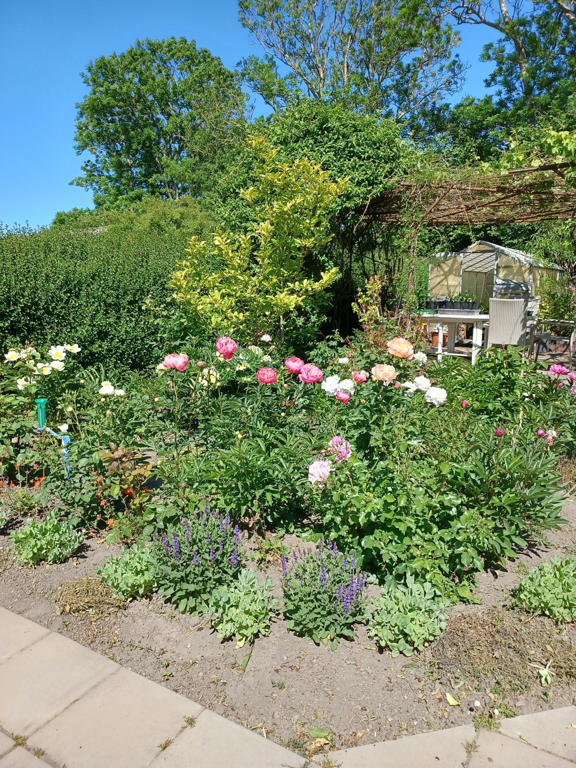 En trädgård i ständig förändring, från pioner till rosor och funkior och massa irisar....En stor fantastisk blodbok som ger skugga, att stå under och titta upp ger en härlig känsla.