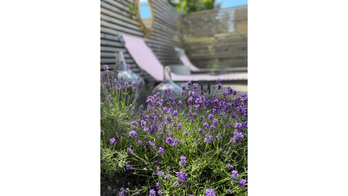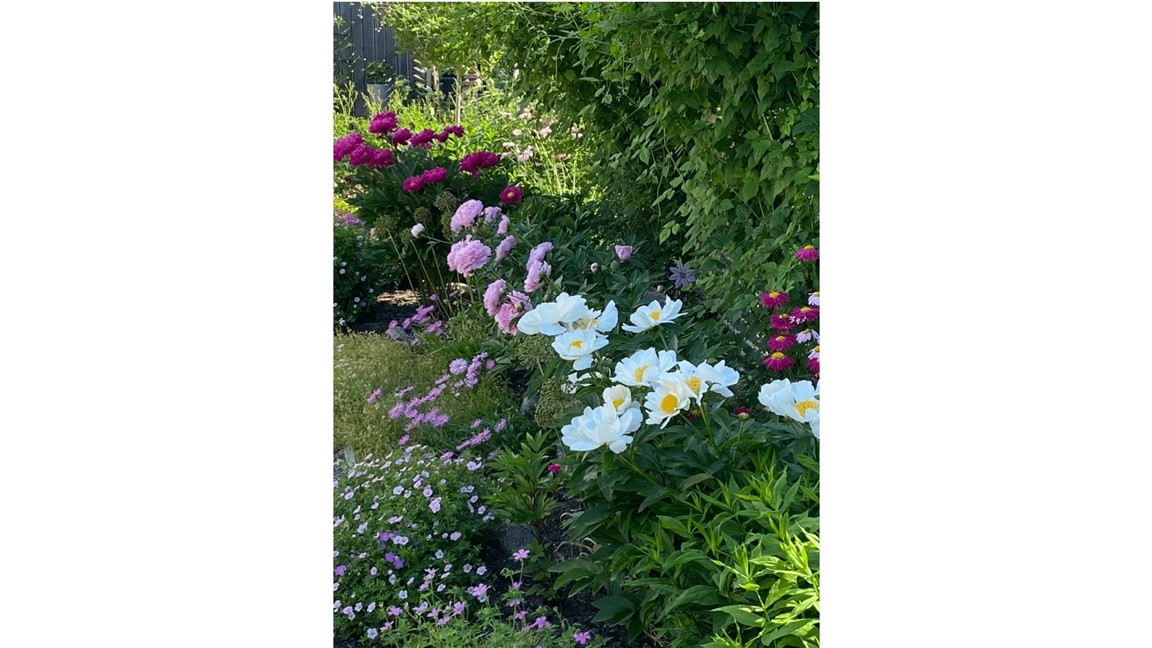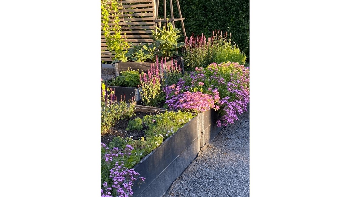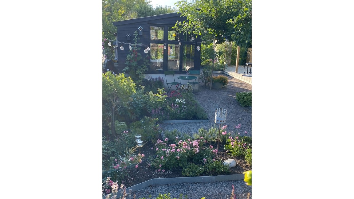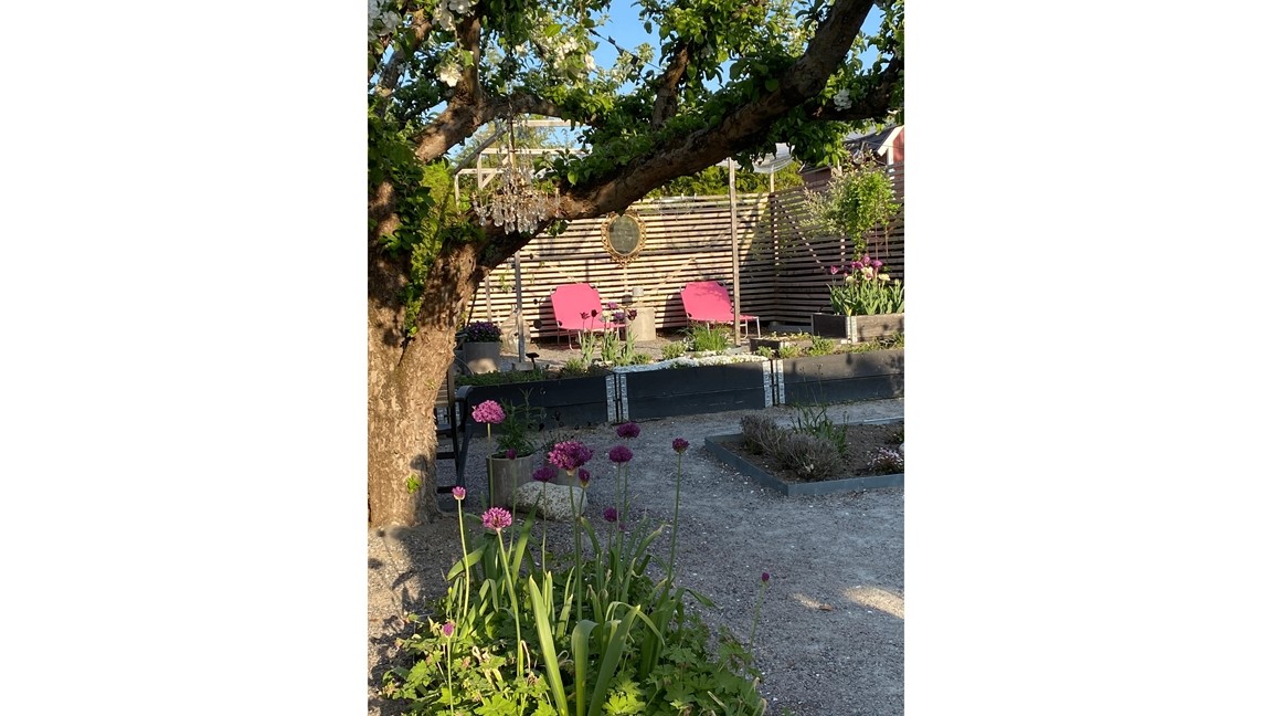 I stället för gräs har vi valt grus som grund med mycket perenner (i färgerna rosa, lila och vitt), sommarblommor i krukor och uppstammade småträd. Spaljéer och trädgårdsbar.