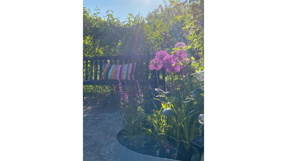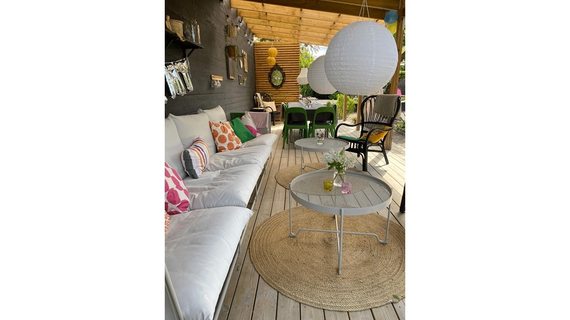 Trädgården är inredd som flera rum med gott om sittplatser.